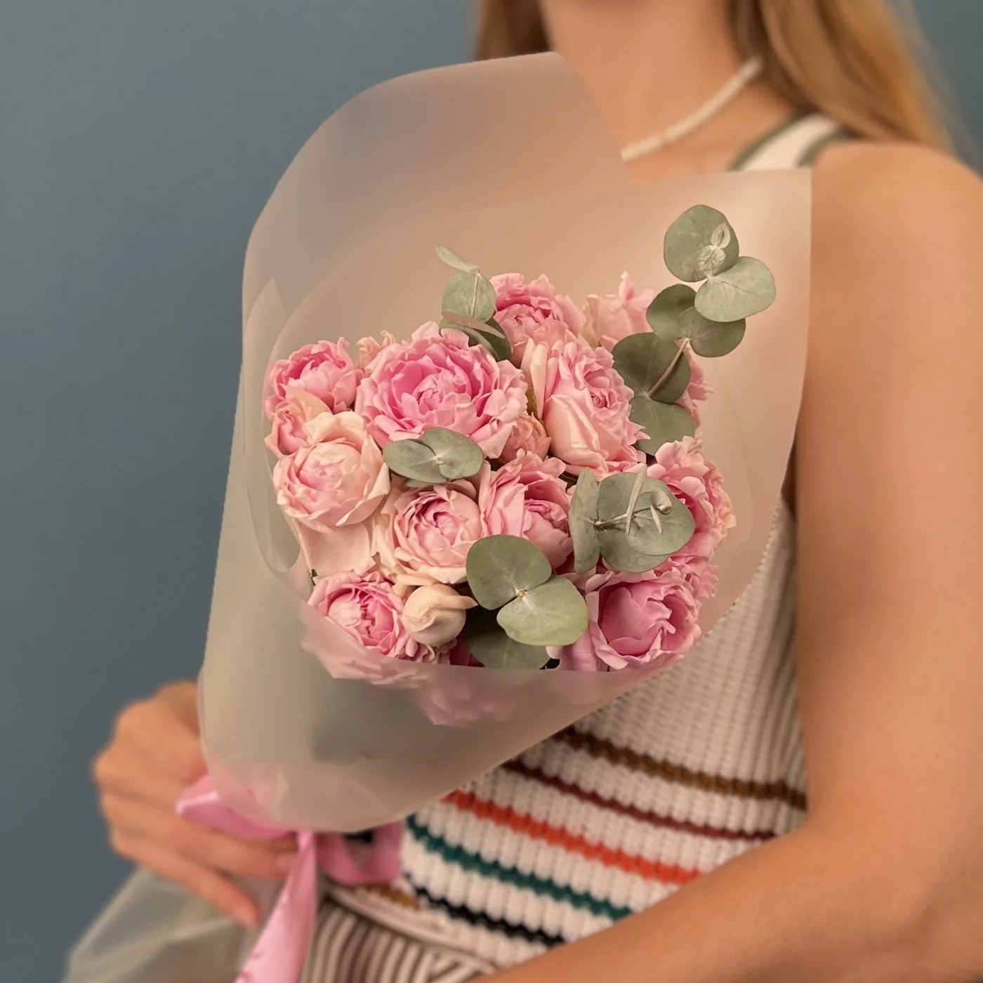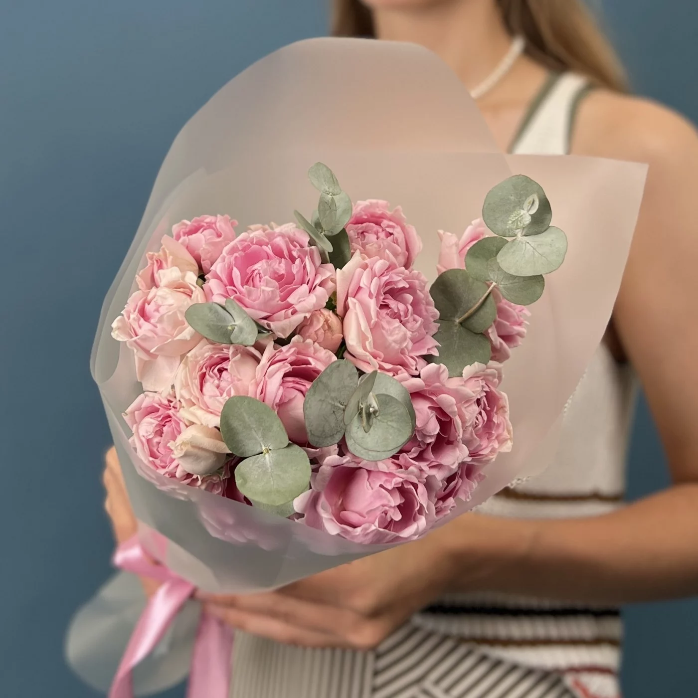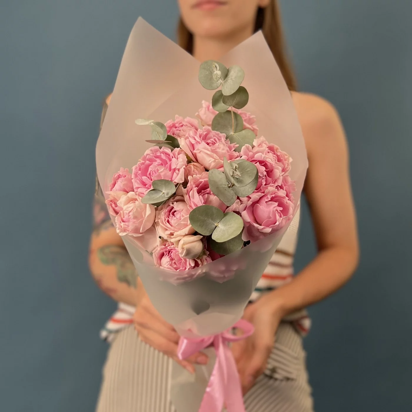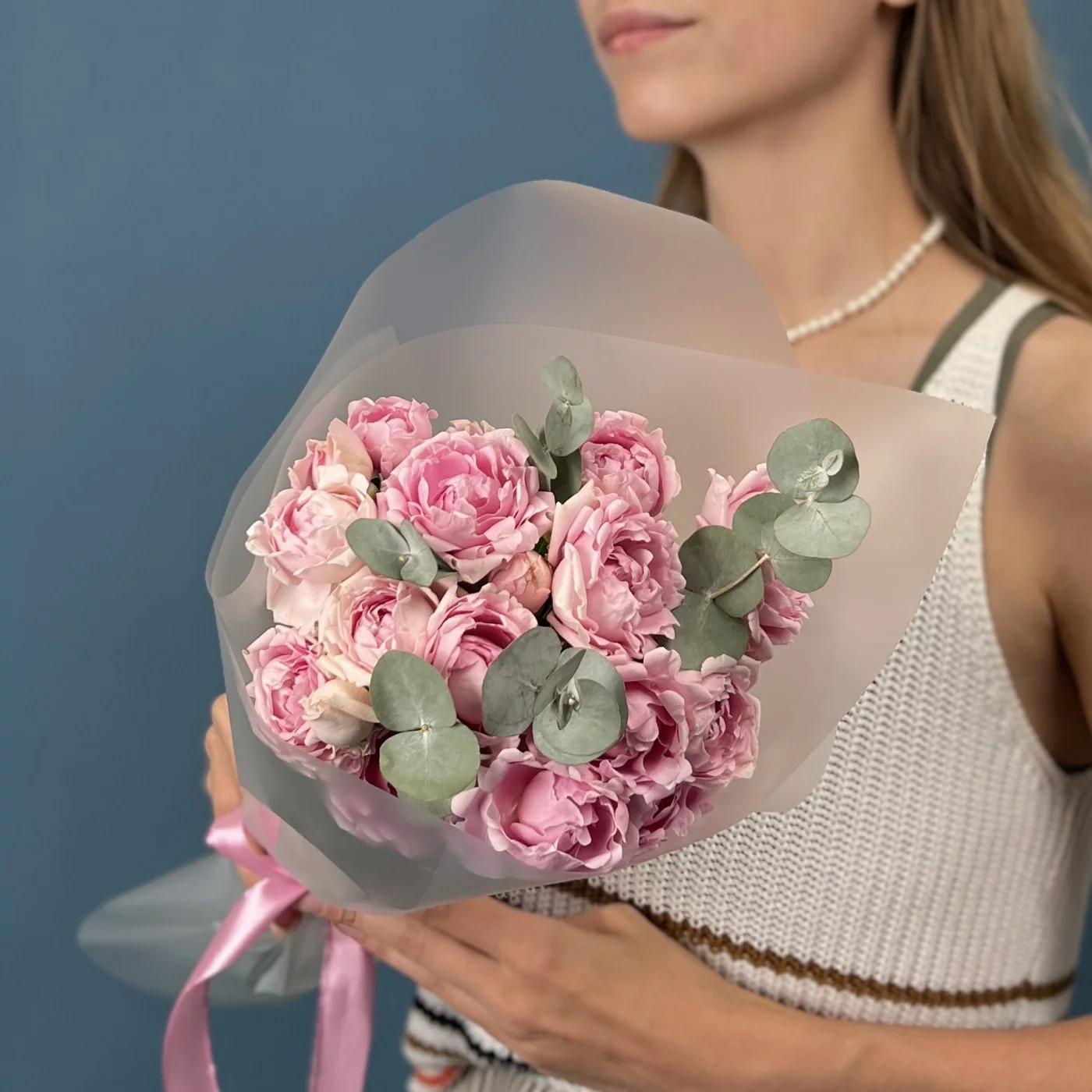 Букет из 5 кустовых пионовидных роз сорта Кэнди Флоу длиной 40 см — это нежное и изысканное сочетание утончённой красоты и мягкой романтики.