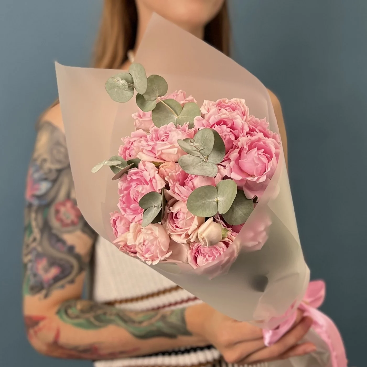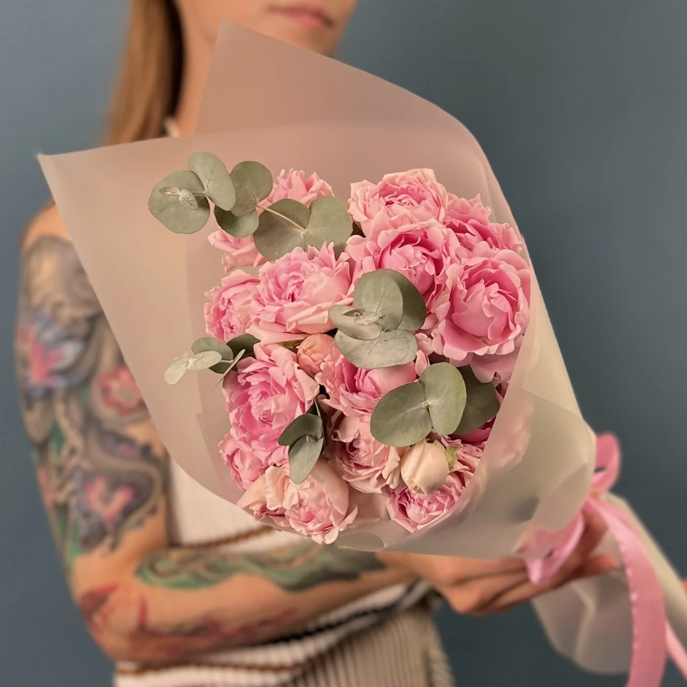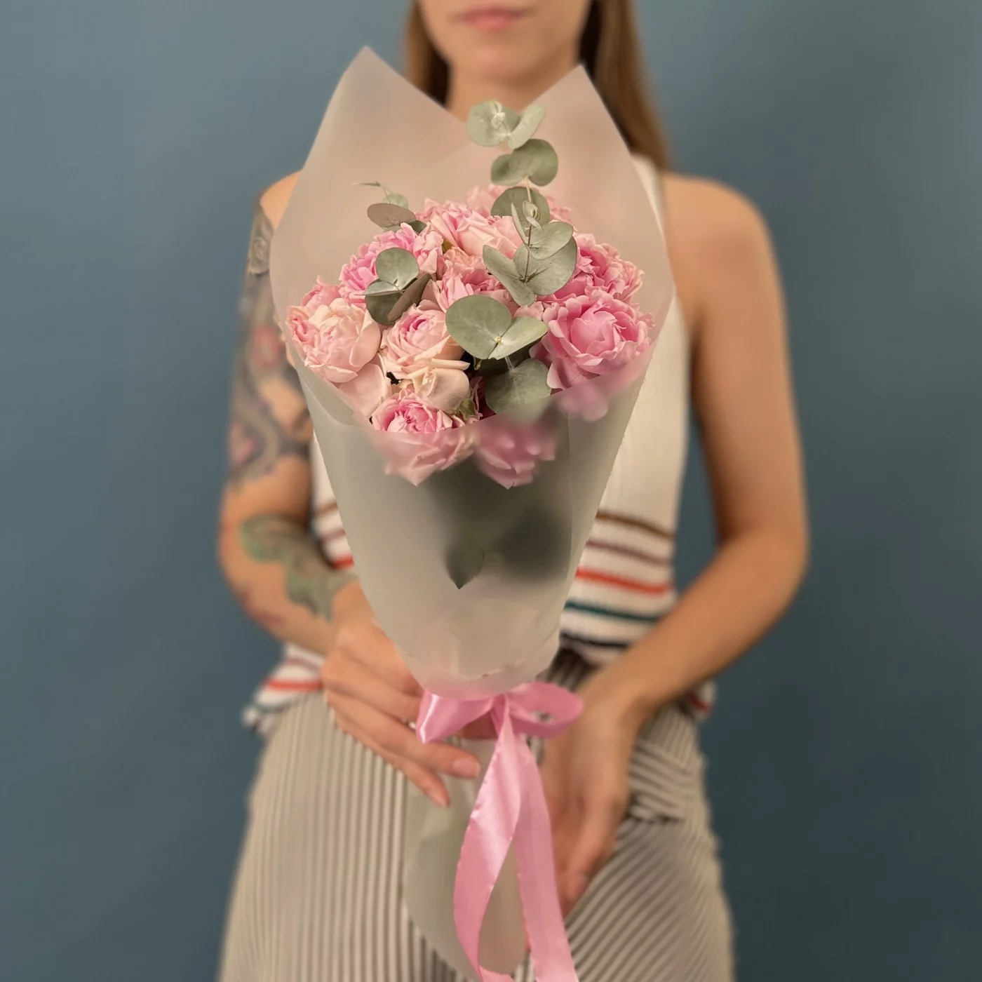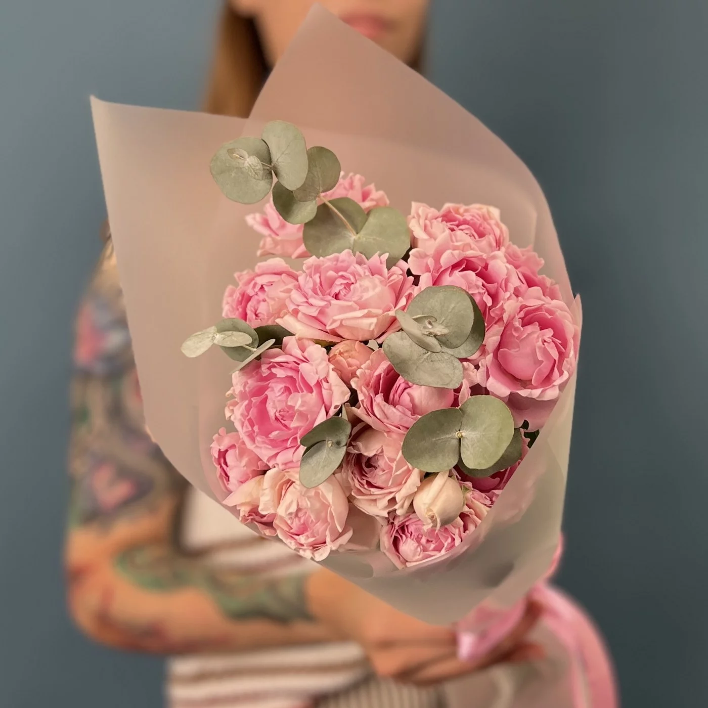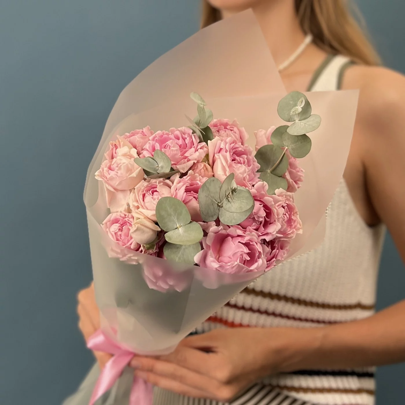 Букет из 5 кустовых пионовидных роз сорта Кэнди Флоу длиной 40 см — это нежное и изысканное сочетание утончённой красоты и мягкой романтики.