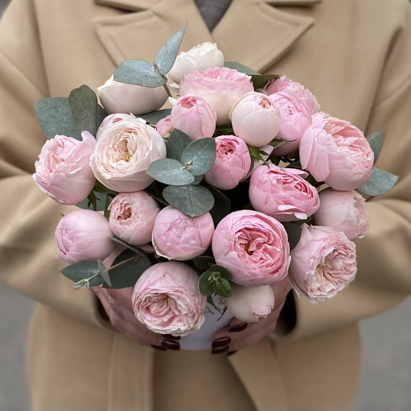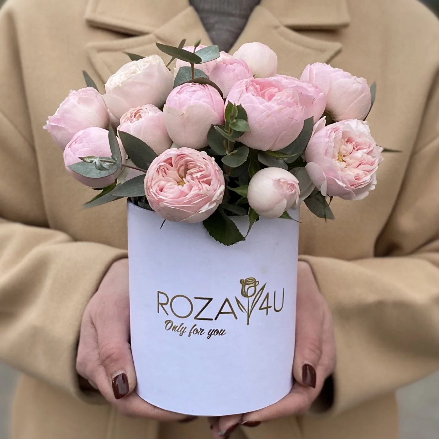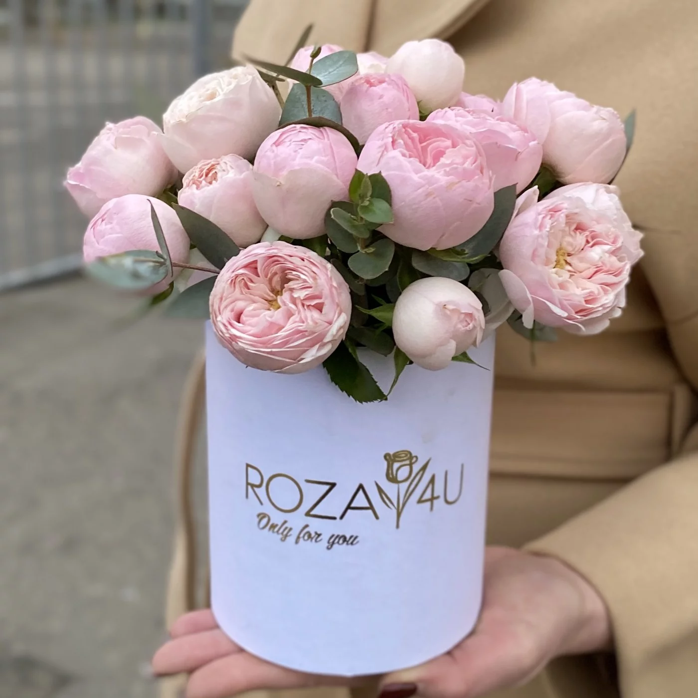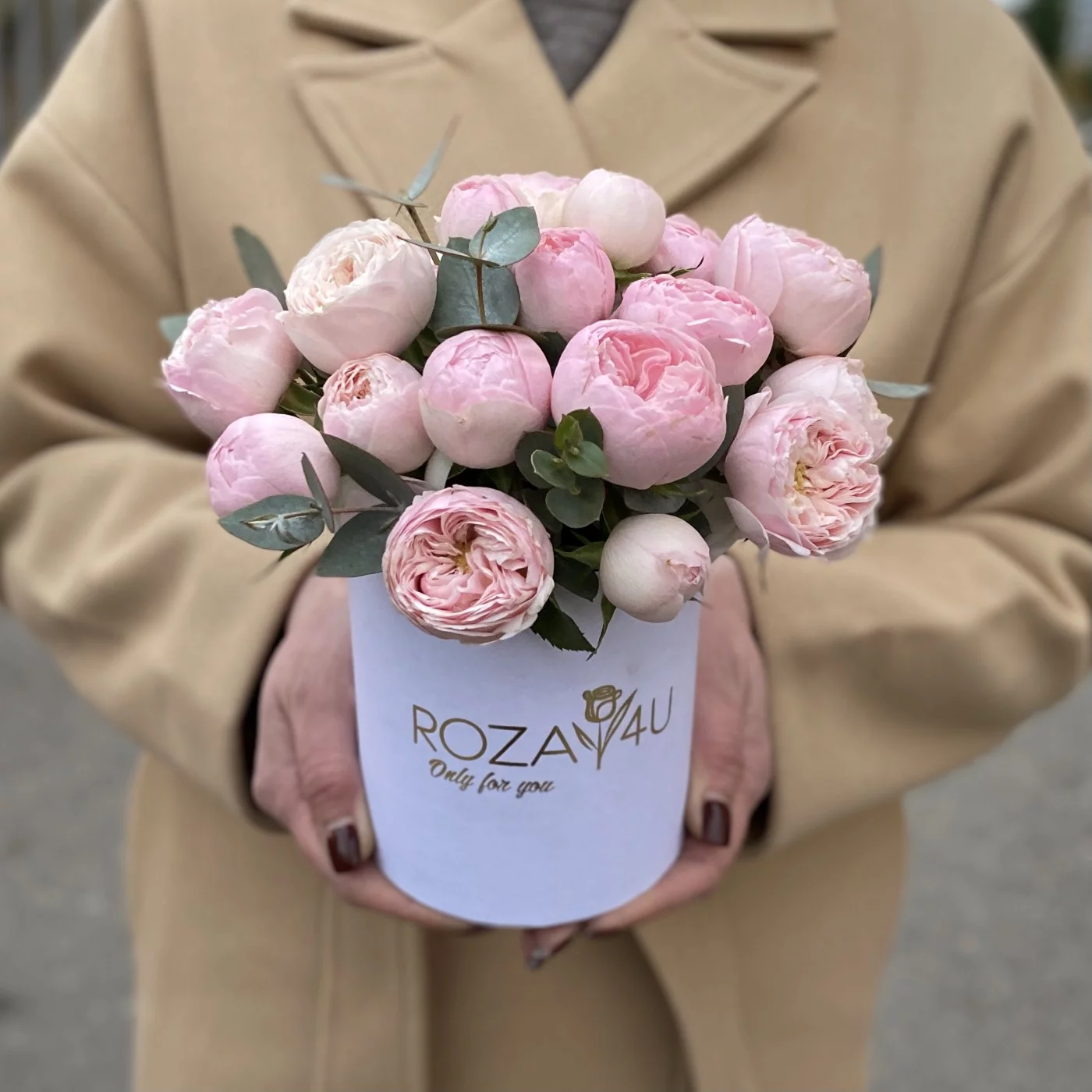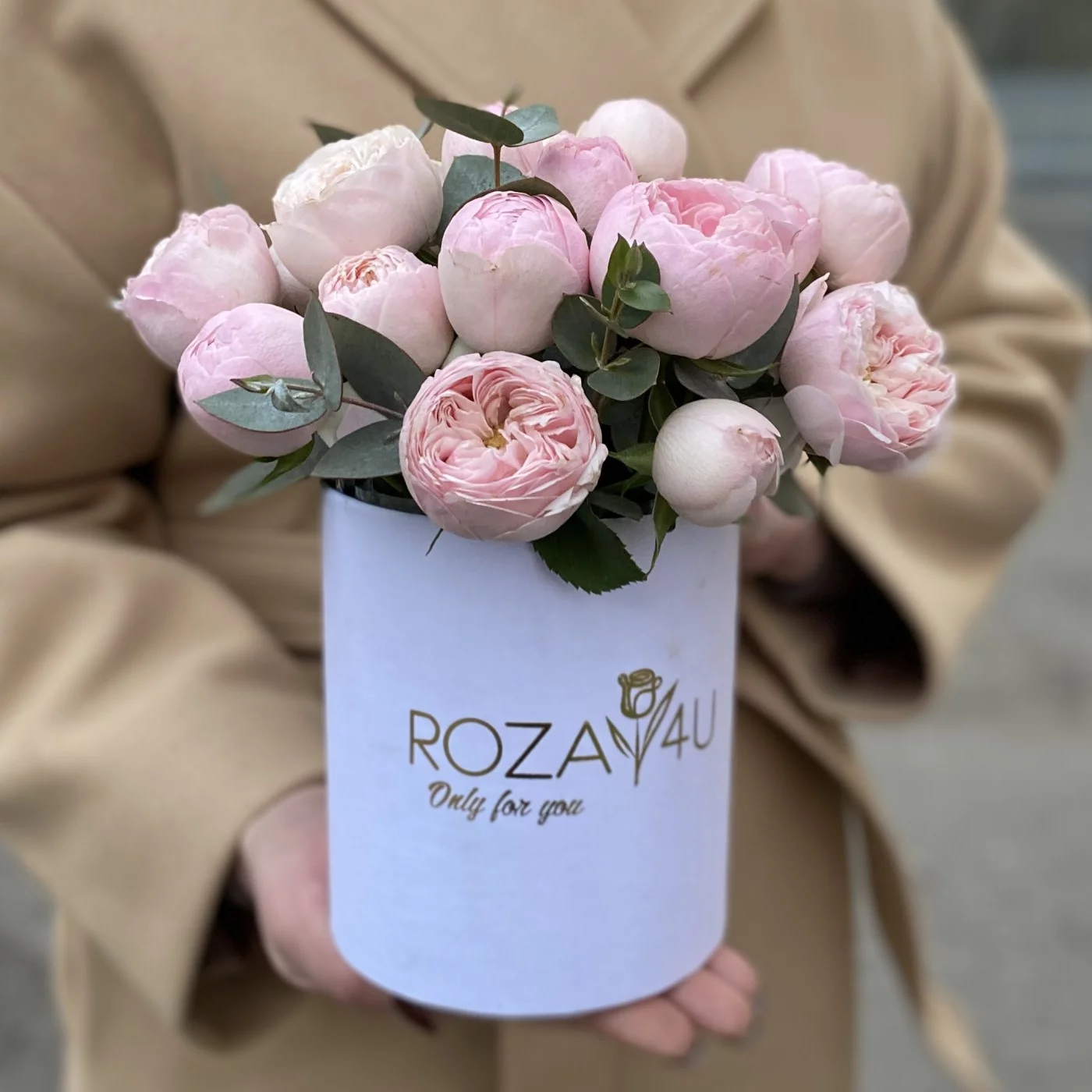 Кустовые пионовидные розы Мансфилд Парк с эвкалиптом в шляпной коробке подойдут в качестве идеального подарка на День Рождения.