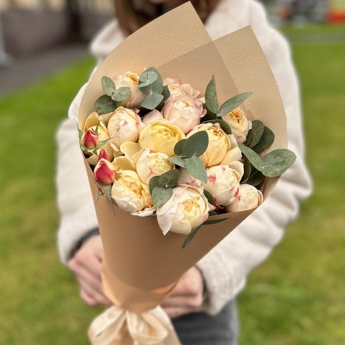Букет из 5 веток кустовых пионовидных роз сорта Принцесса Суки с ароматным эвкалиптом в стильной упаковке.