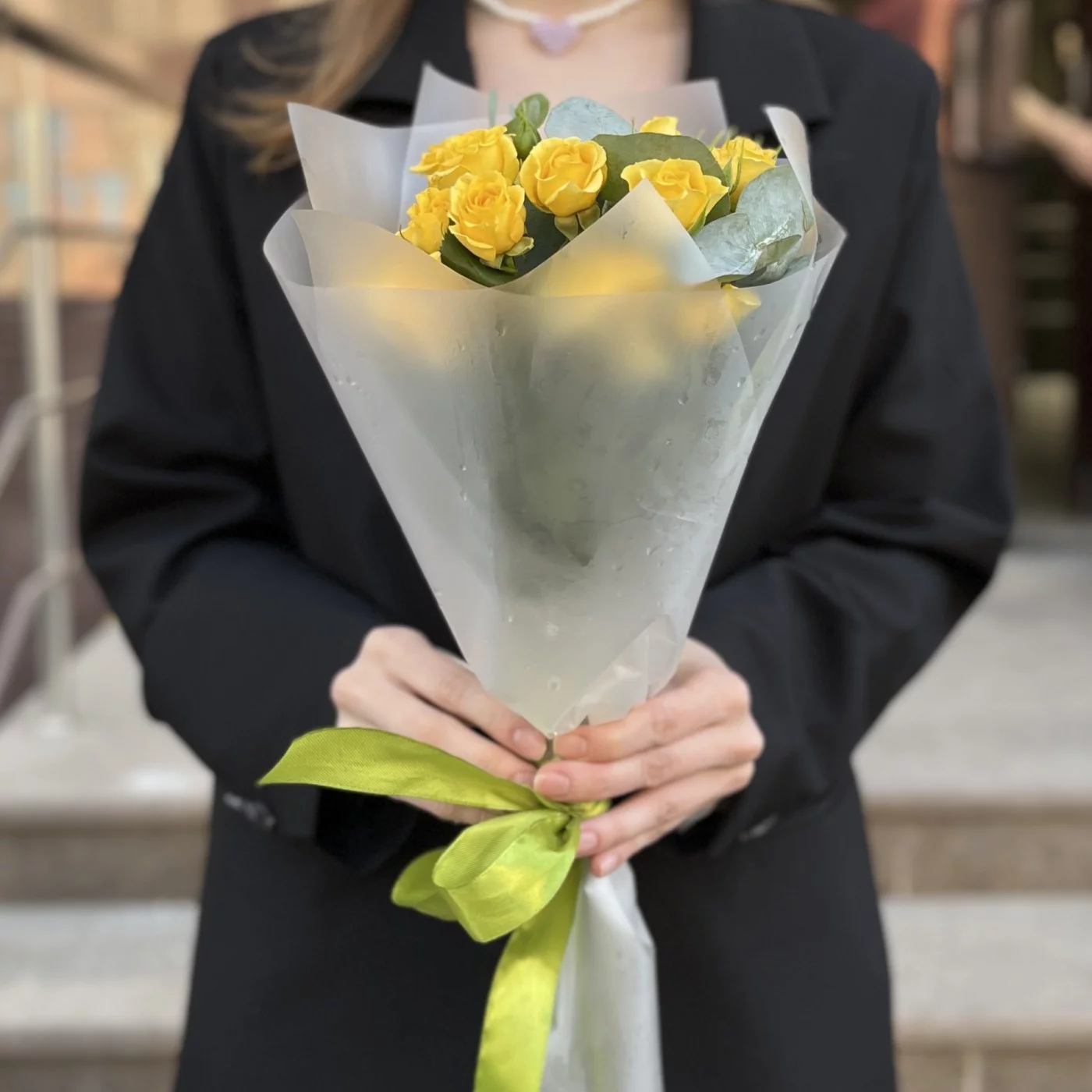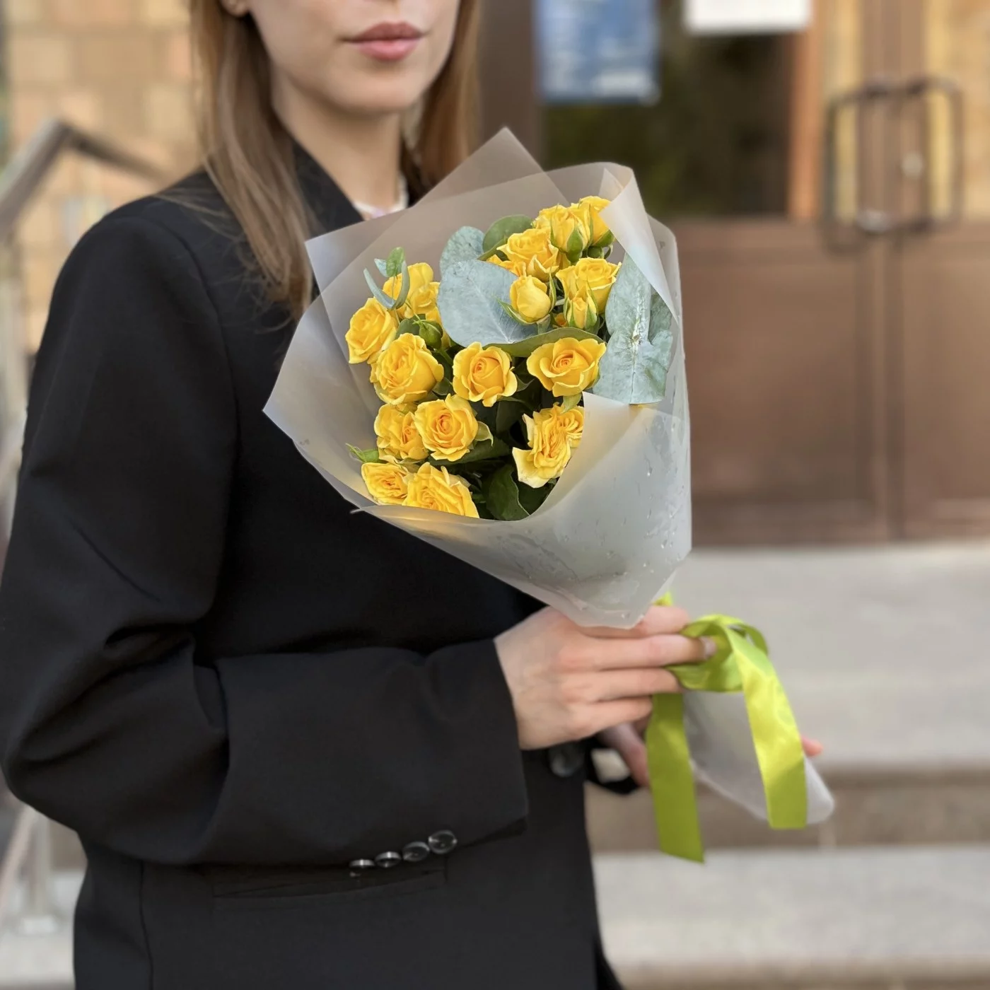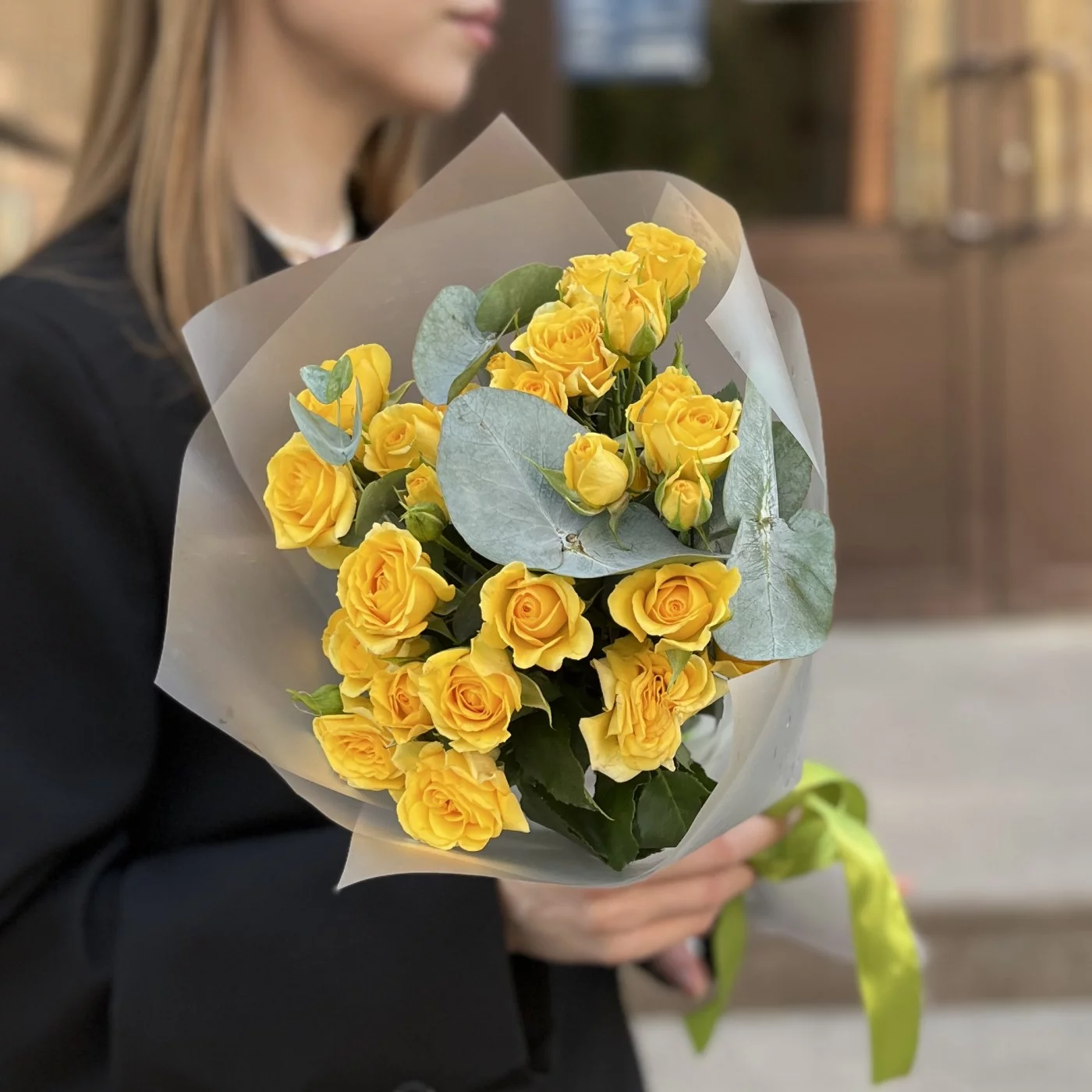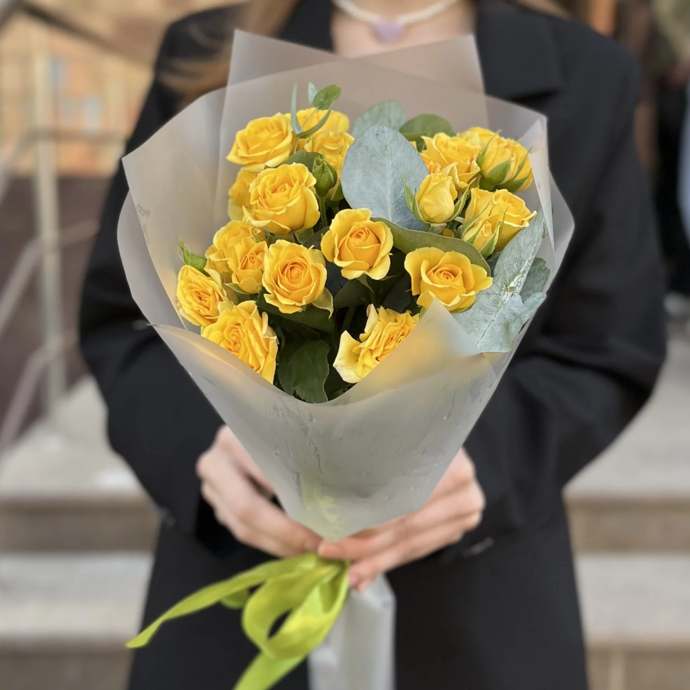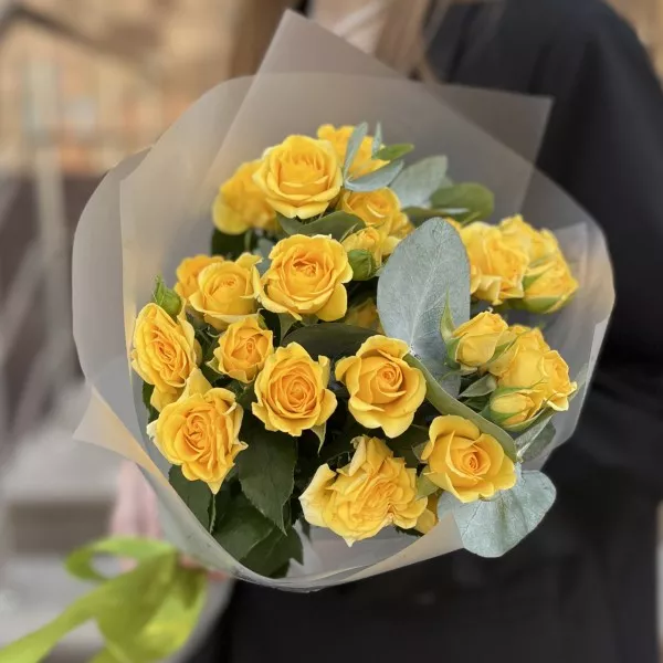 Этот очаровательный букет состоит из 5 кустовых роз сорта Еллоу Бэйби, которые радуют глаз своим ярким и солнечным желтым цветом. Каждая роза обладает пышными, многослойными бутонами, которые раскрываются в нежные цветы, излучающие тепло и позитив.