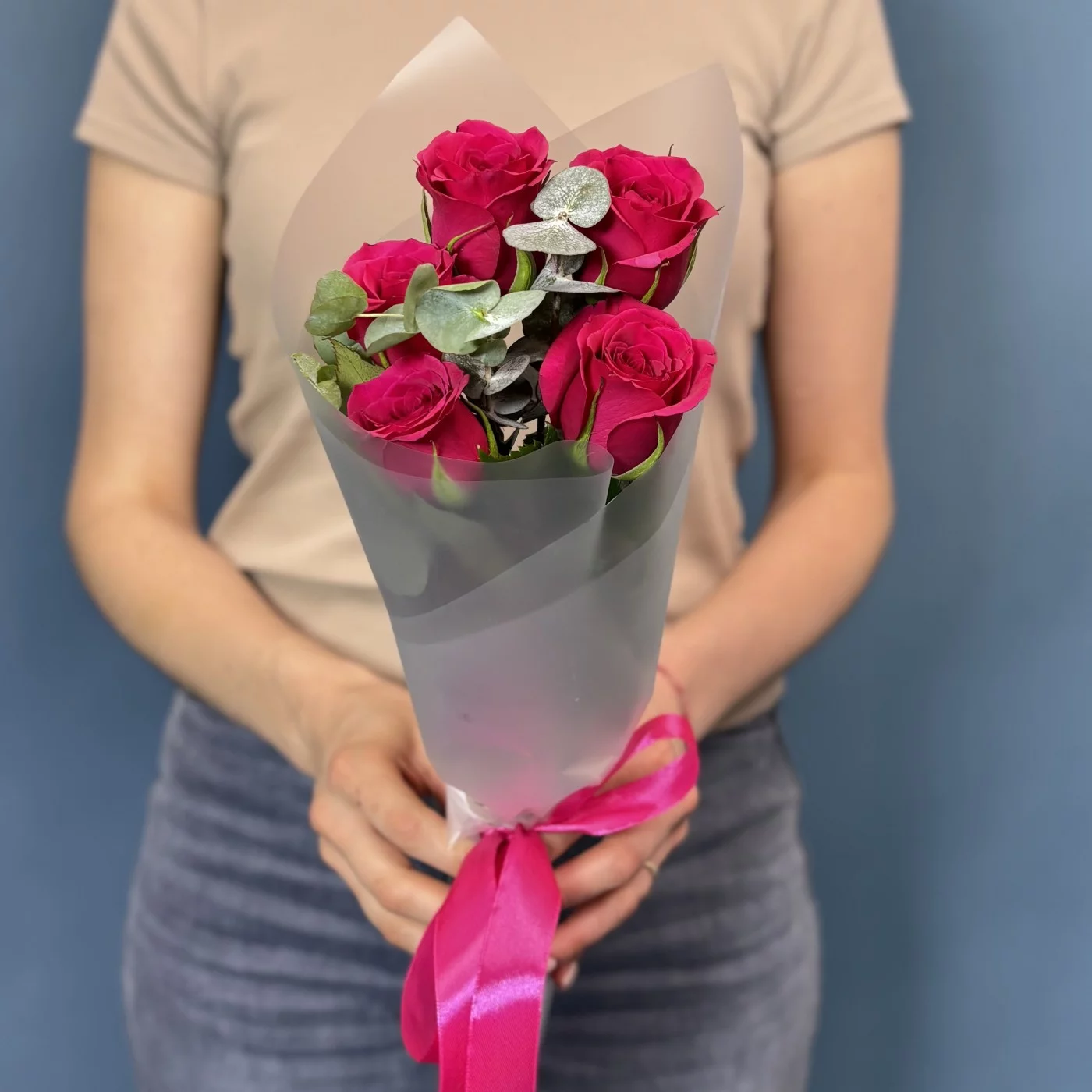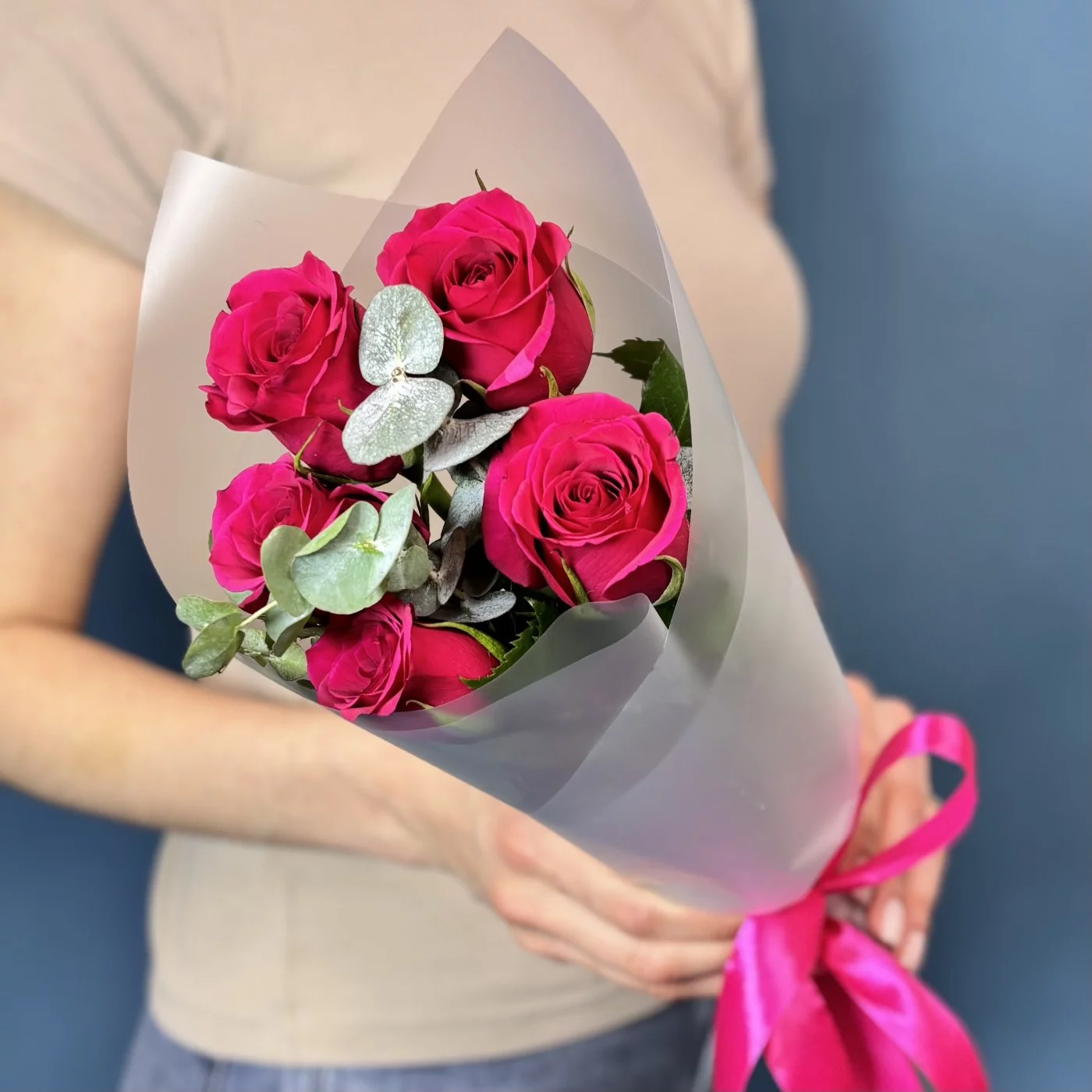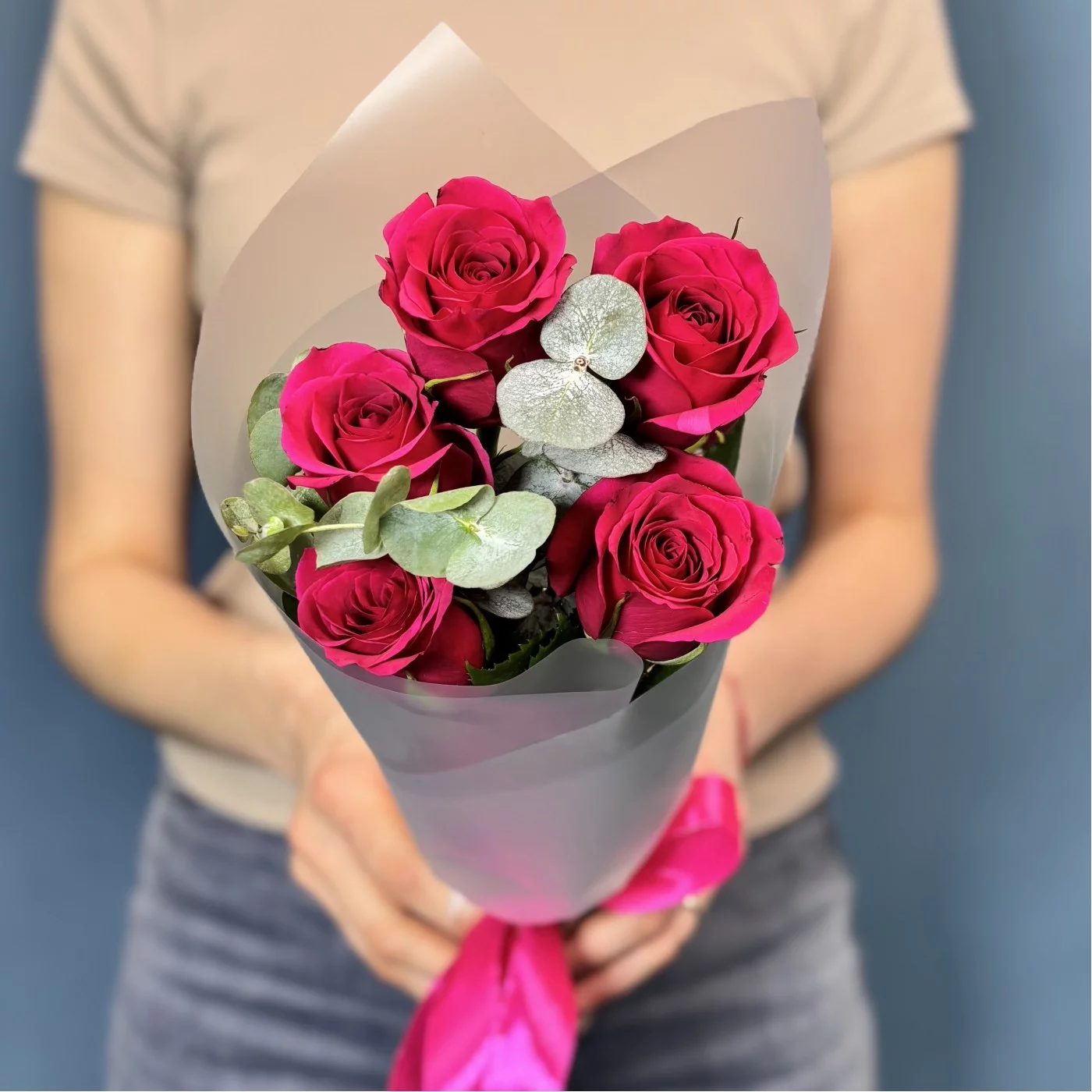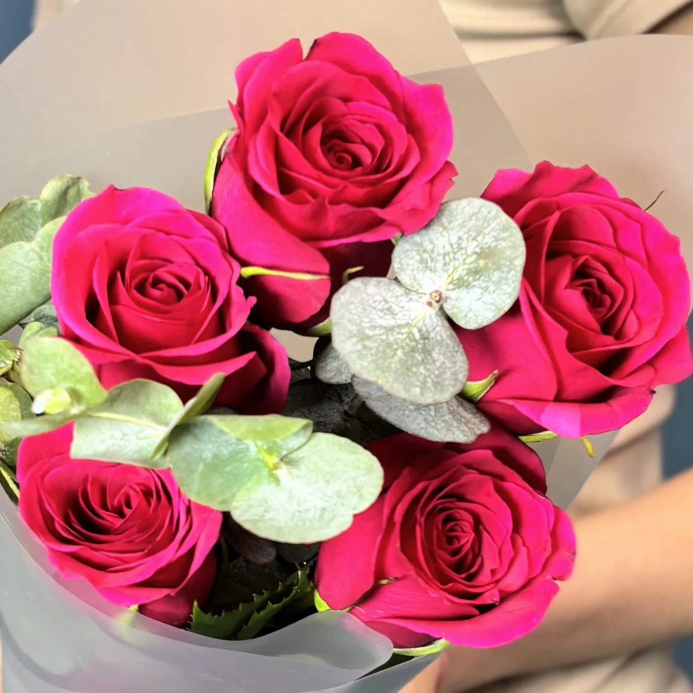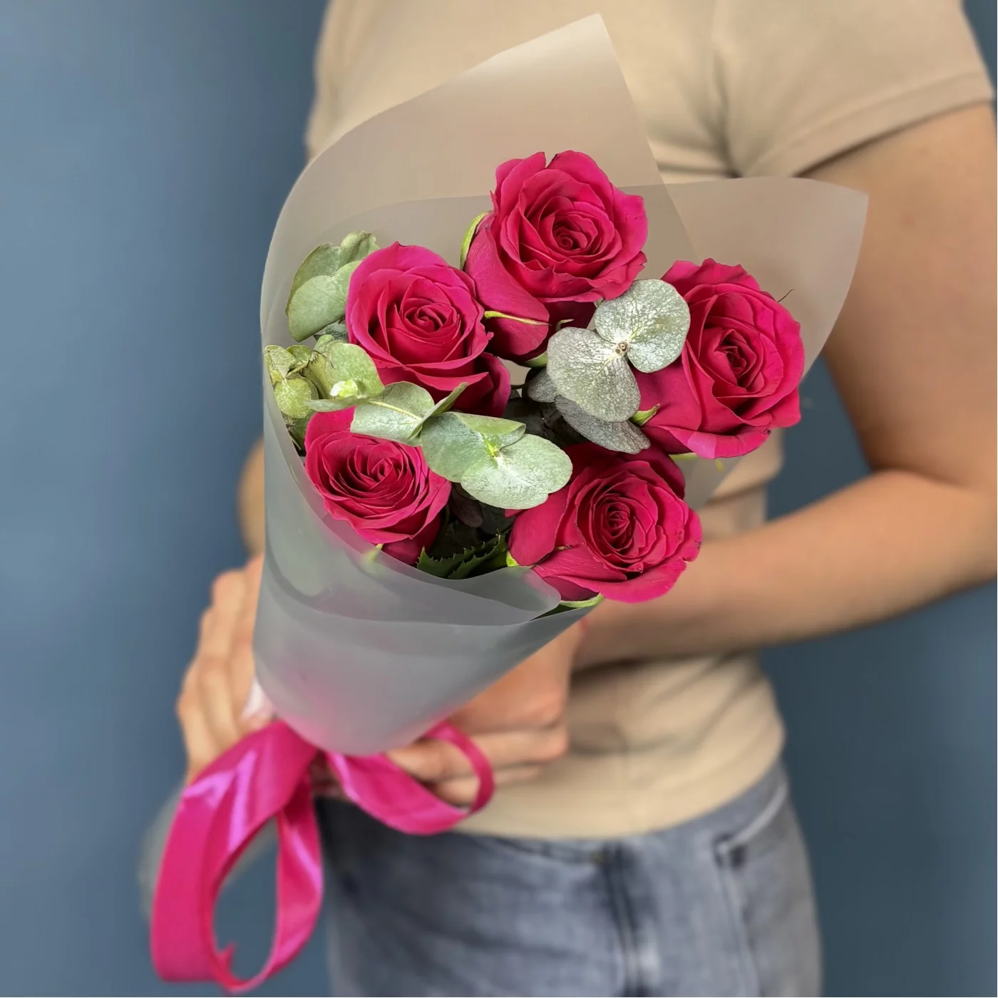 Букет из 5 малиновых роз сорта Такаци в сочетании с ароматным эвкалиптом — это утончённая и стильная композиция, которая объединяет страсть и свежесть.