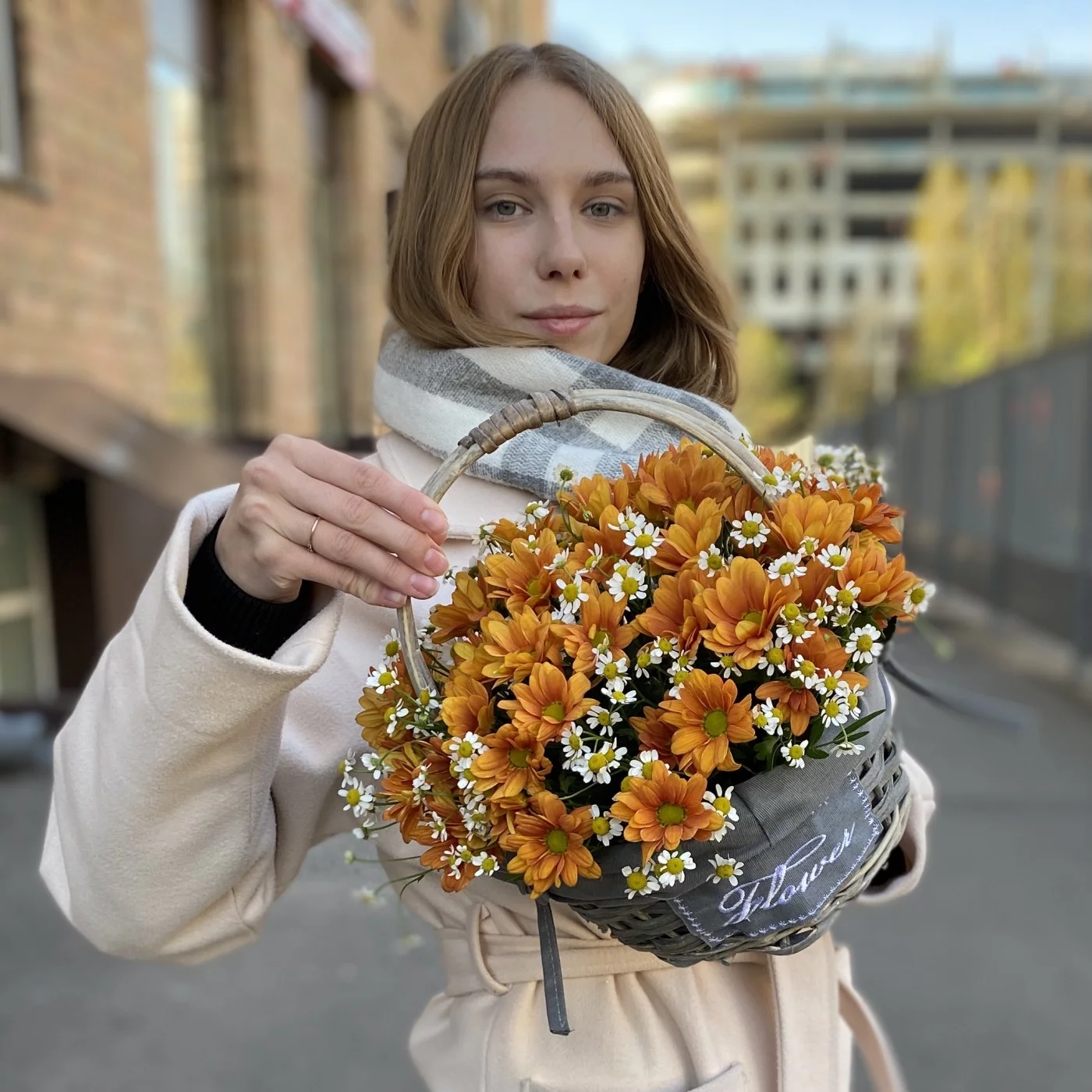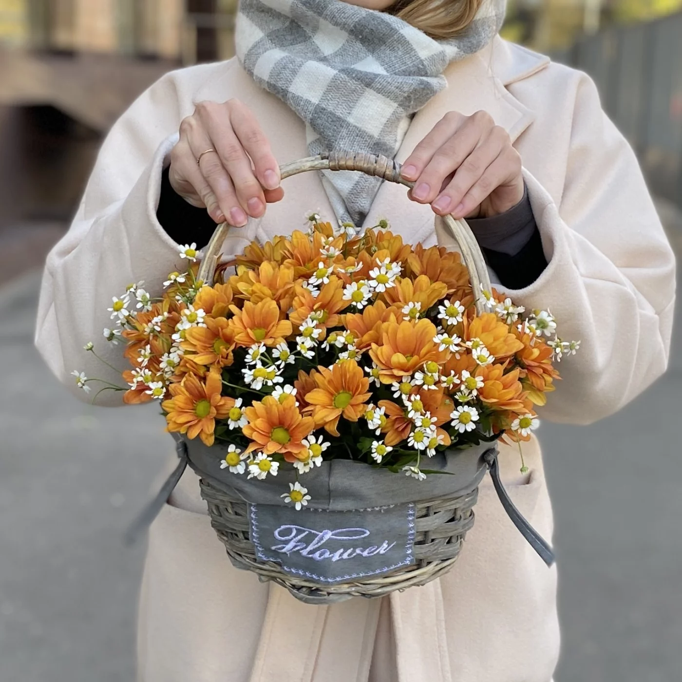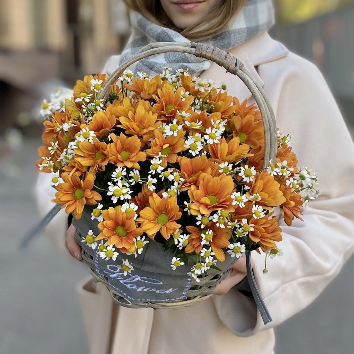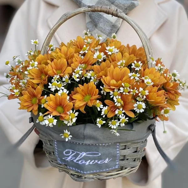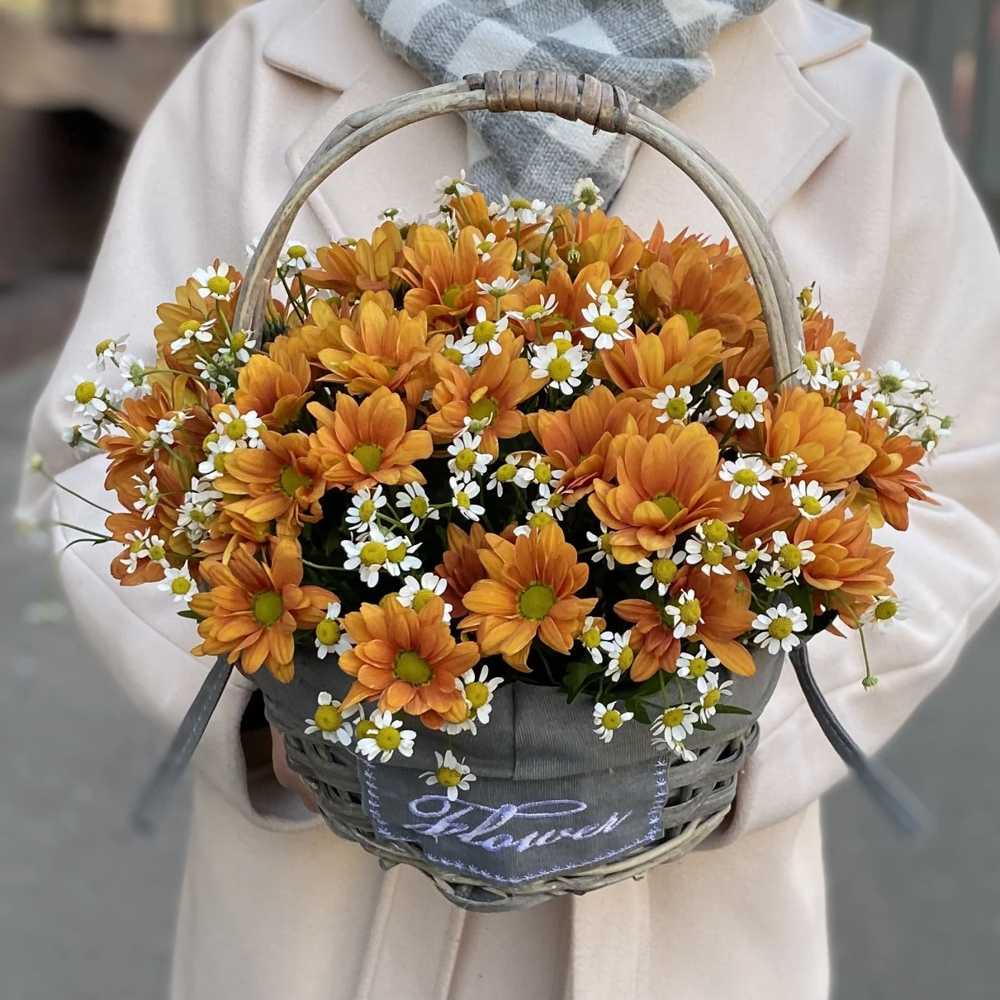 Букет из 5 оранжевых кустовых хризантем с ромашками в корзине — это замечательное, яркое и жизнерадостное цветочное оформление, которое станет прекрасным подарком для любого повода.
