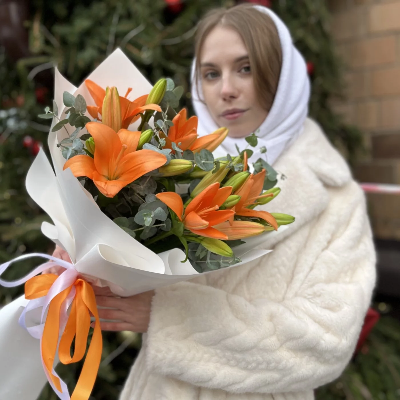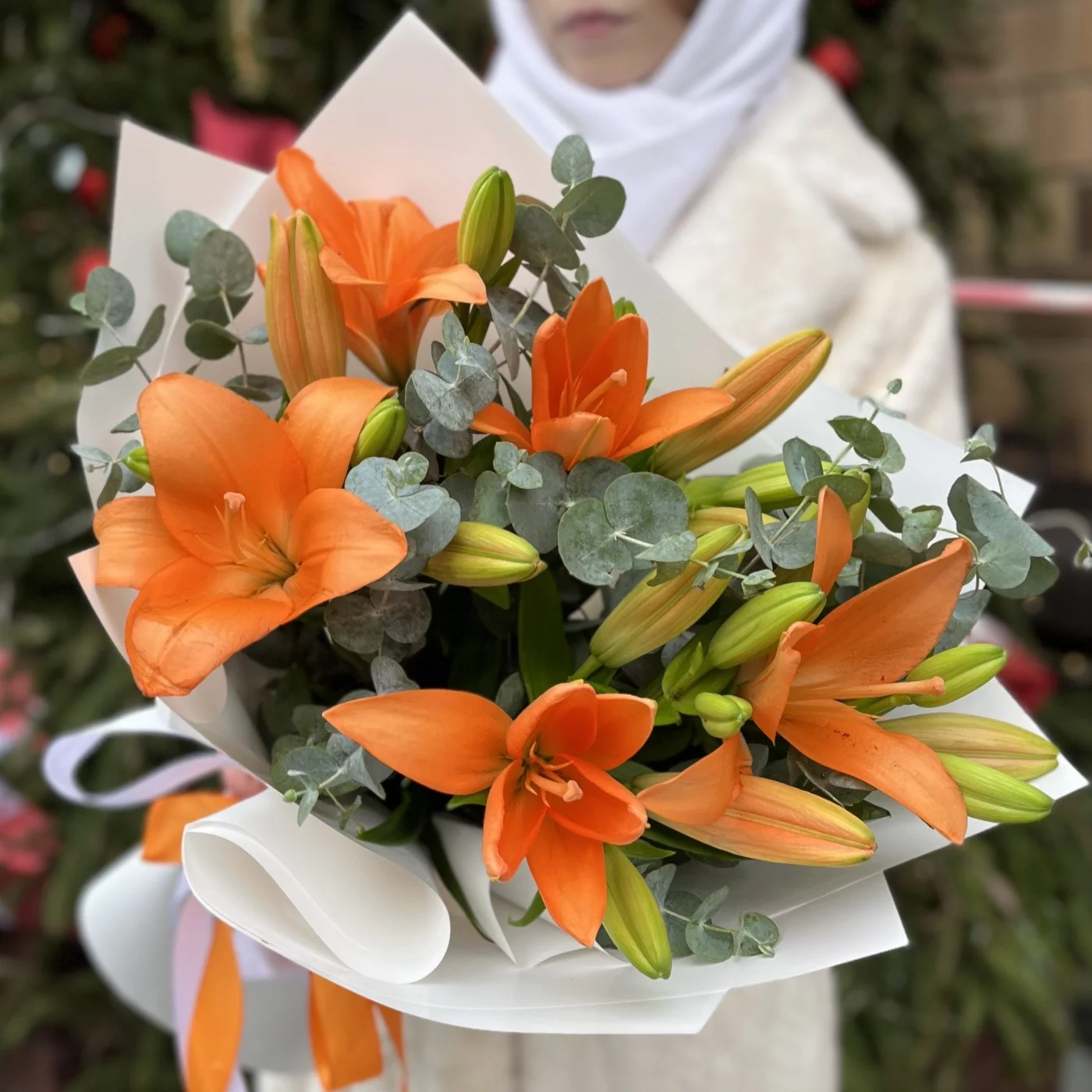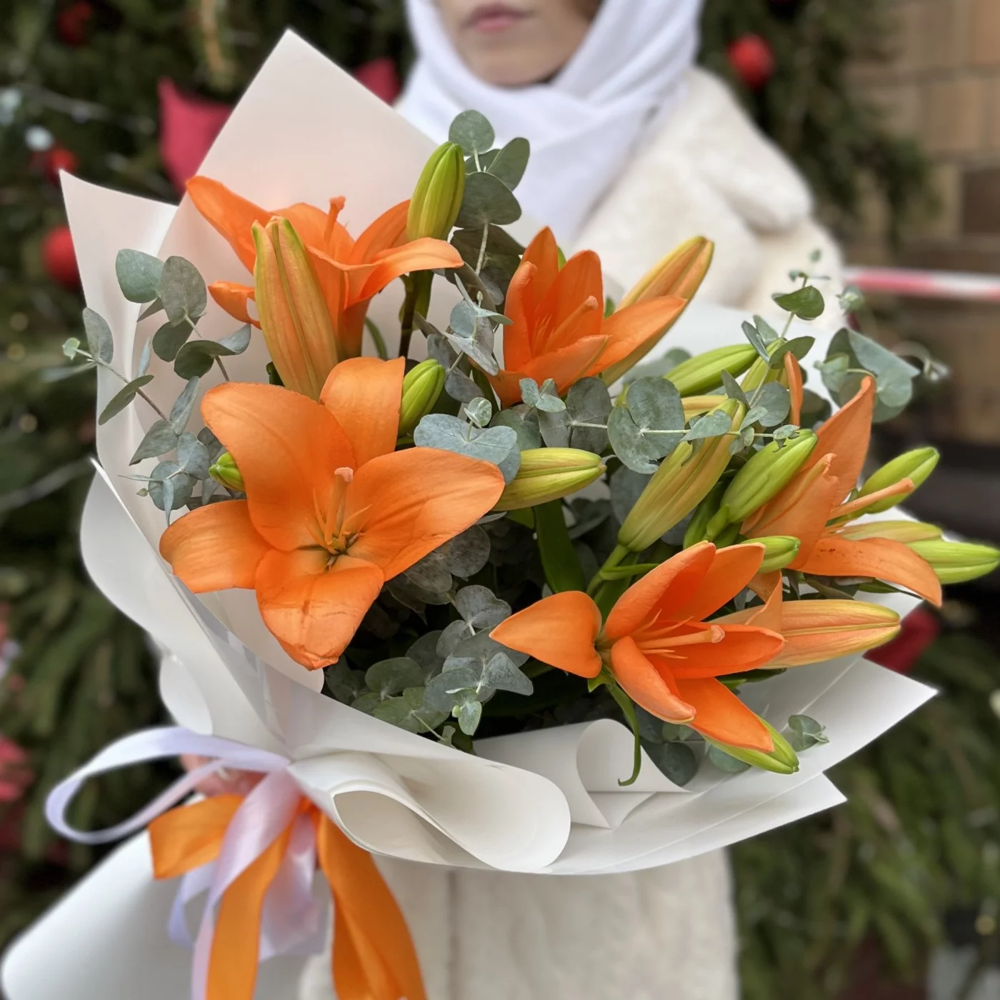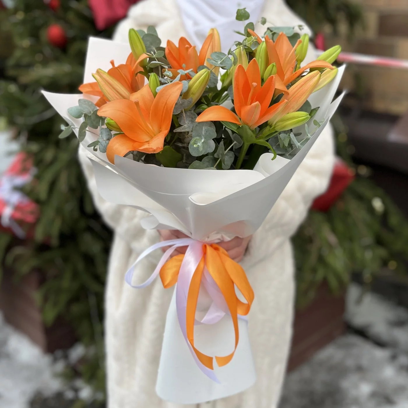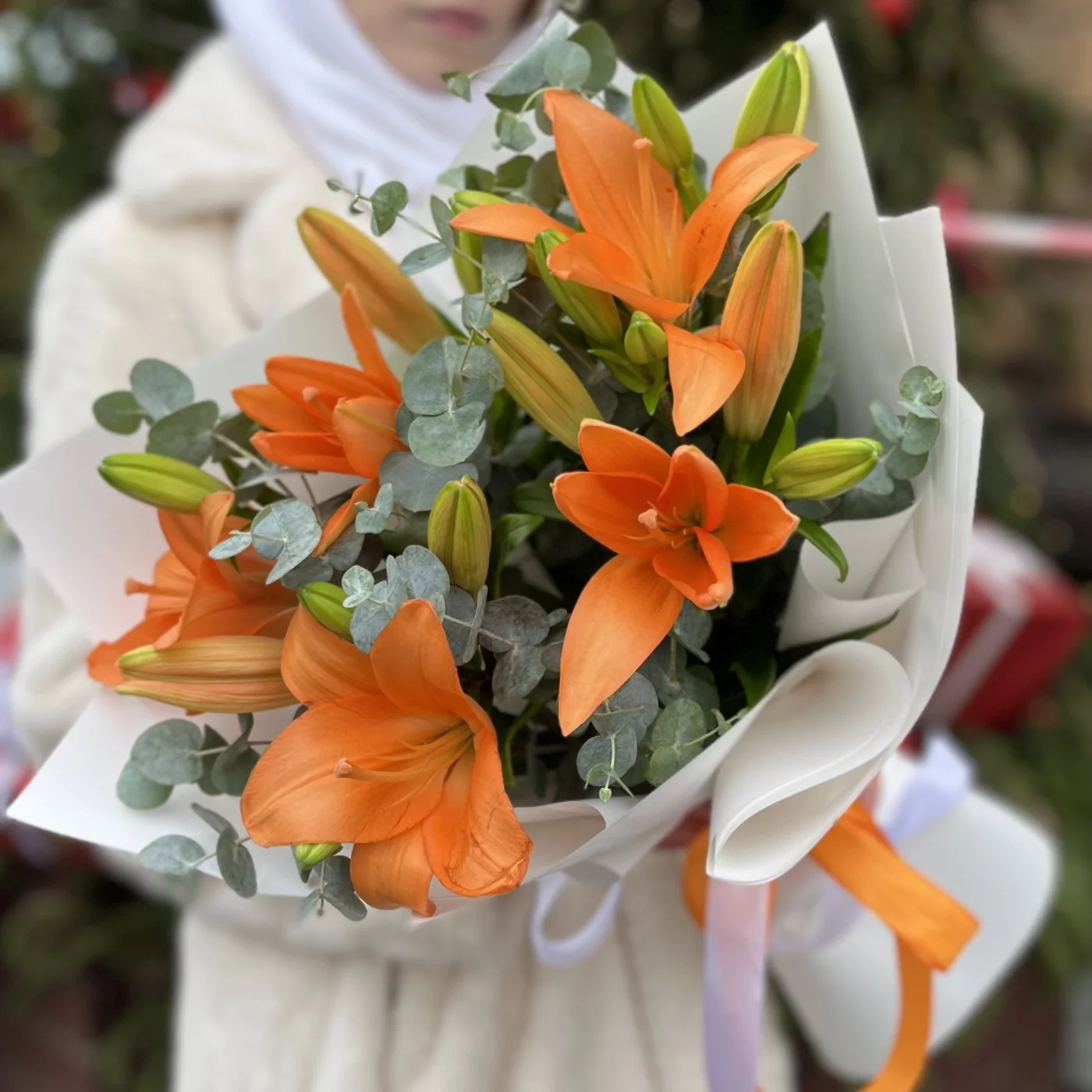 Букет из 5 оранжевых лилий с эвкалиптом — это яркая и жизнерадостная композиция, которая наполняет пространство энергией и теплом.