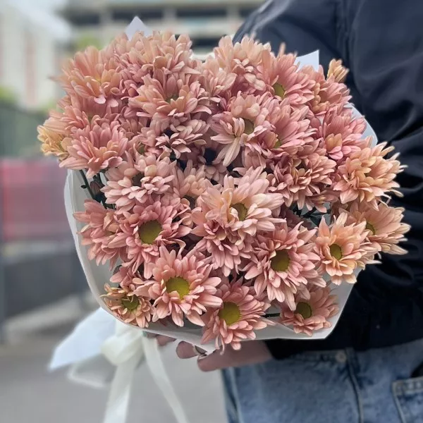 5 персиковых кустовых хризантем Салмон отличается нежным персиковым оттенком, который может варьироваться от светло-абрикосового до более насыщенного. Хризантемы имеют плотные и пушистые соцветия, создающие эффектный объем и привлекательный вид.