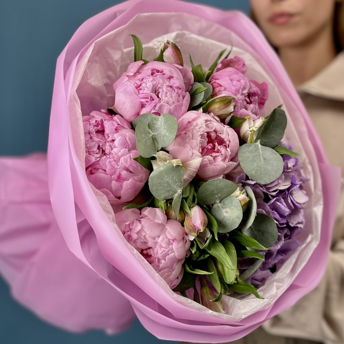 Пионы с их пышными, ароматными цветами создают ощущение роскоши и нежности, а мягкий оттенок гортензии добавляет нотки спокойствия и элегантности.