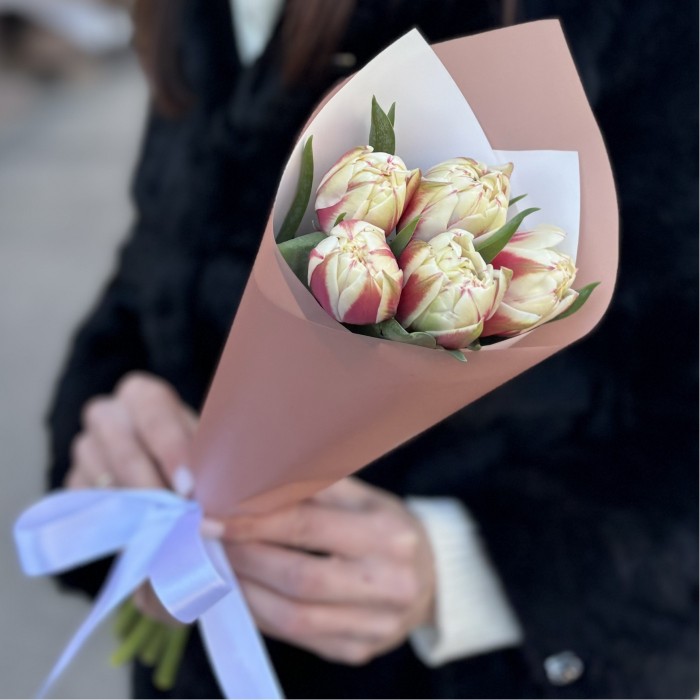 Букет из 5 пионовидных тюльпанов Вермонт с очень красивым раскрытием бутона подойдет для самой нежной девушки как знак внимания или подарок на день рождения.