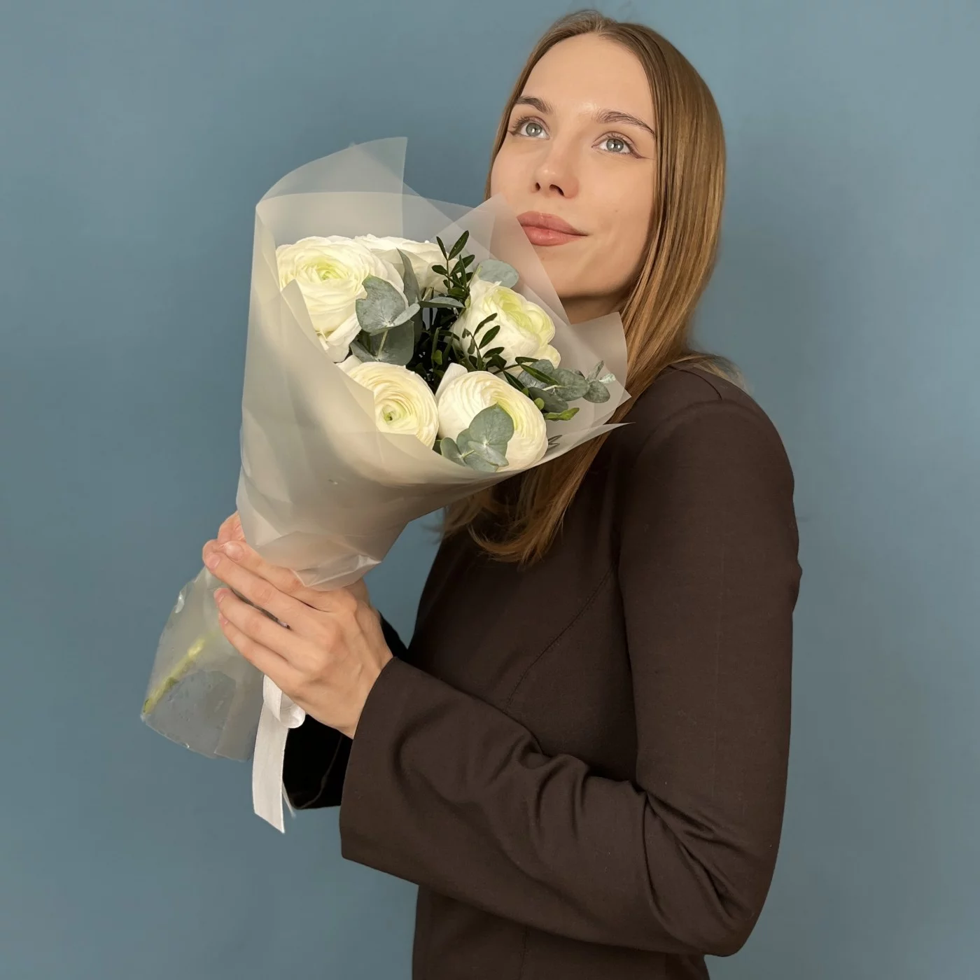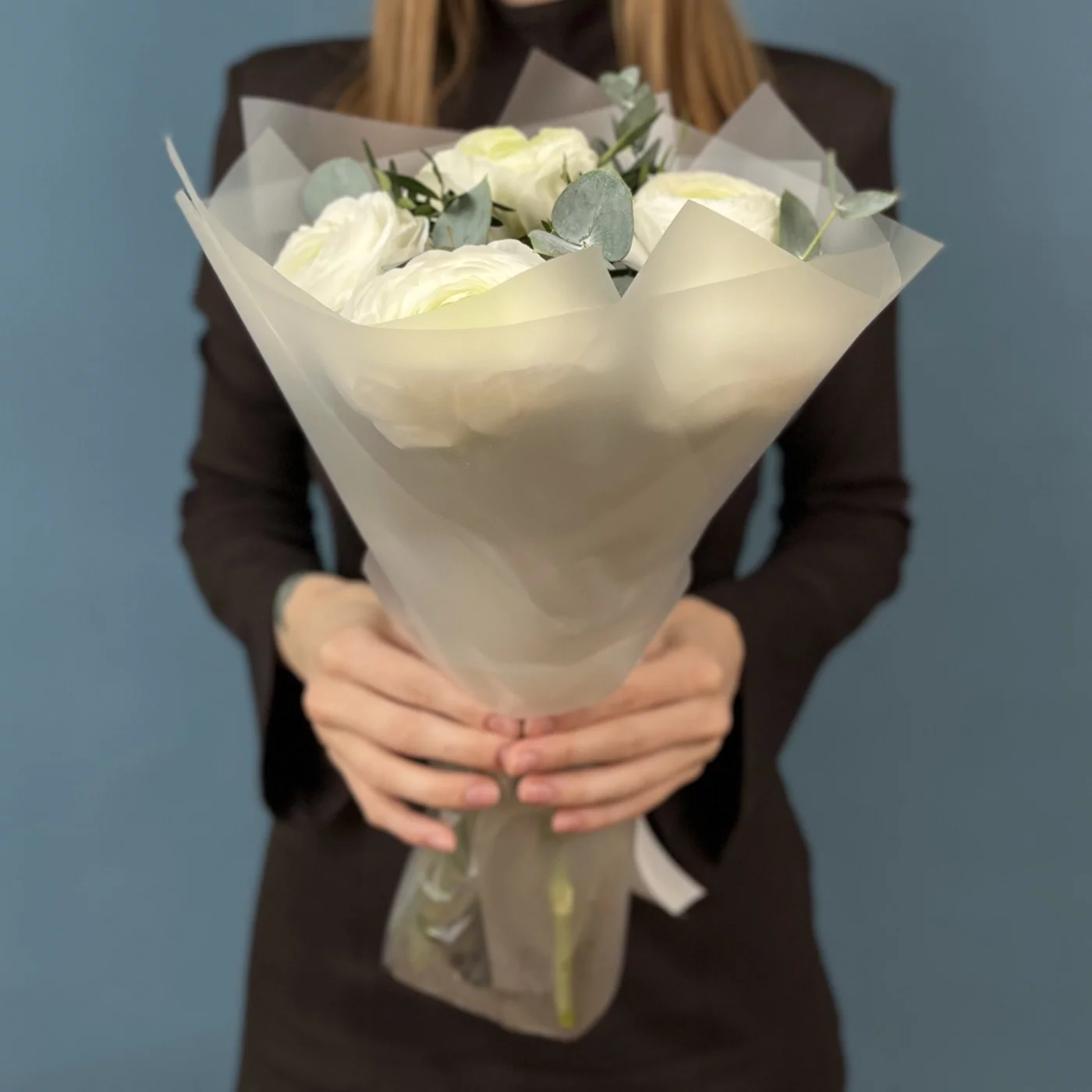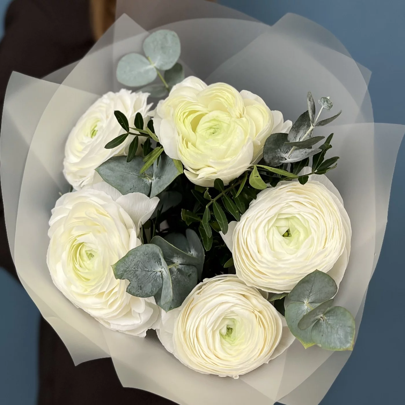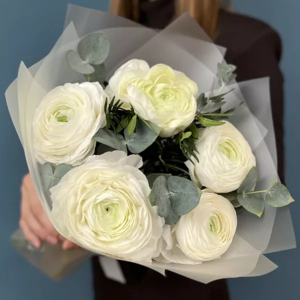 5 пышных белых Ранункулюсов с эвкалиптом