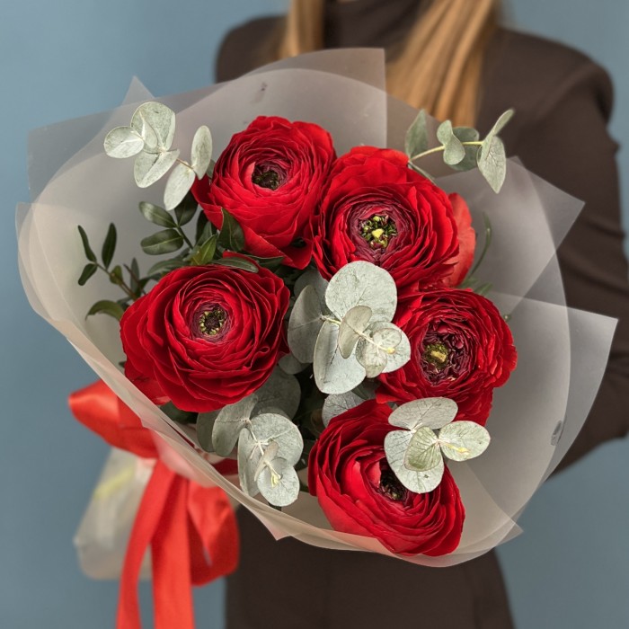 5 пышных красных ранункулюсов с эвкалиптом