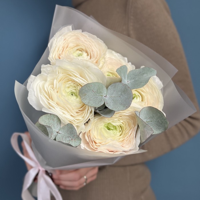 Букет из 5 ранункулюсов Ханой с эвкалиптом — это стильный букет, который идеально подойдет в качестве небольшого подарка.