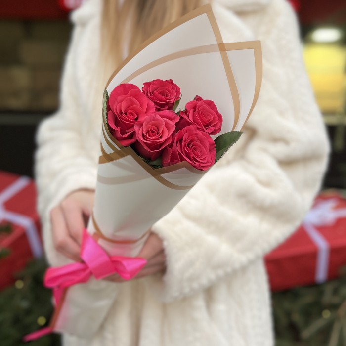 Букет из 5 малиновых роз сорта Такаци – это один из классических вариантов цветочных букетов. Такой букет отлично подойдет для выражения самых теплых чувств и скажет о многом без слов!
