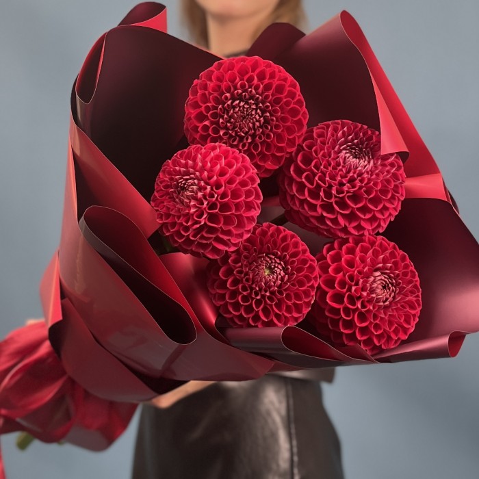 Очаровательные 5 темно-красных георгин помпон — это яркие и элегантные цветы.