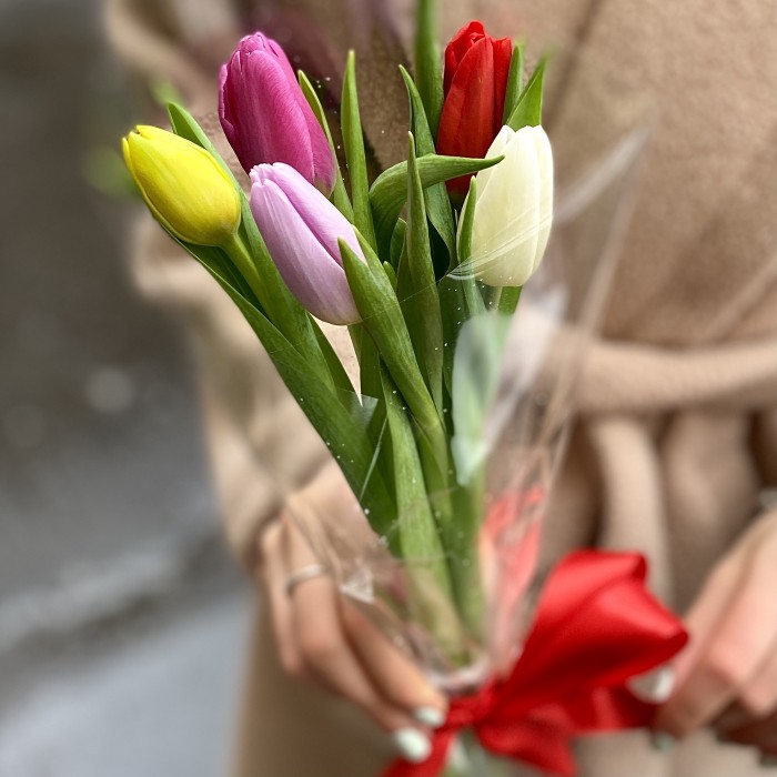 Мини букет из тюльпанов различных цветов в прозрачной упаковке, перевязанный яркой красной атласной лентой.