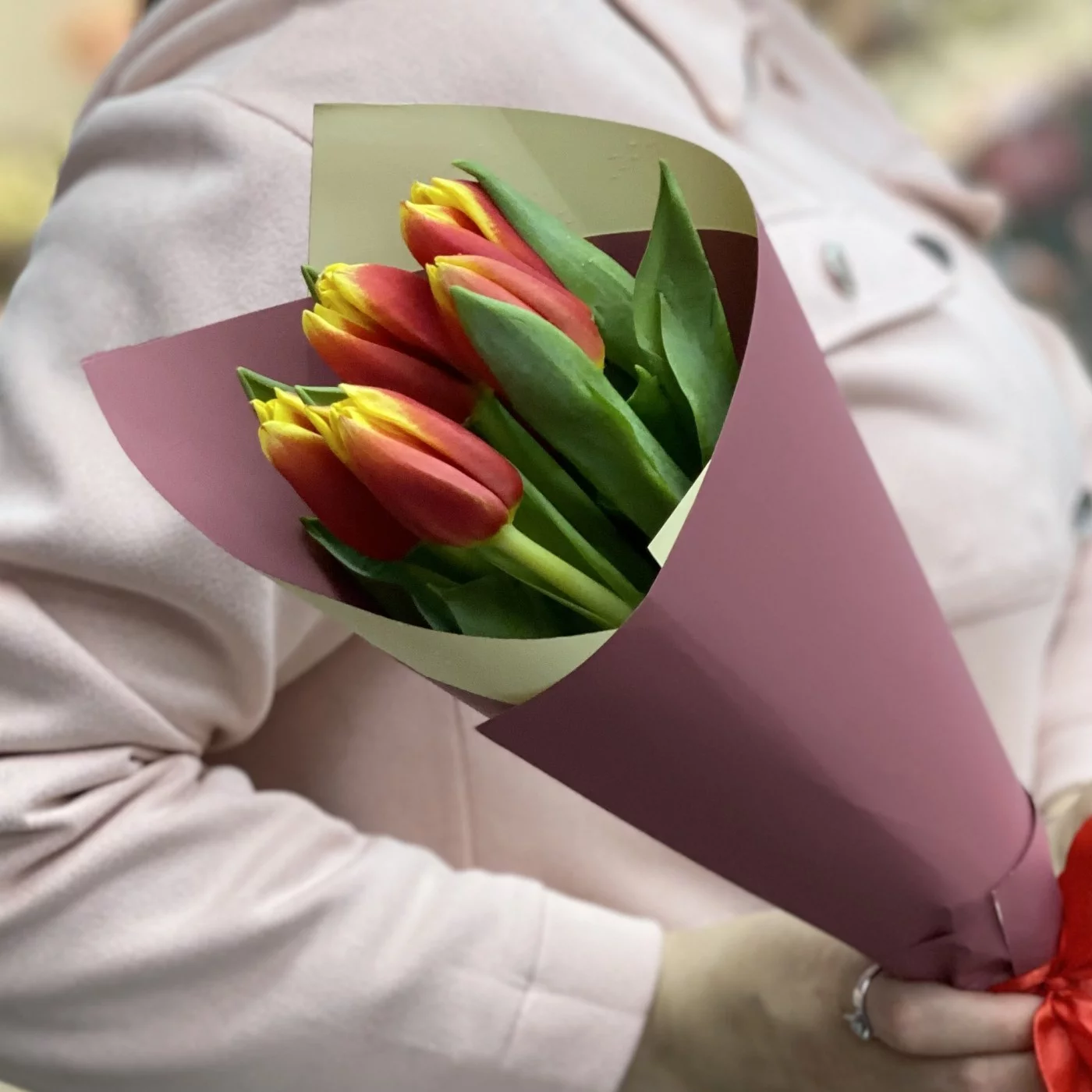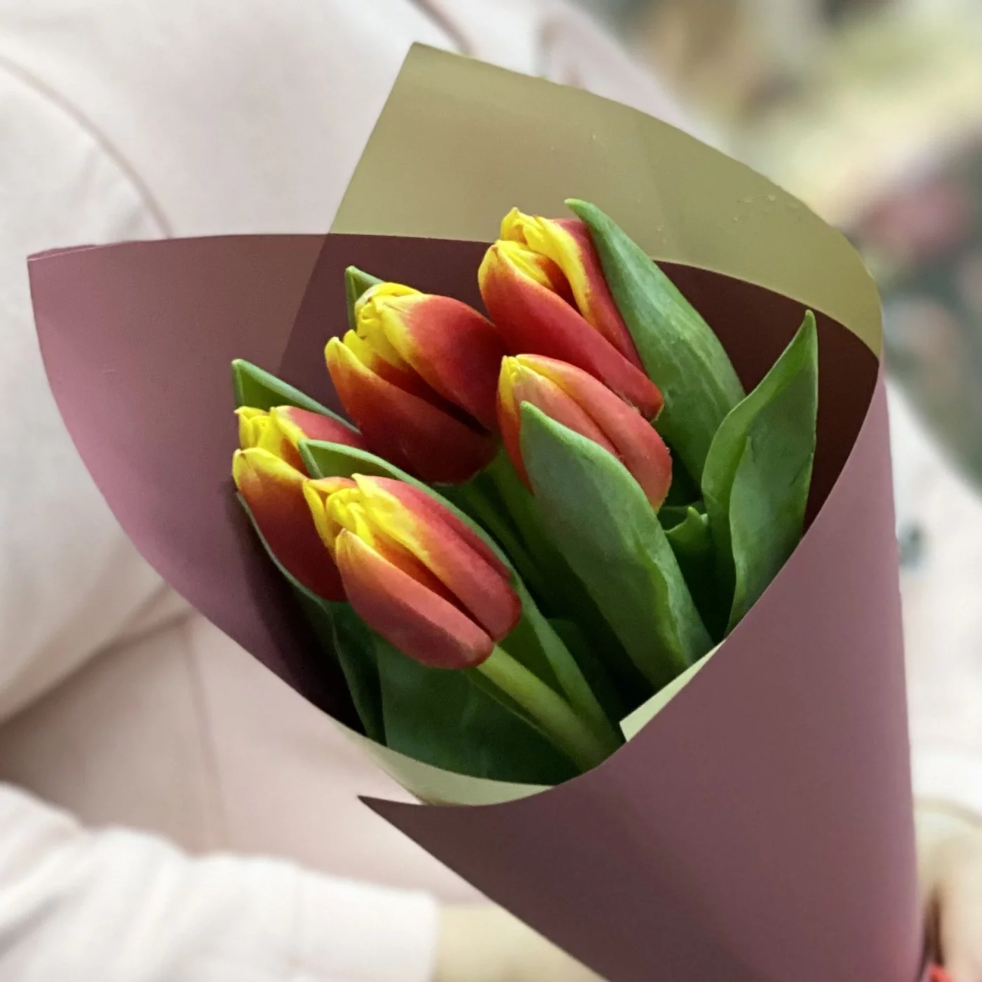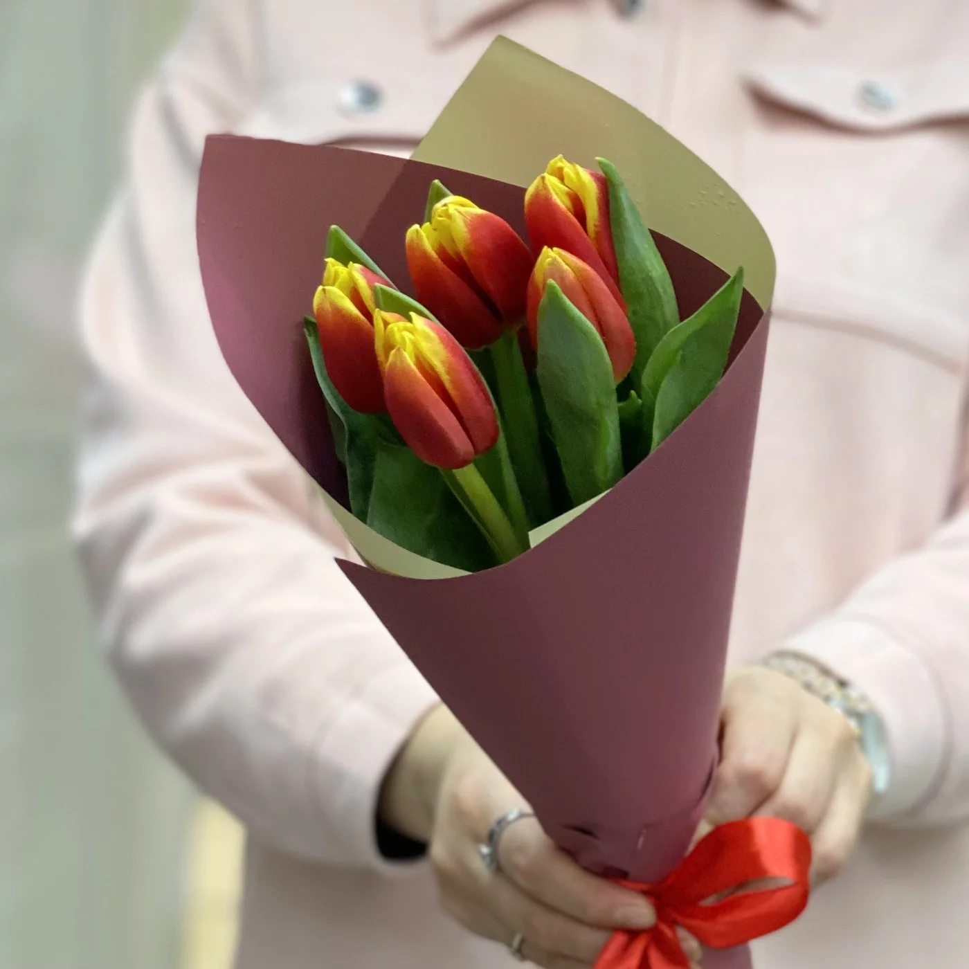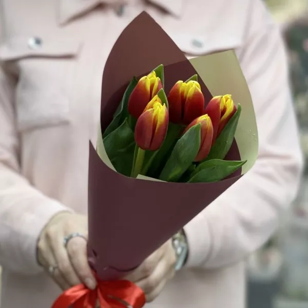 Мини букет из красно-желтых тюльпанов в стильной упаковке. Прекрасный корпоративный вариант подарка на 8 марта.