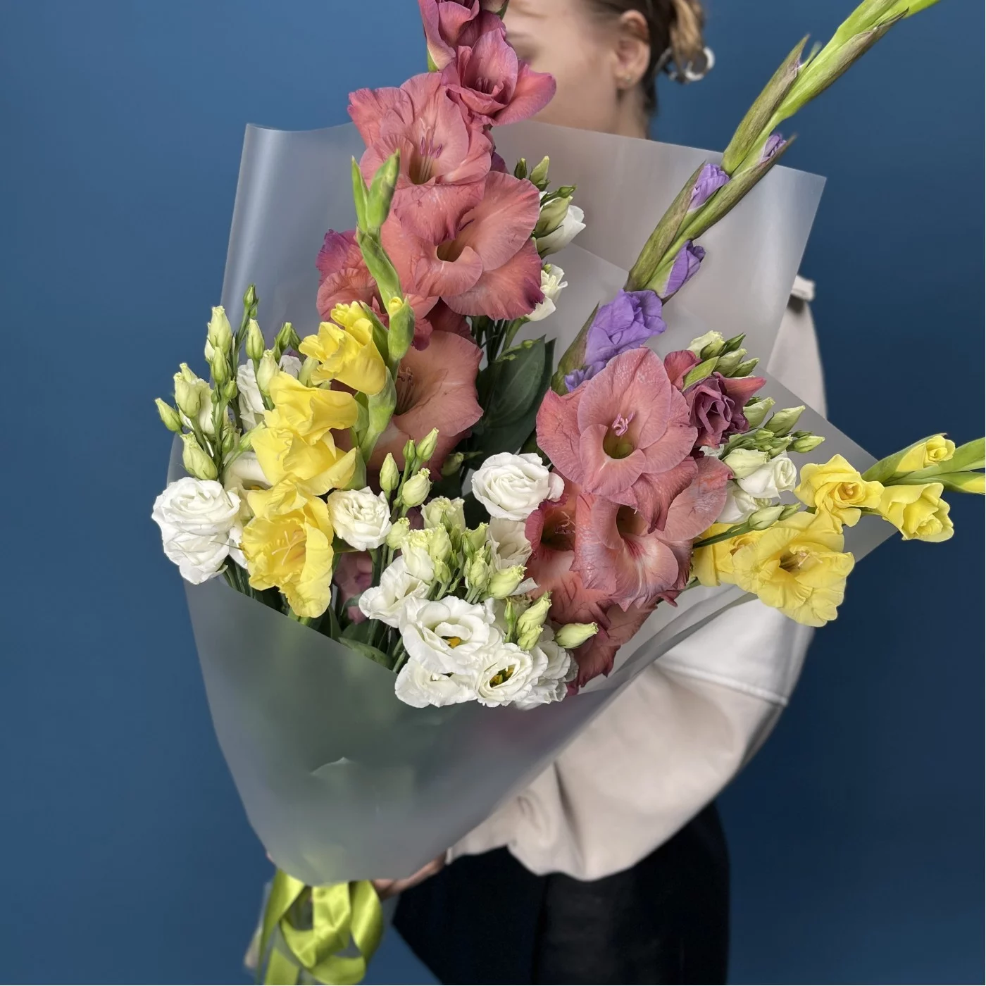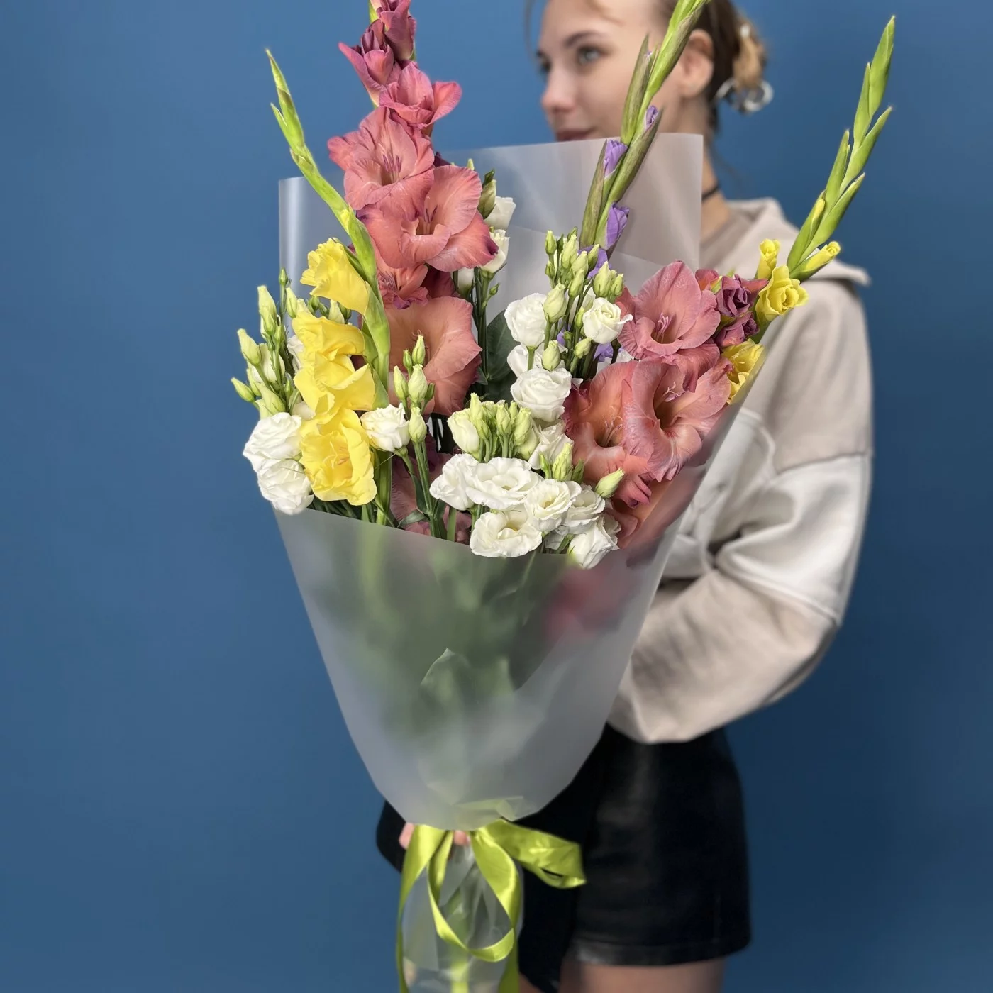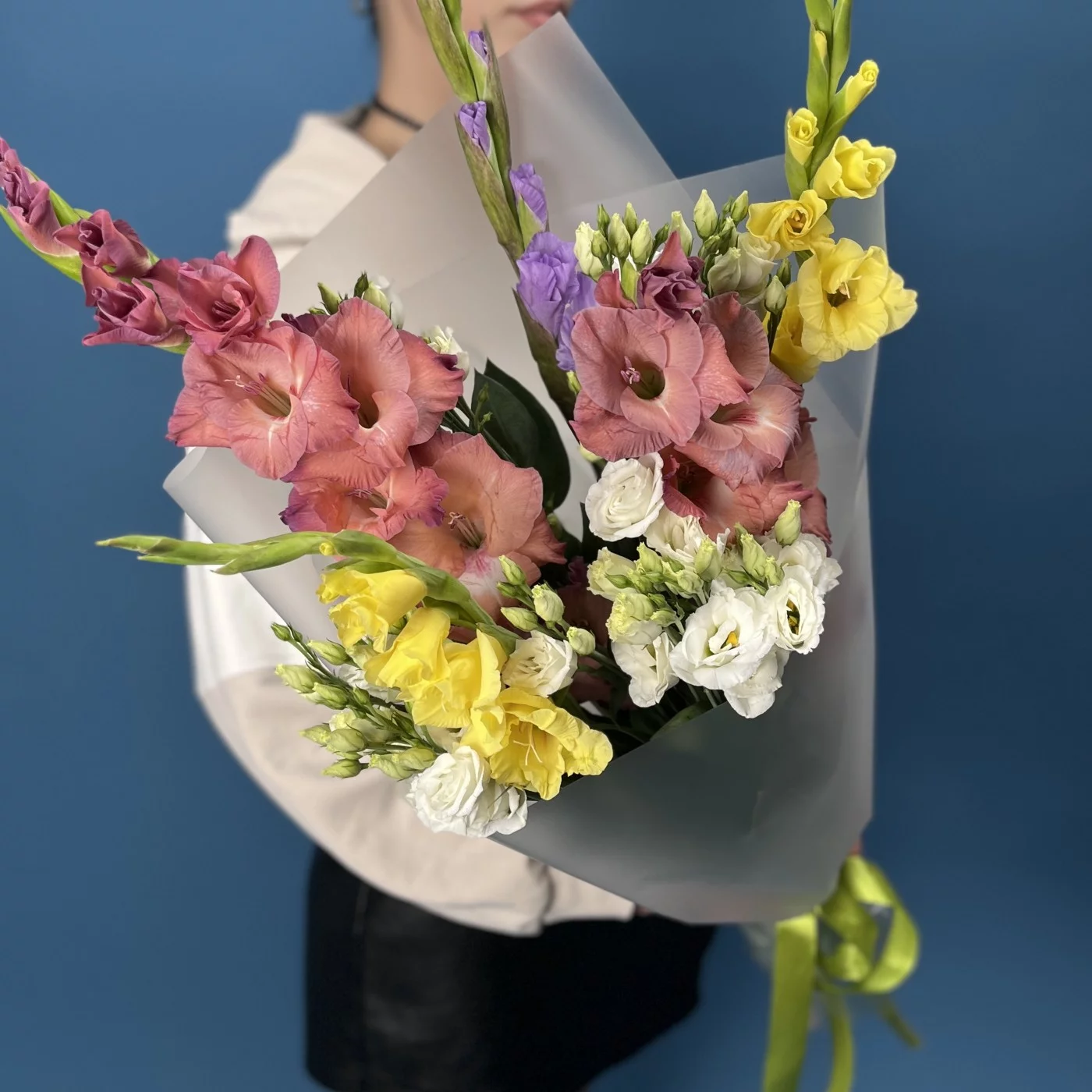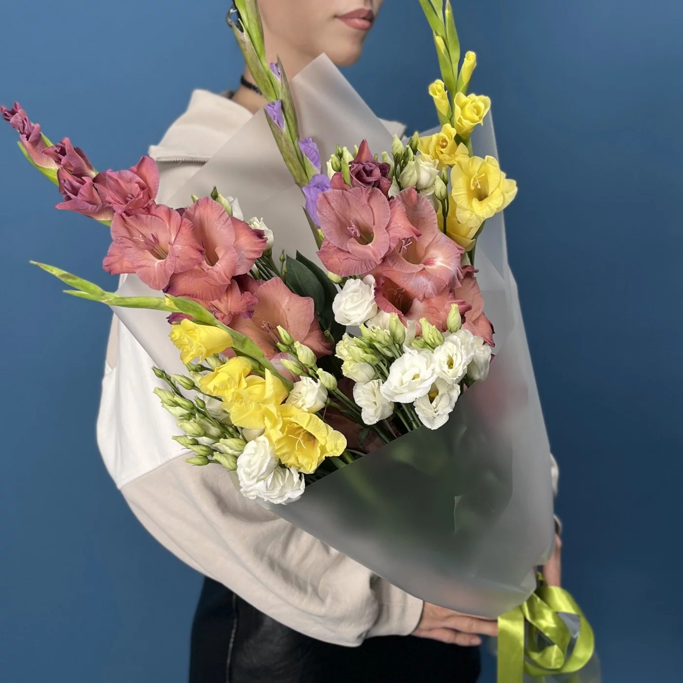 5 ярких гладиолусов MIX с эустомой