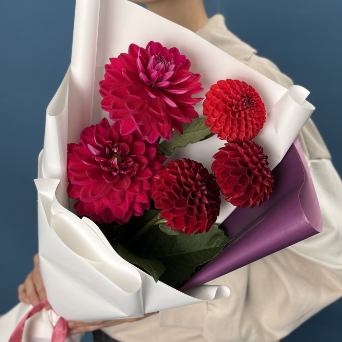 Букет из 5 ярких красных и малиновых георгинов будет выглядеть очень эффектно и привлекательно. Это сочетание цветов символизирует страсть, энергию и радость.