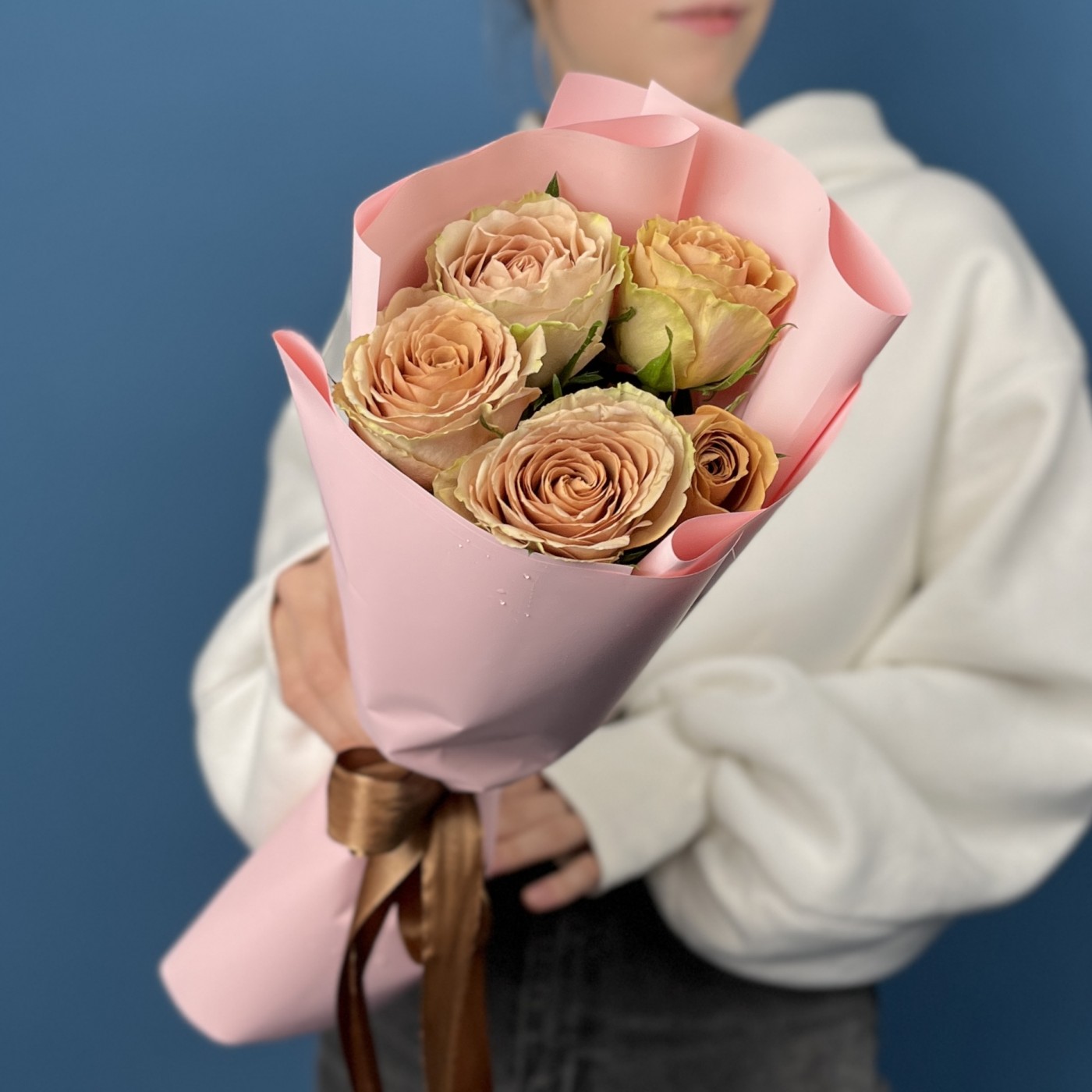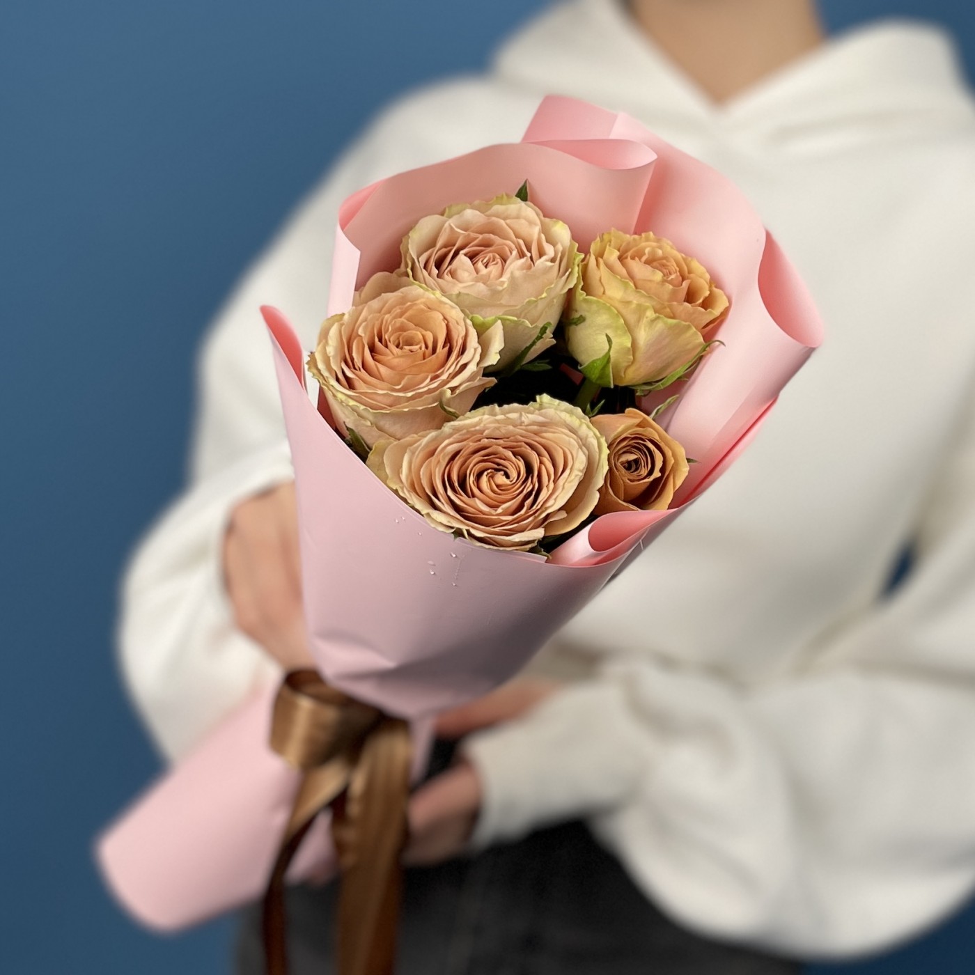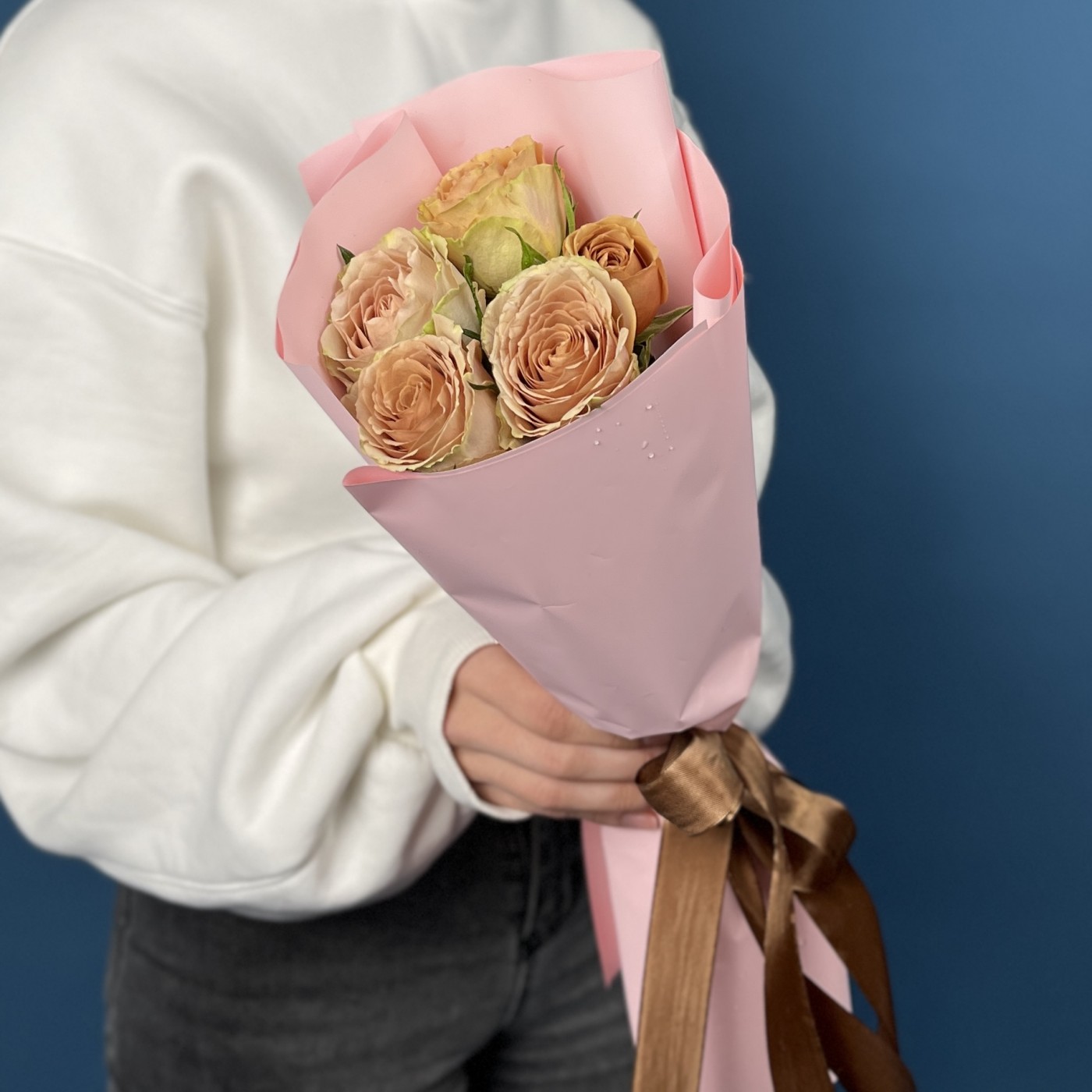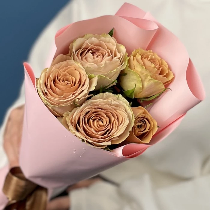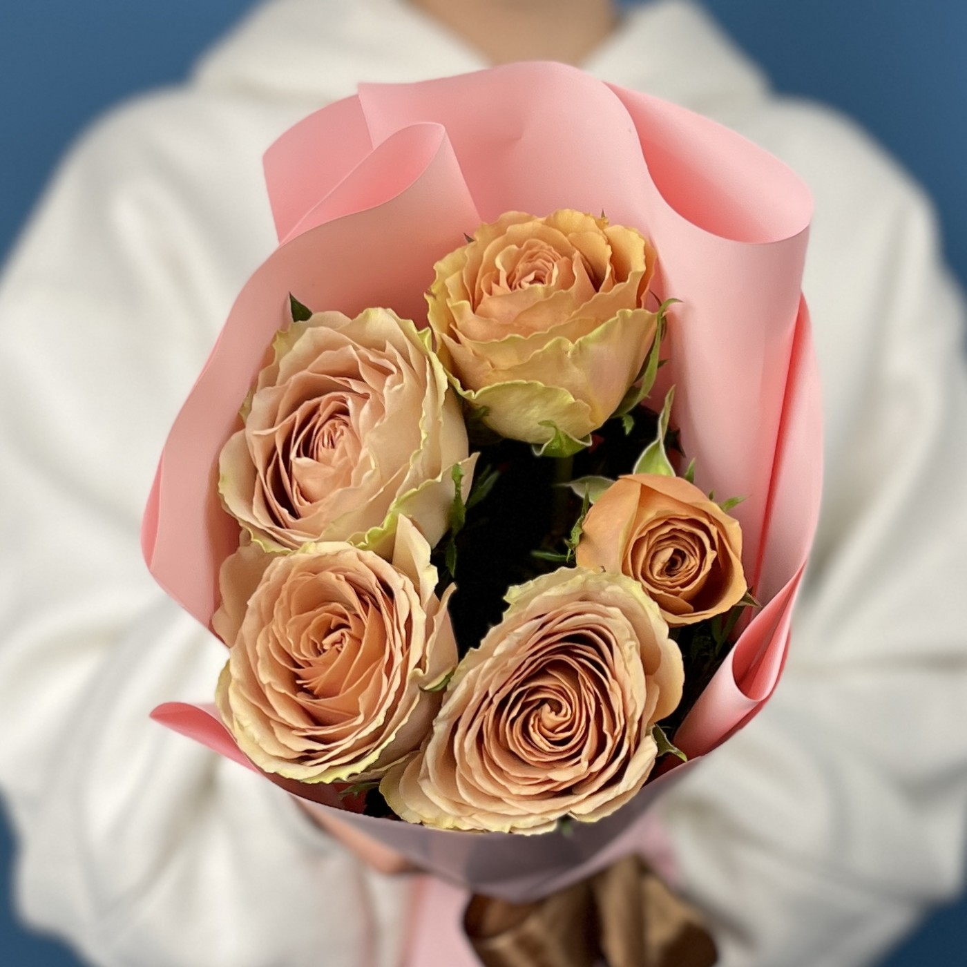 Изысканный букет из 5 роз сорта Тедди с длиной стебля 40 см. Их нежные зелёно-персиковые оттенки создают мягкую, романтичную атмосферу. Отличный подарок или украшение для интерьера, наполняя его тепло и свежестью.