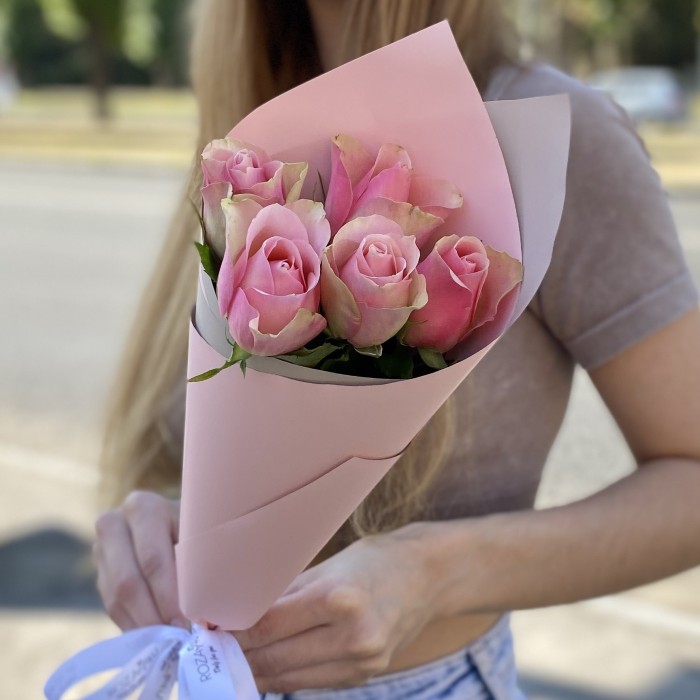 5 розово-зеленых роз создает эффект яркого и свежего букета, который привлекает внимание и дарит настроение.