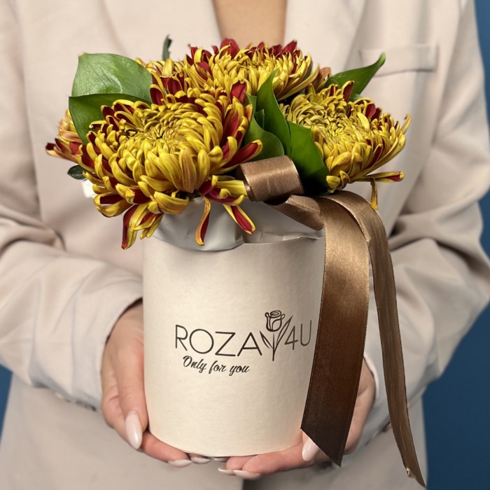 Композиция из пяти хризантем Том Пирс в коробке — это яркое и тёплое воплощение осеннего настроения. Жёлто-красные переливы лепестков создают эффект огня и солнечных бликов, благодаря чему каждая хризантема выглядит необыкновенно живой и выразительной. В стильной коробке цветы раскрываются ещё гармоничнее: оформление подчёркивает насыщенность оттенков, делает композицию аккуратной, цельной и по-настоящему праздничной. Такой букет приносит радость своей энергией и становится ярким акцентом в любом помещении.