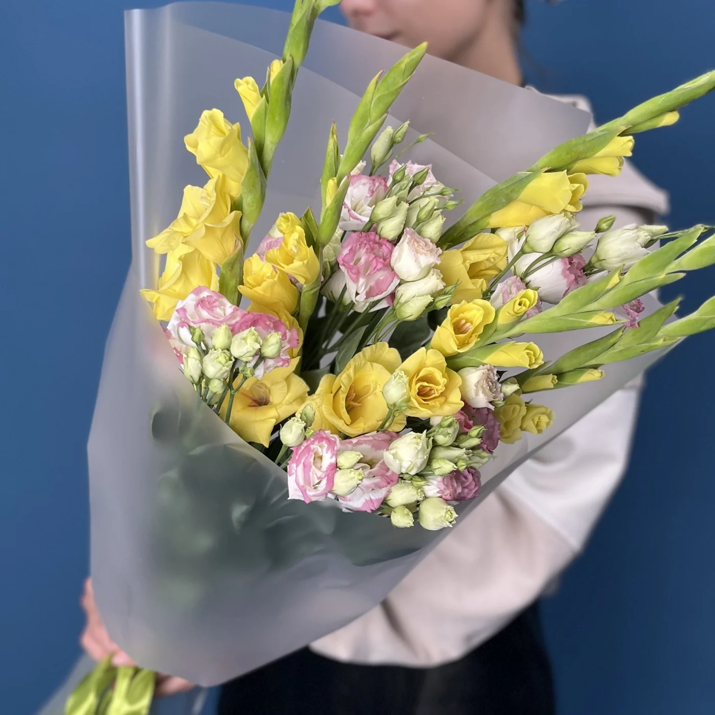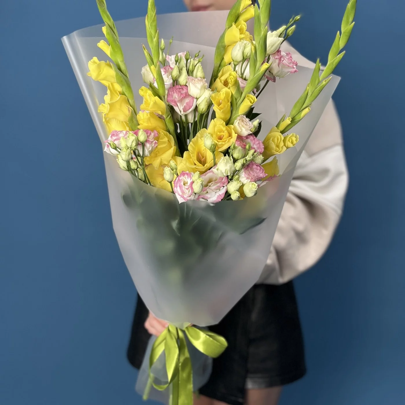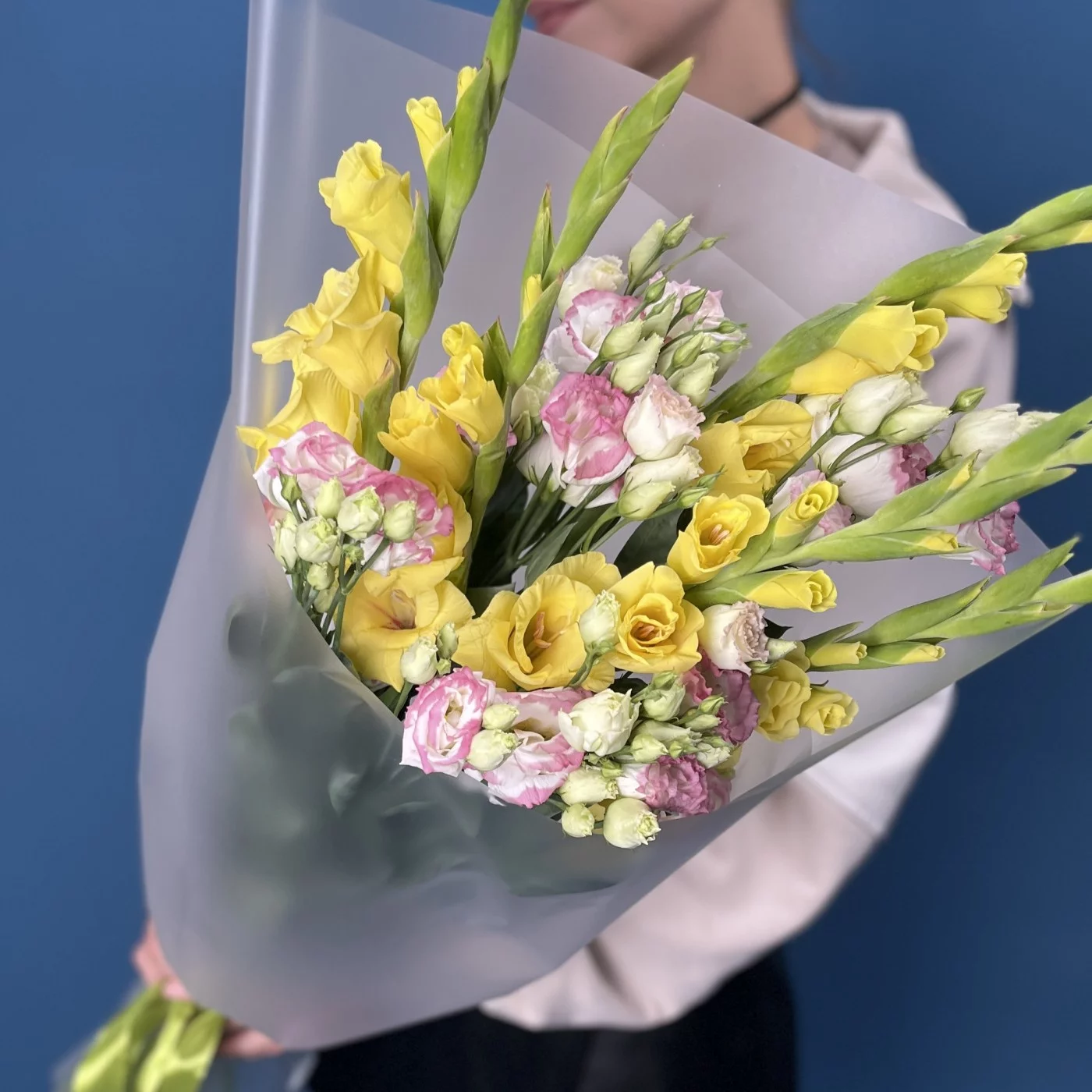 5 желтых гладиолусов с эустомой, станет ярким и радостным акцентом в любом интерьере, наполняя пространство светом и положительными эмоциями.