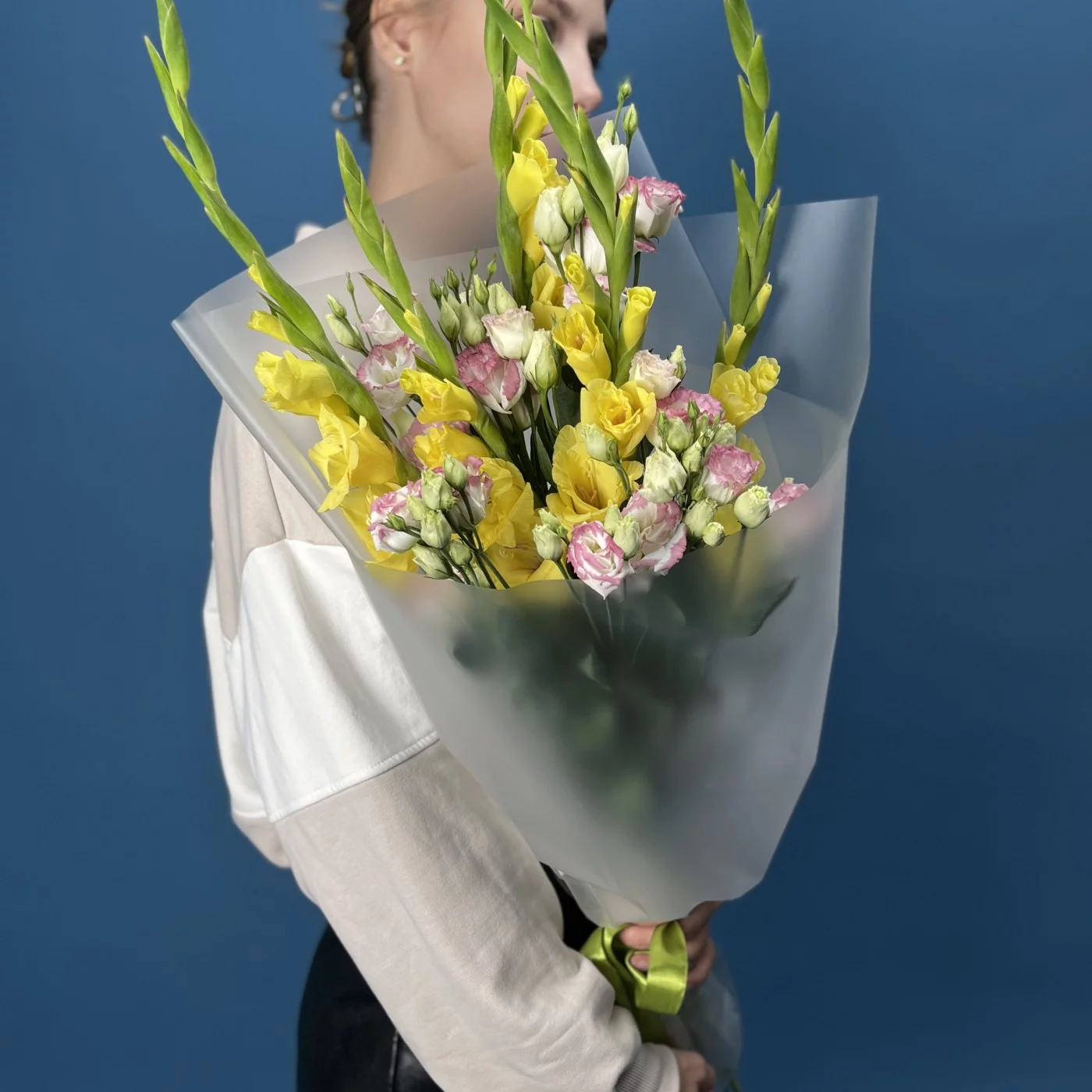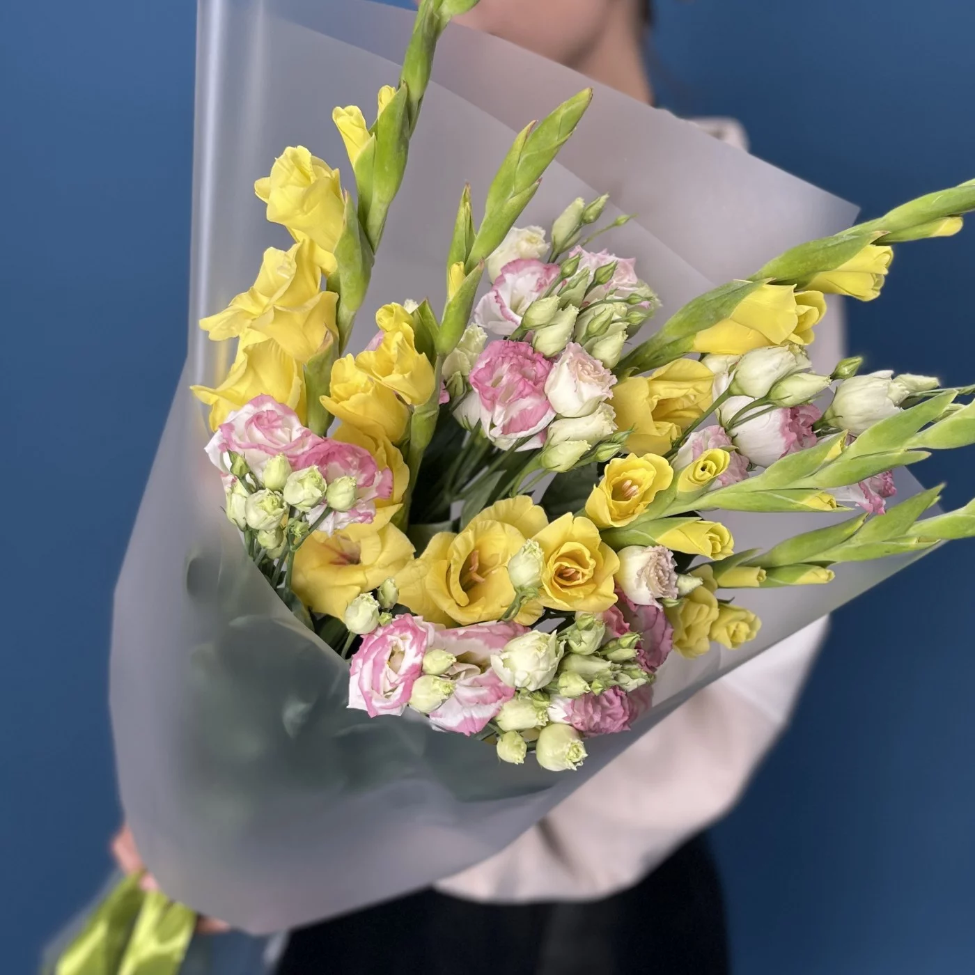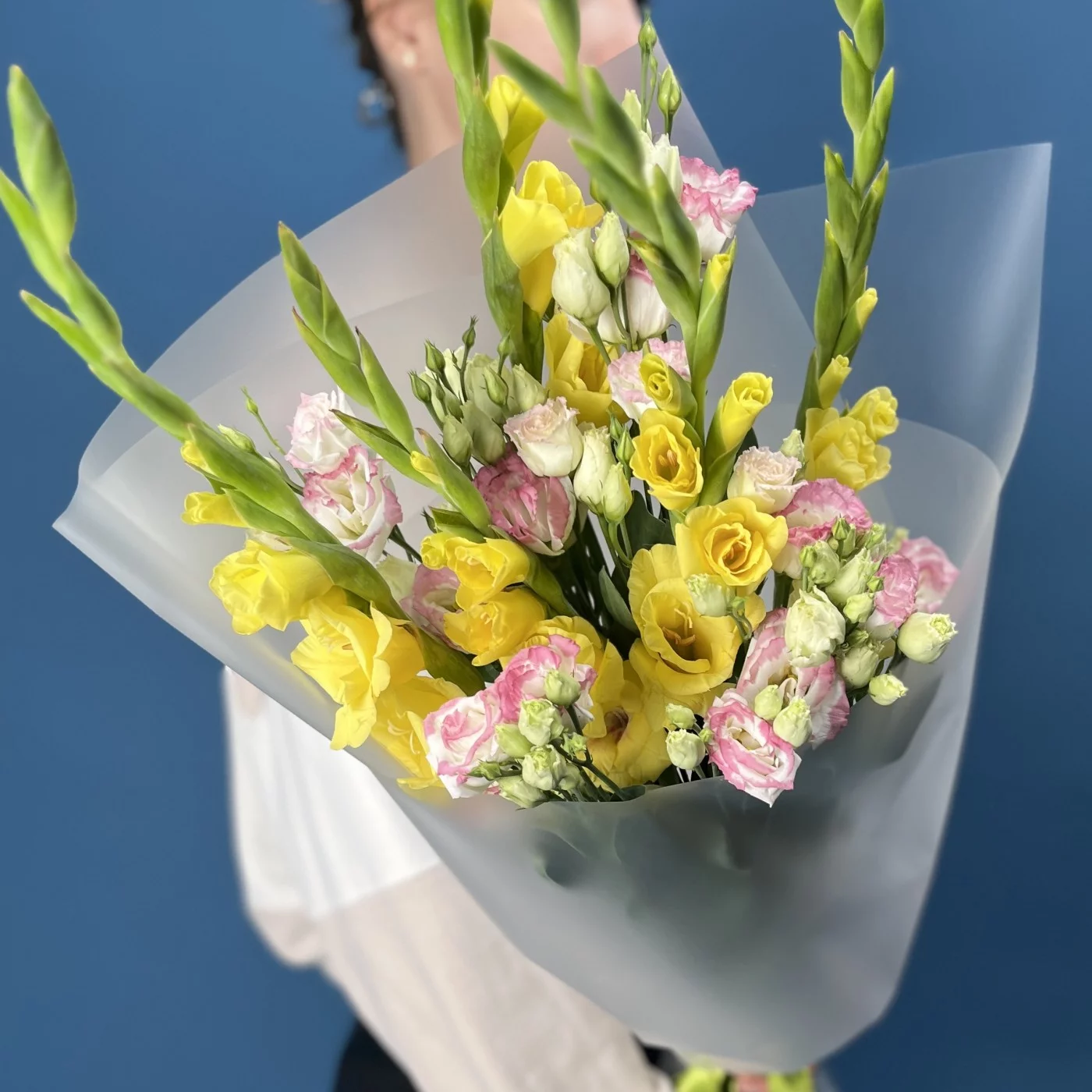 5 желтых гладиолусов с эустомой, станет ярким и радостным акцентом в любом интерьере, наполняя пространство светом и положительными эмоциями.