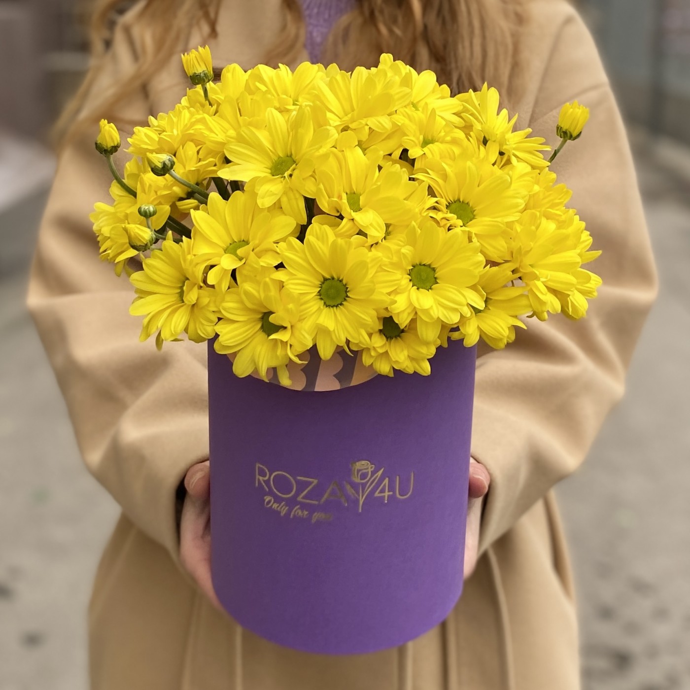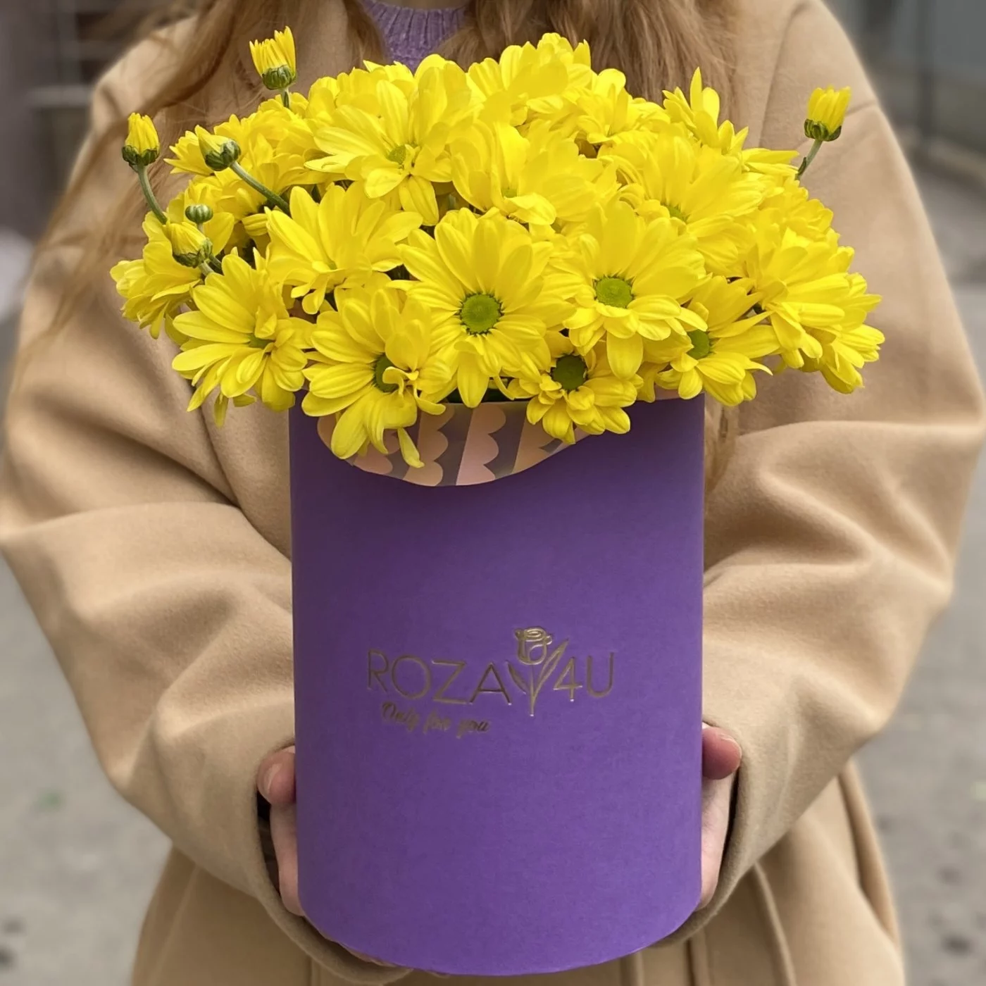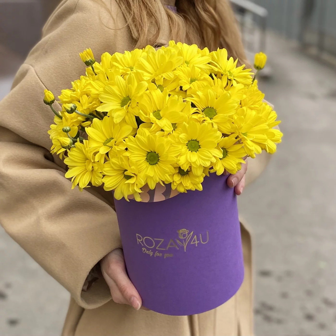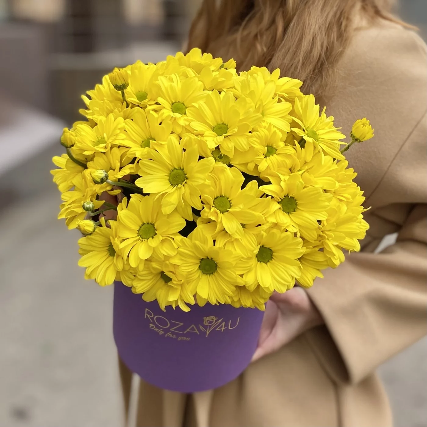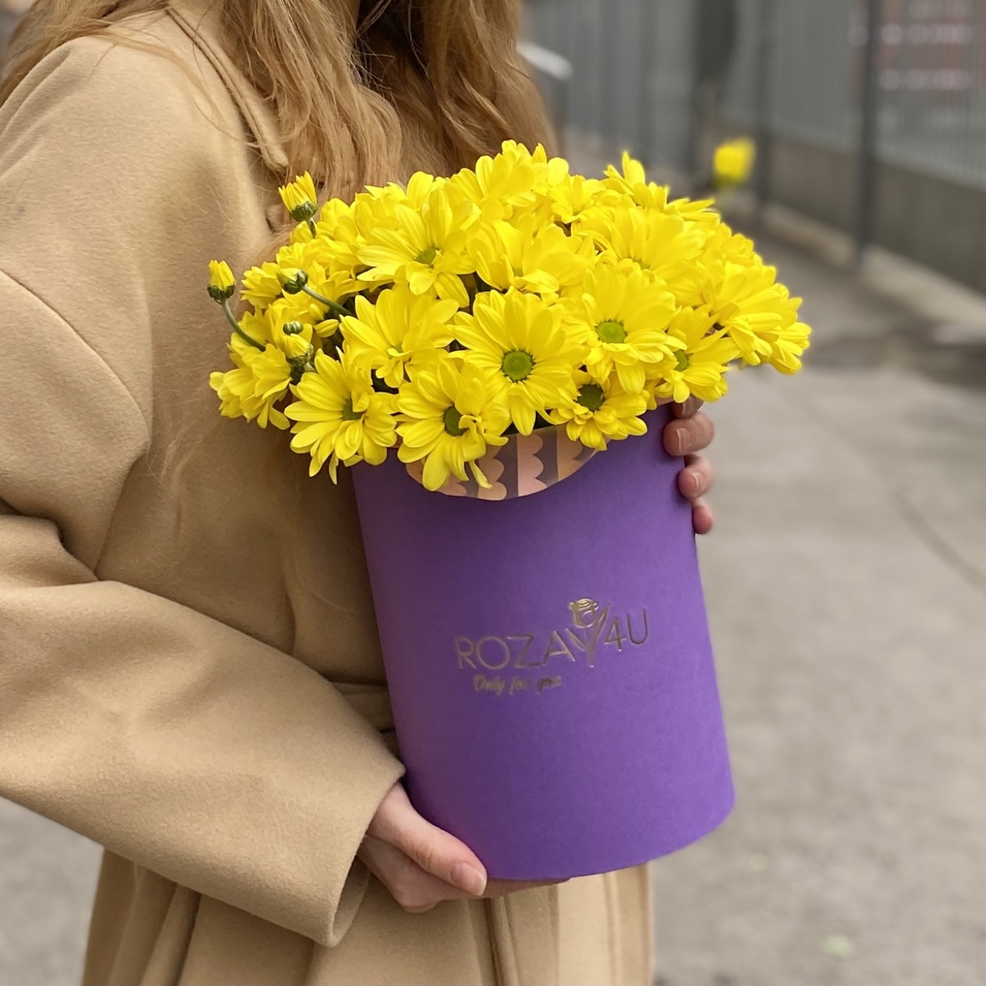 5 желтых хризантем в шляпной коробке станет оригинальным подарком.