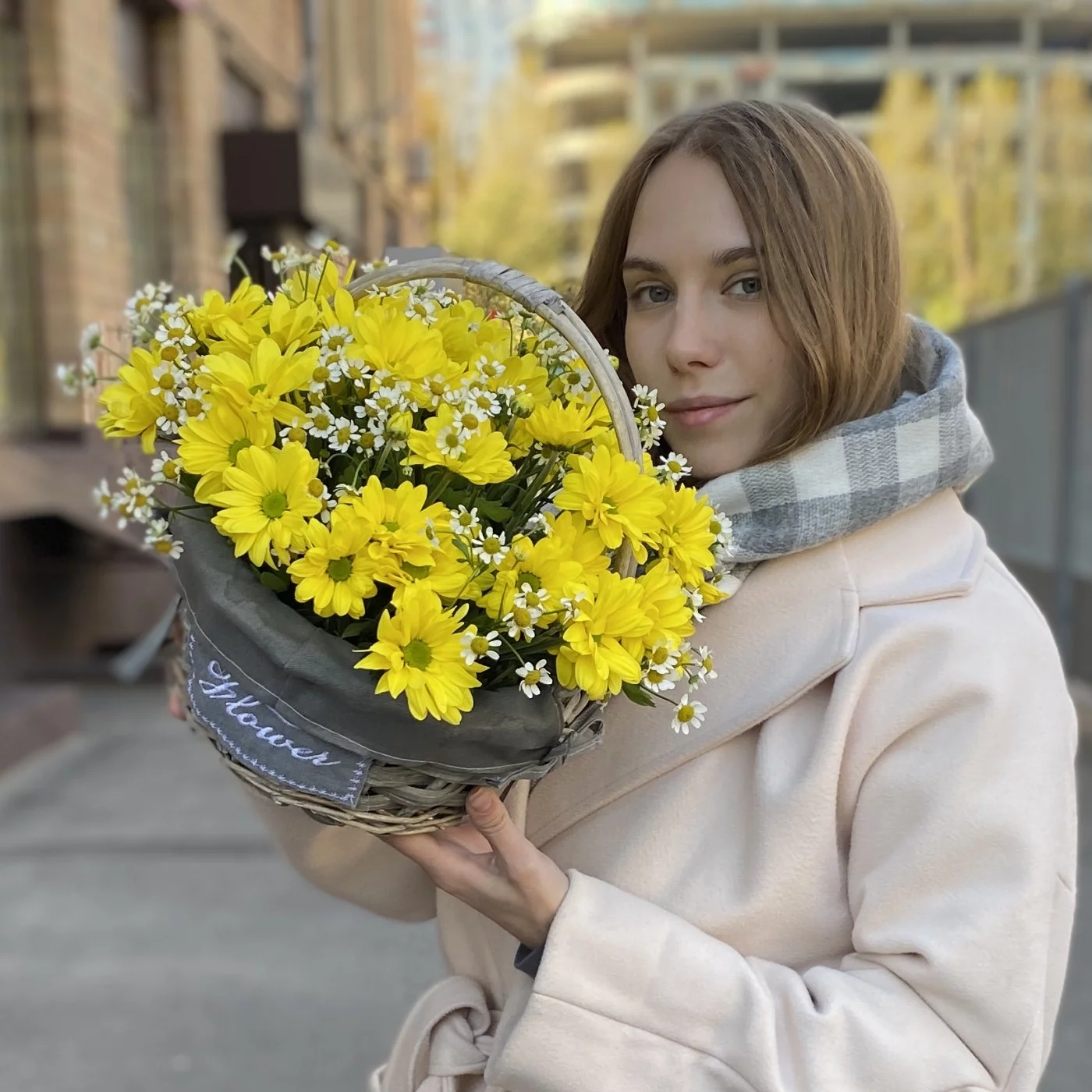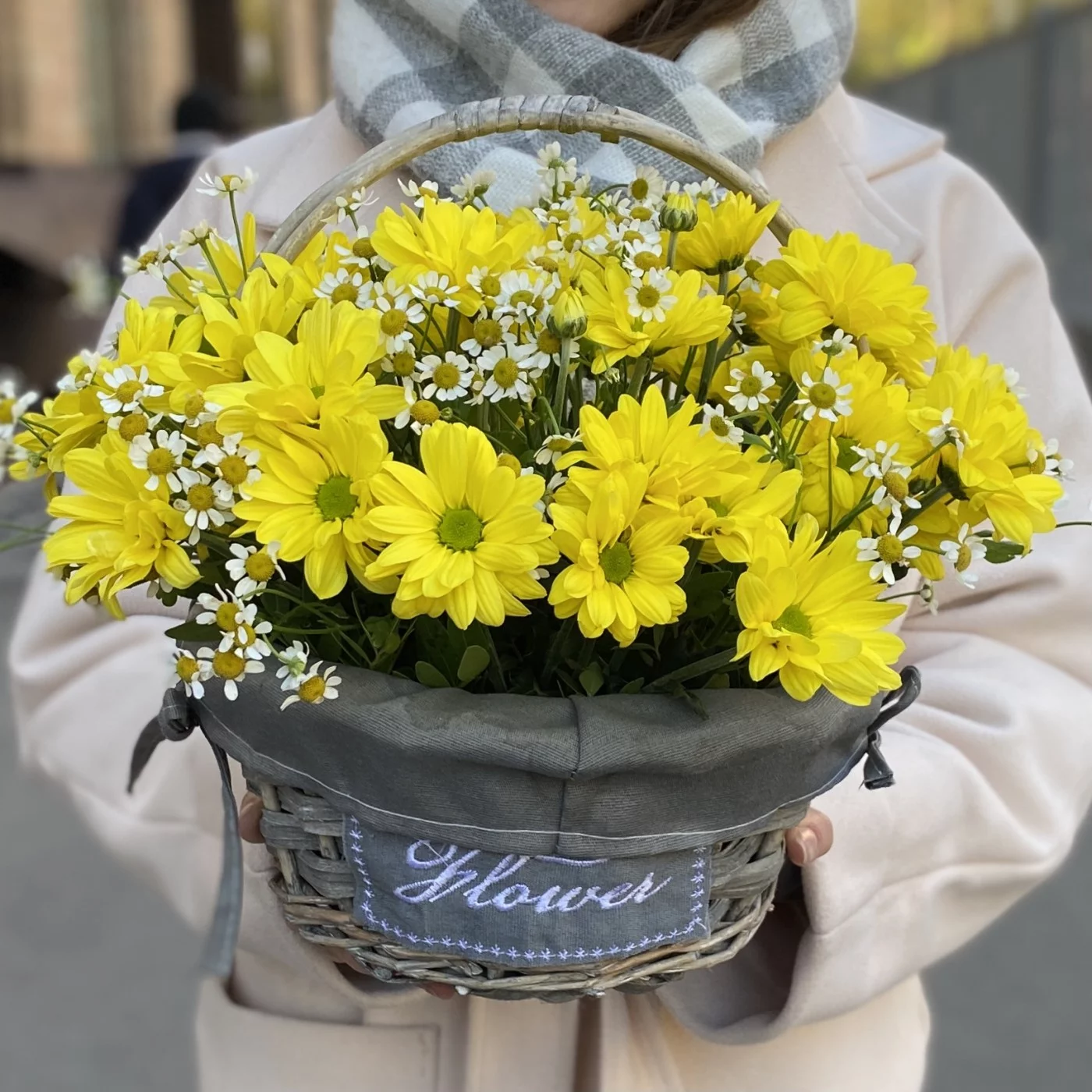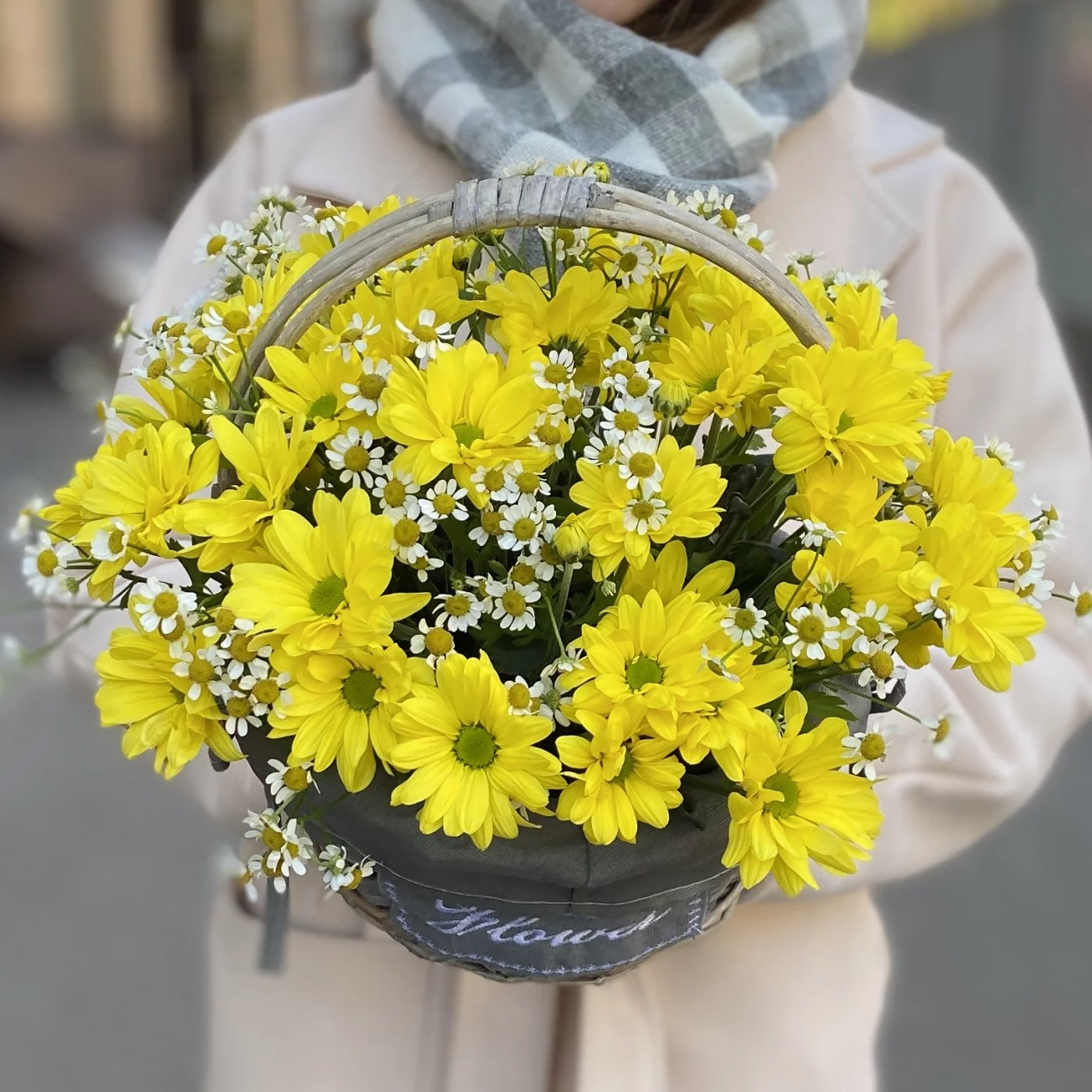 Букет из желтых кустовых хризантем с ромашками в корзине — это отличный выбор для подарка, который подарит радость и позитивные эмоции. Такой яркий и жизнеутверждающий букет украсит любой праздник, собираясь на столе или становясь прекрасным элементом декора!