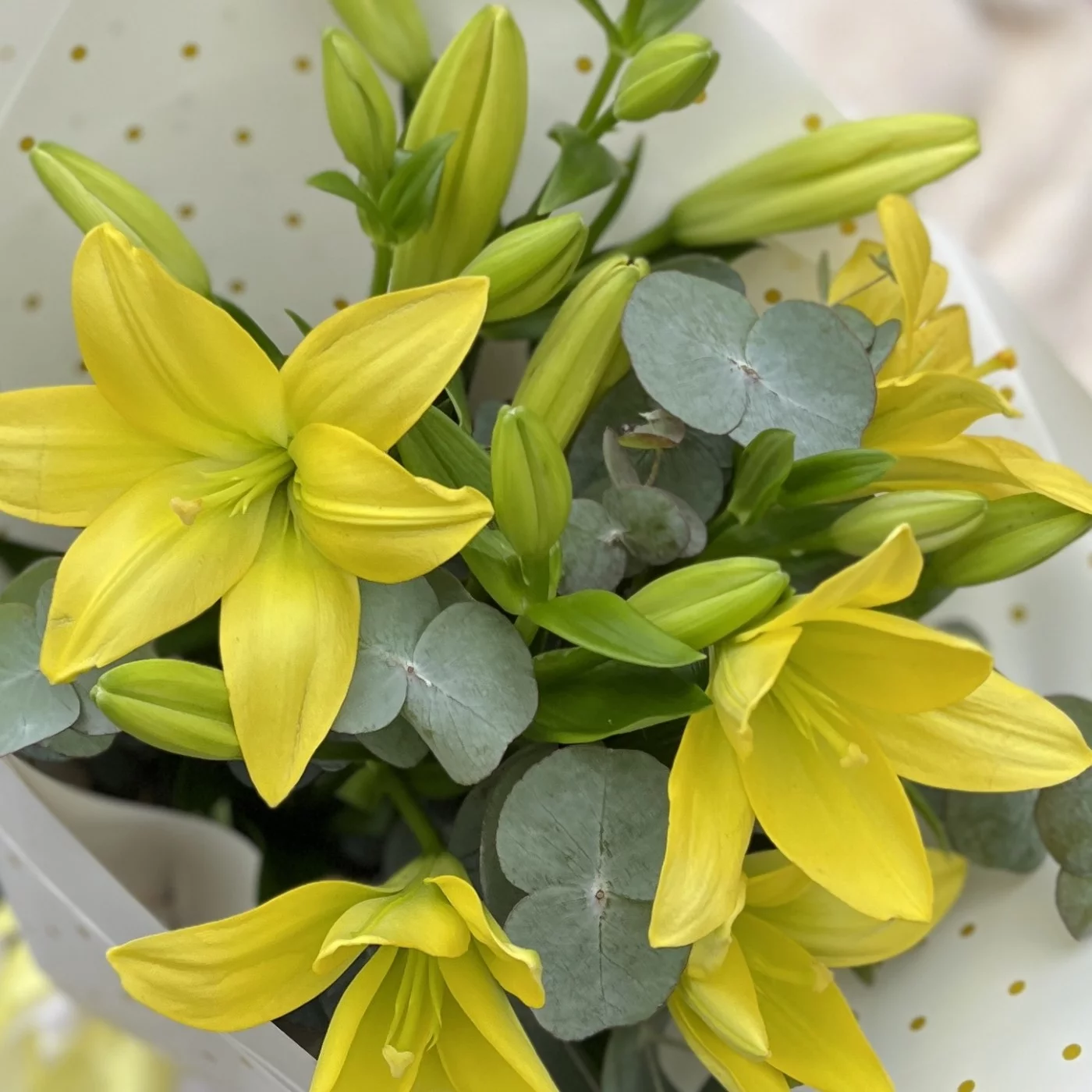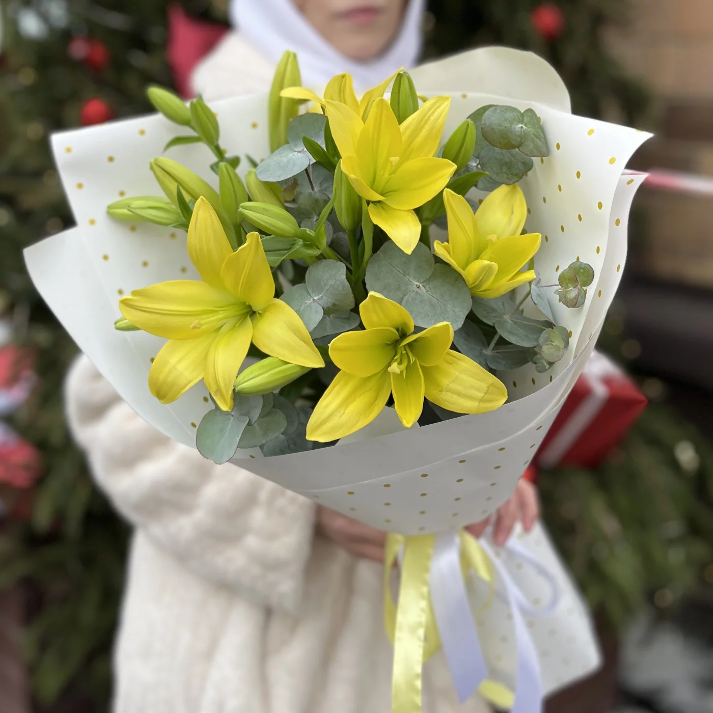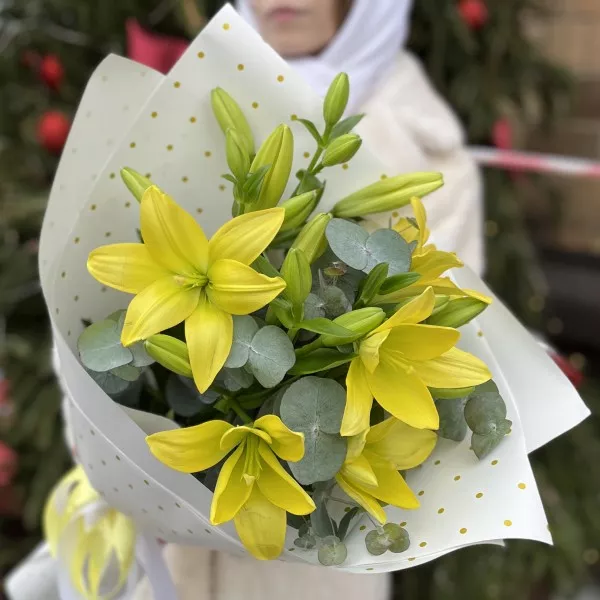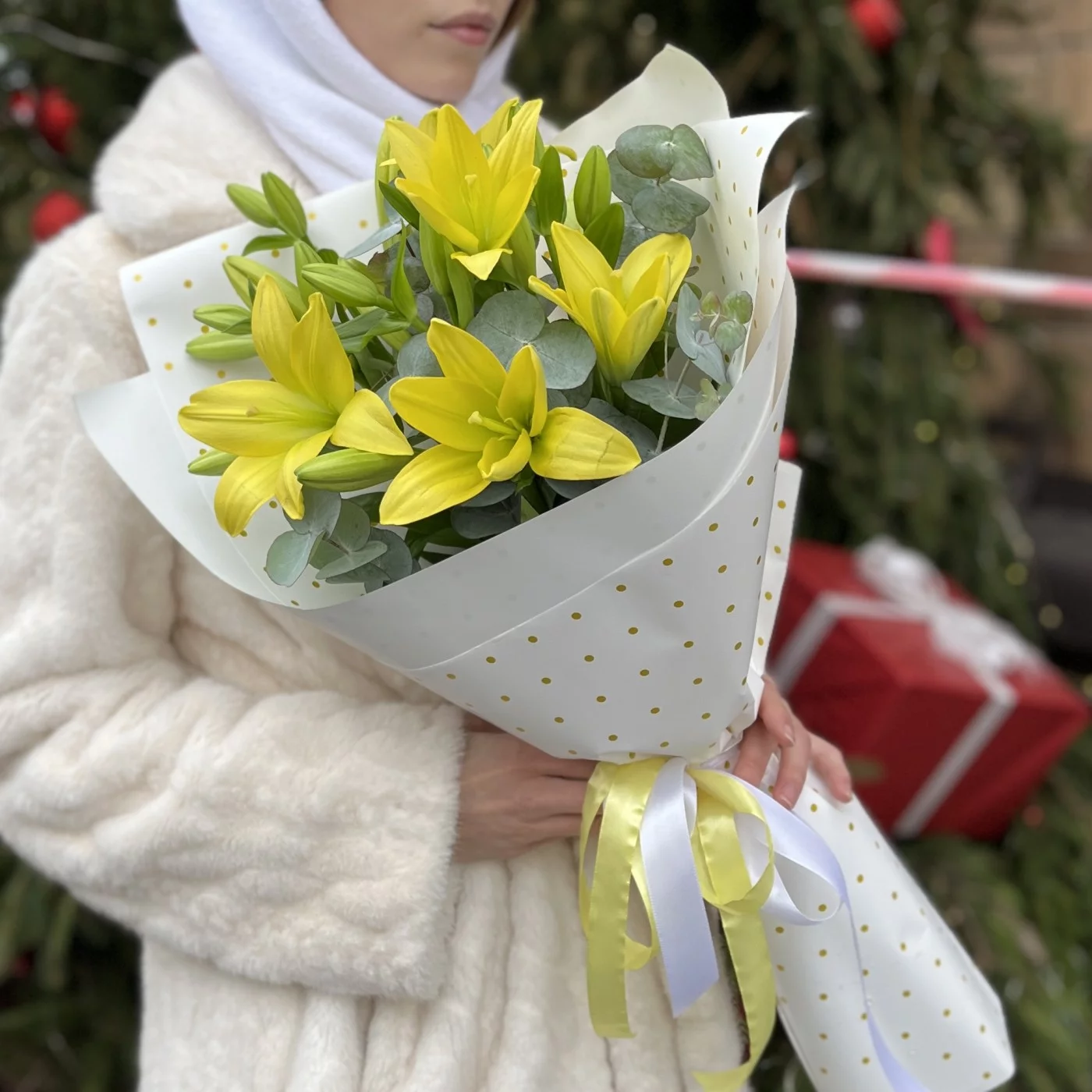 Букет из 5 желтых лилий с эвкалиптом — это не только живое украшение, но и символ радости и счастья. Его яркие цвета и пленительный аромат наполнят ваше пространство теплом и позитивом, радуя глаз и поднимая настроение.