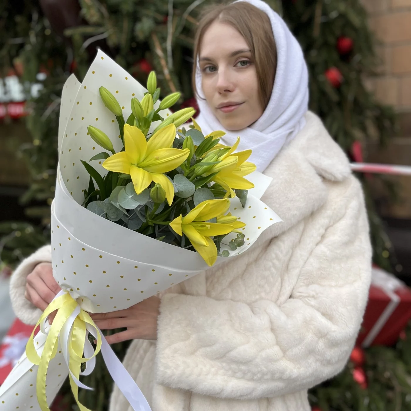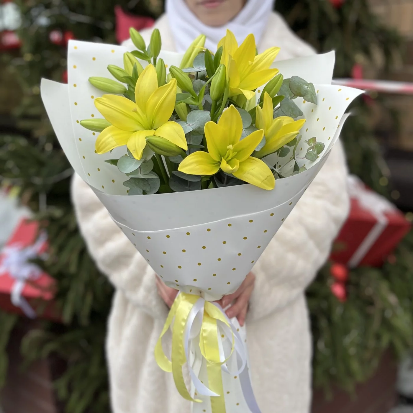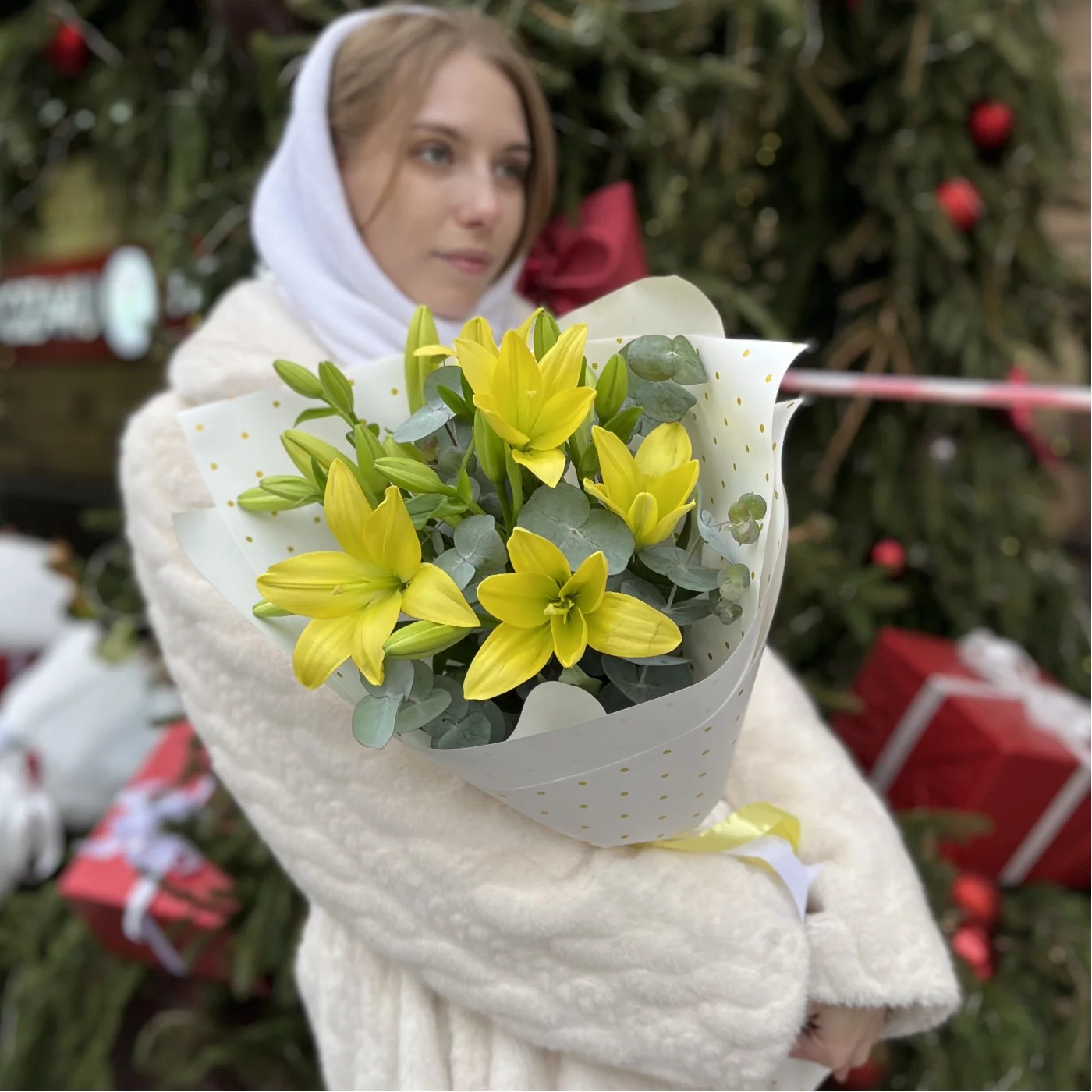 Букет из 5 желтых лилий с эвкалиптом — это не только живое украшение, но и символ радости и счастья. Его яркие цвета и пленительный аромат наполнят ваше пространство теплом и позитивом, радуя глаз и поднимая настроение.