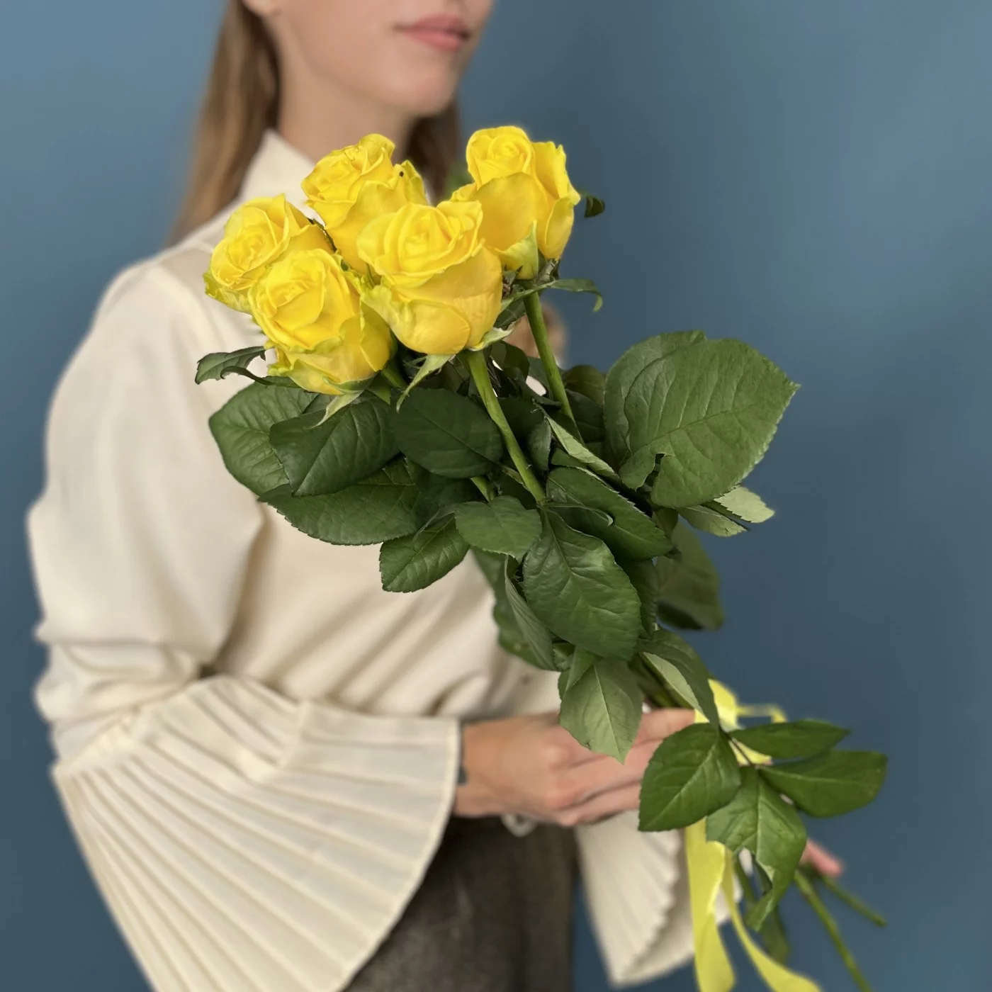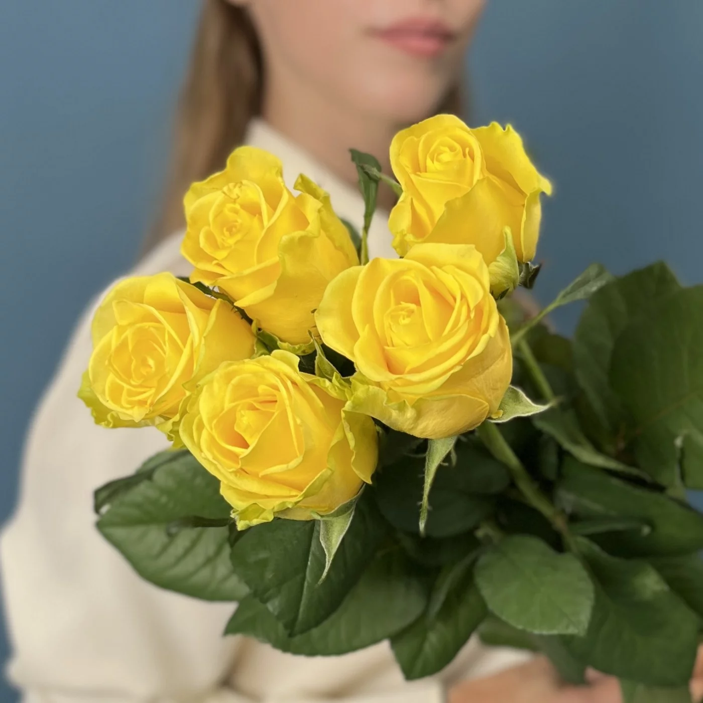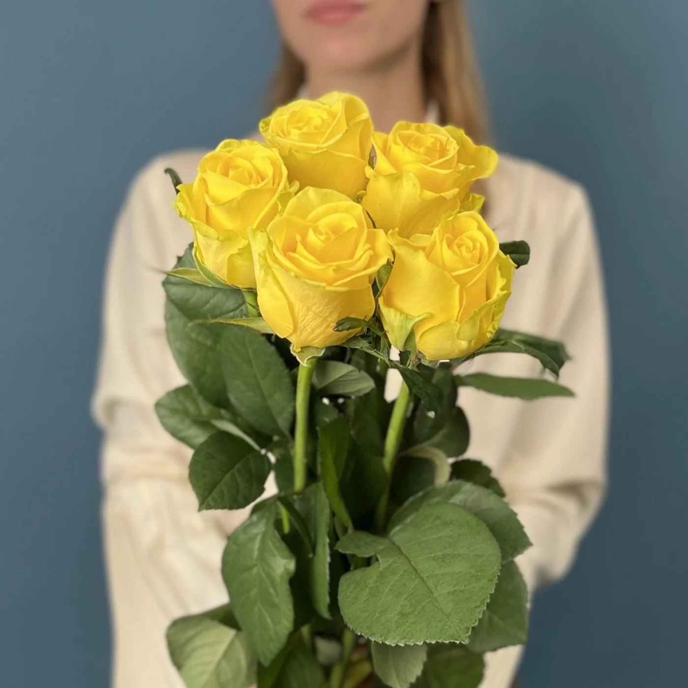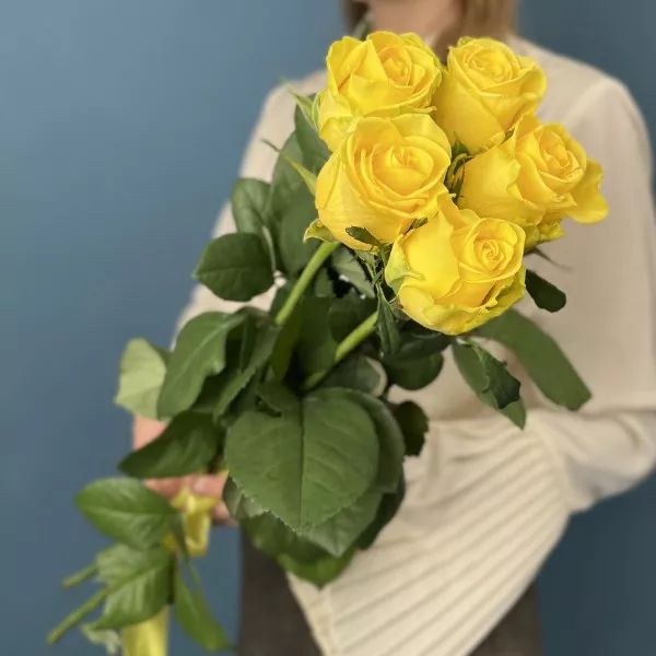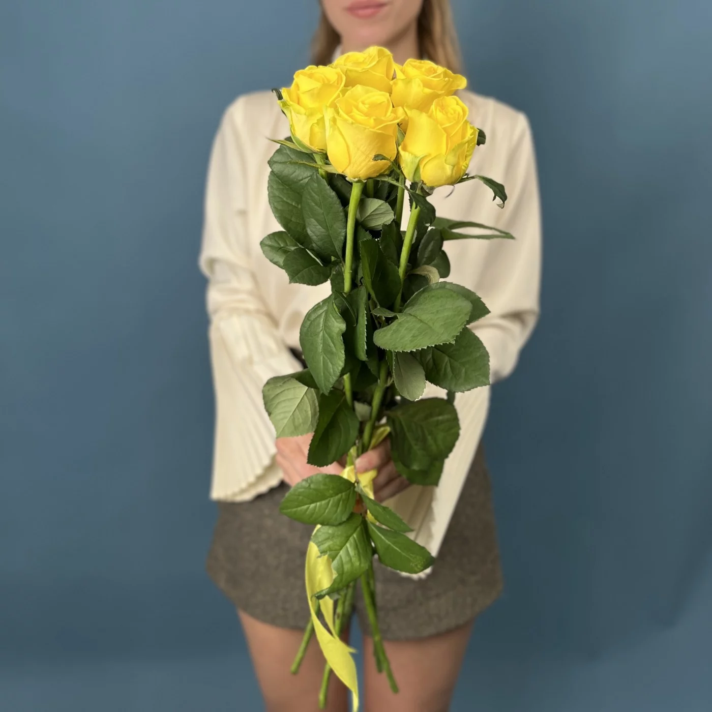 Изящный букет из 5 роз сорта Хай Еллоу яркого желтого цвета длиной 60 см — это солнечное и жизнерадостное воплощение тепла и оптимизма.