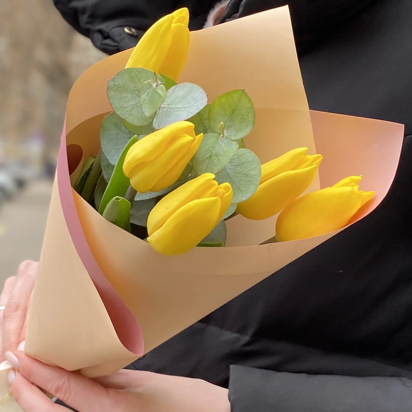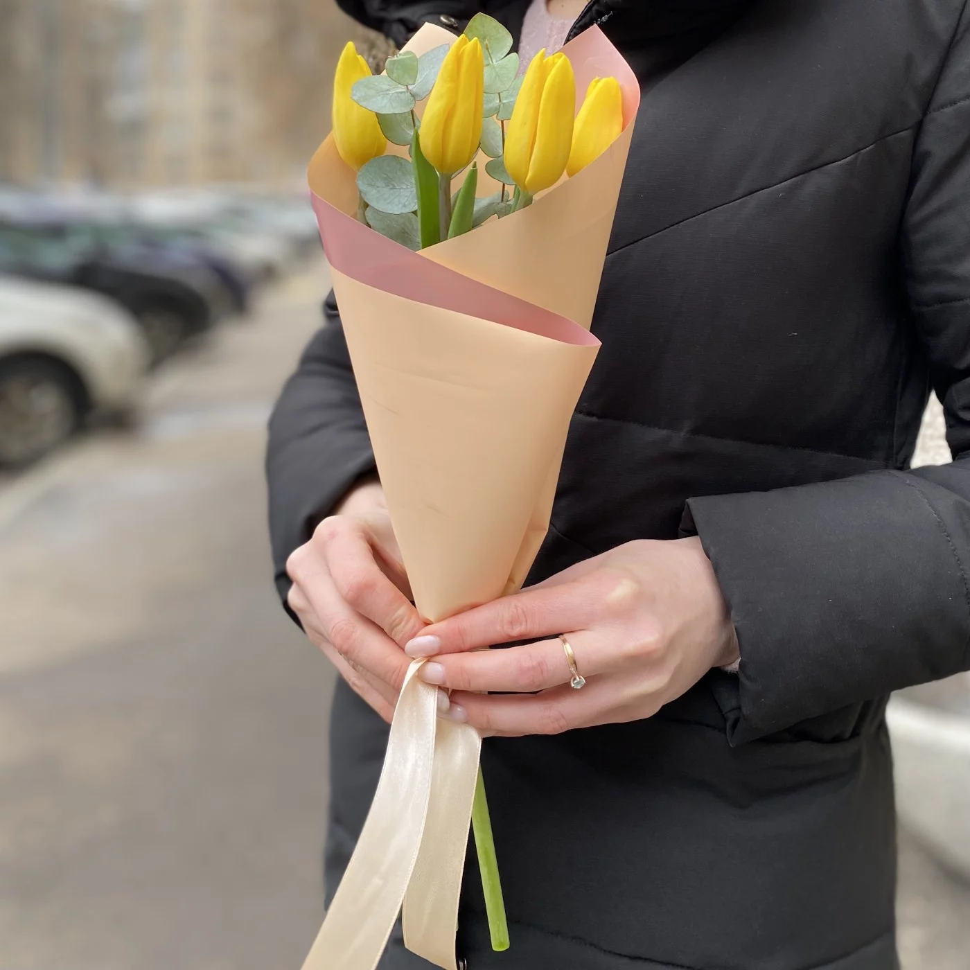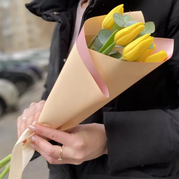 Мини букет из тюльпанов желтого цвета в стильной упаковке. Прекрасный корпоративный вариант подарка на 8 марта.