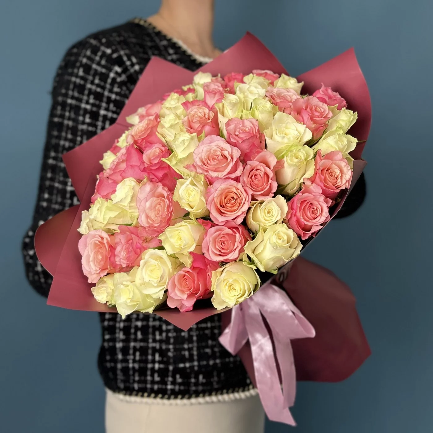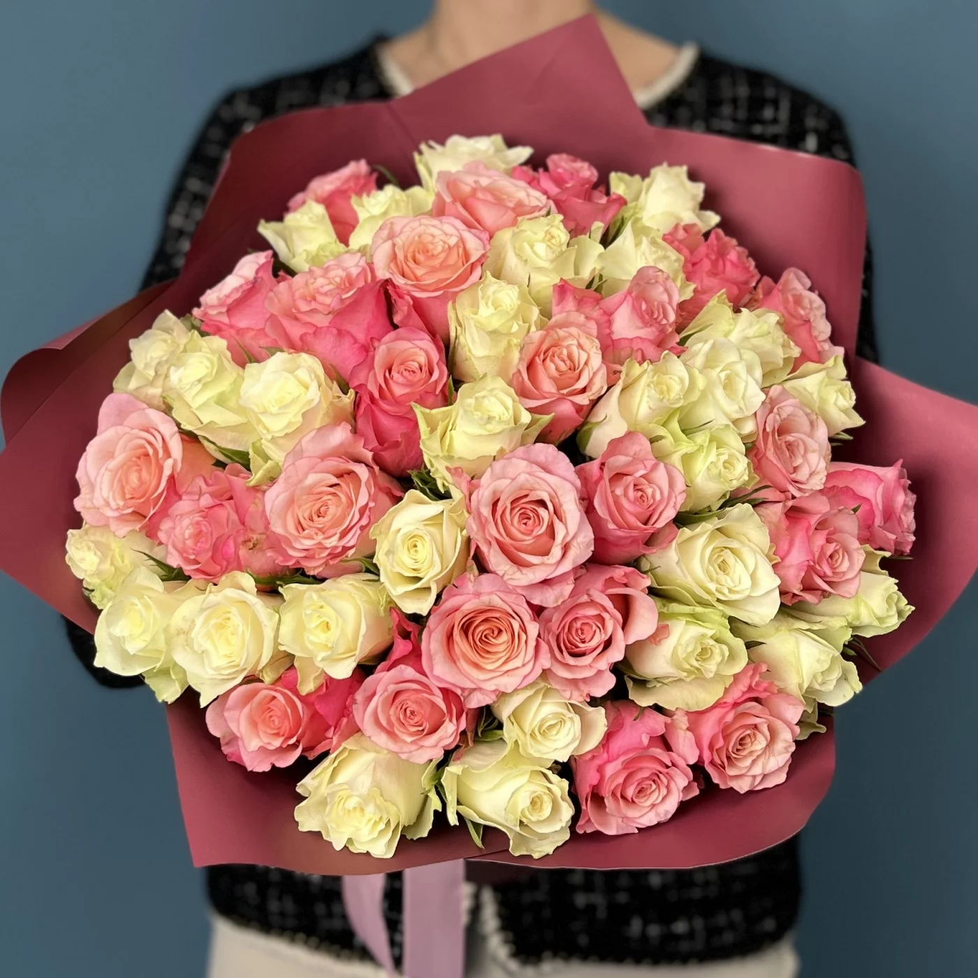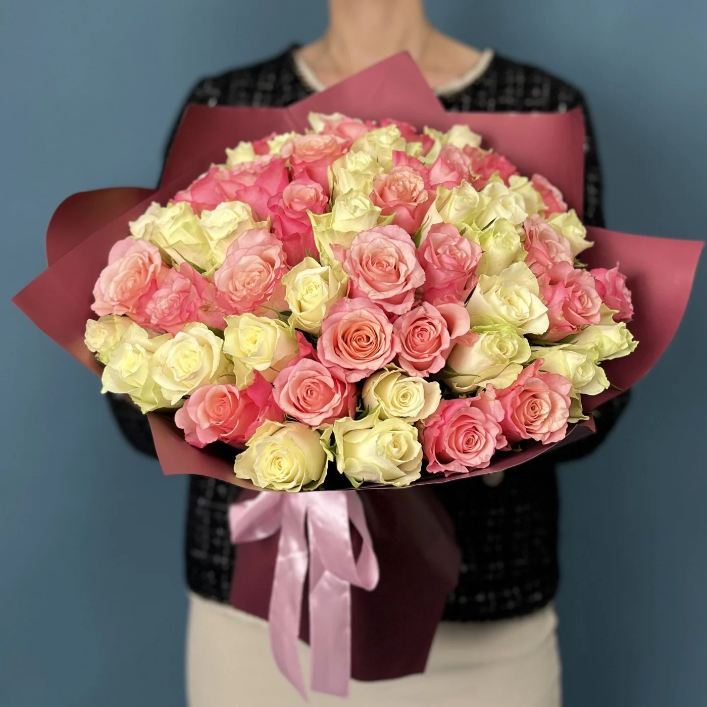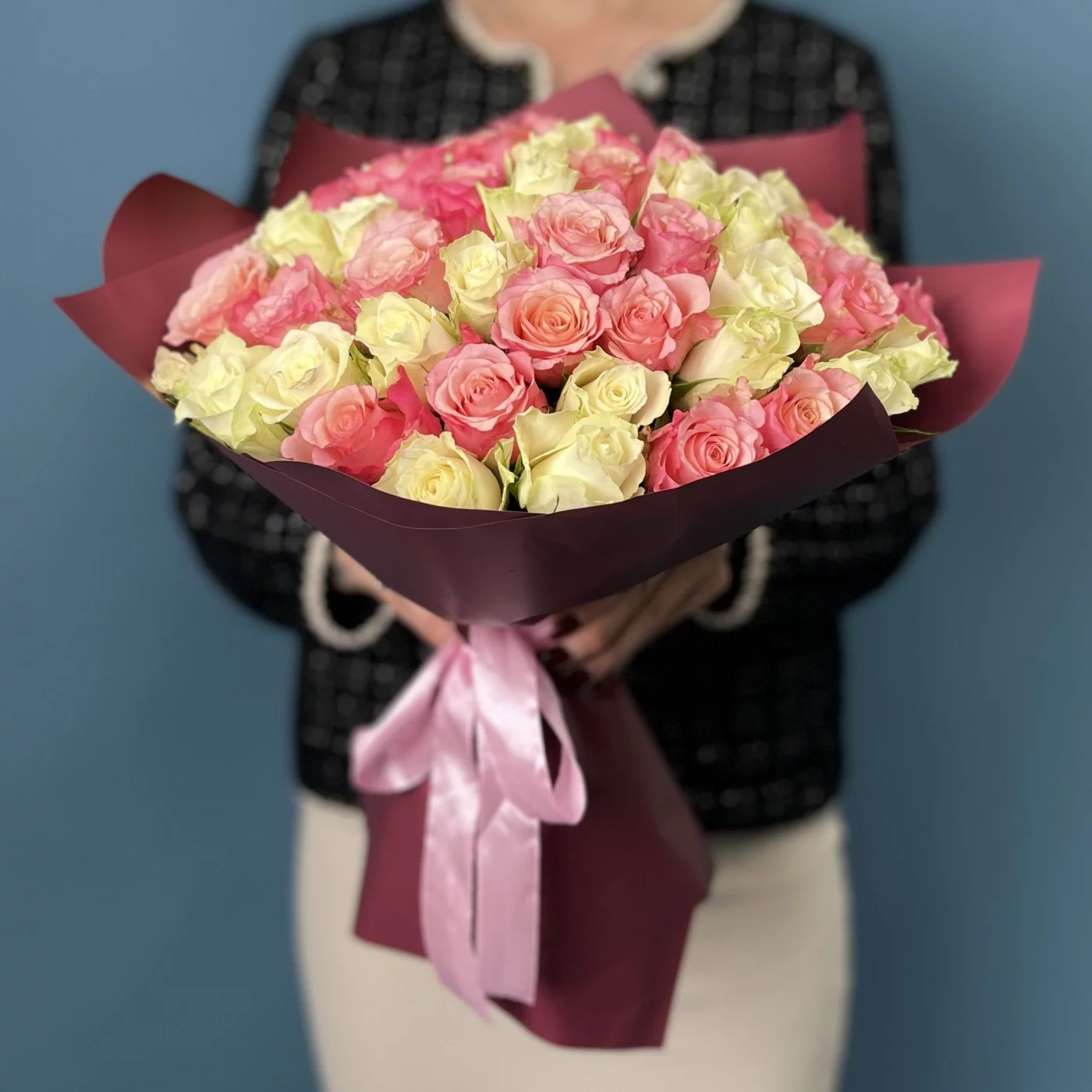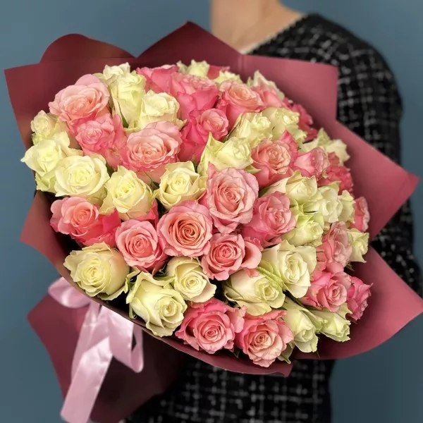Букет из 51 белой и розовой розы — изысканный и символичный подарок, который прекрасно подойдёт для особого случая, например, юбилея или важного праздника.