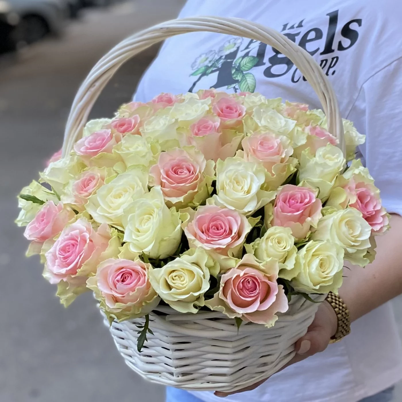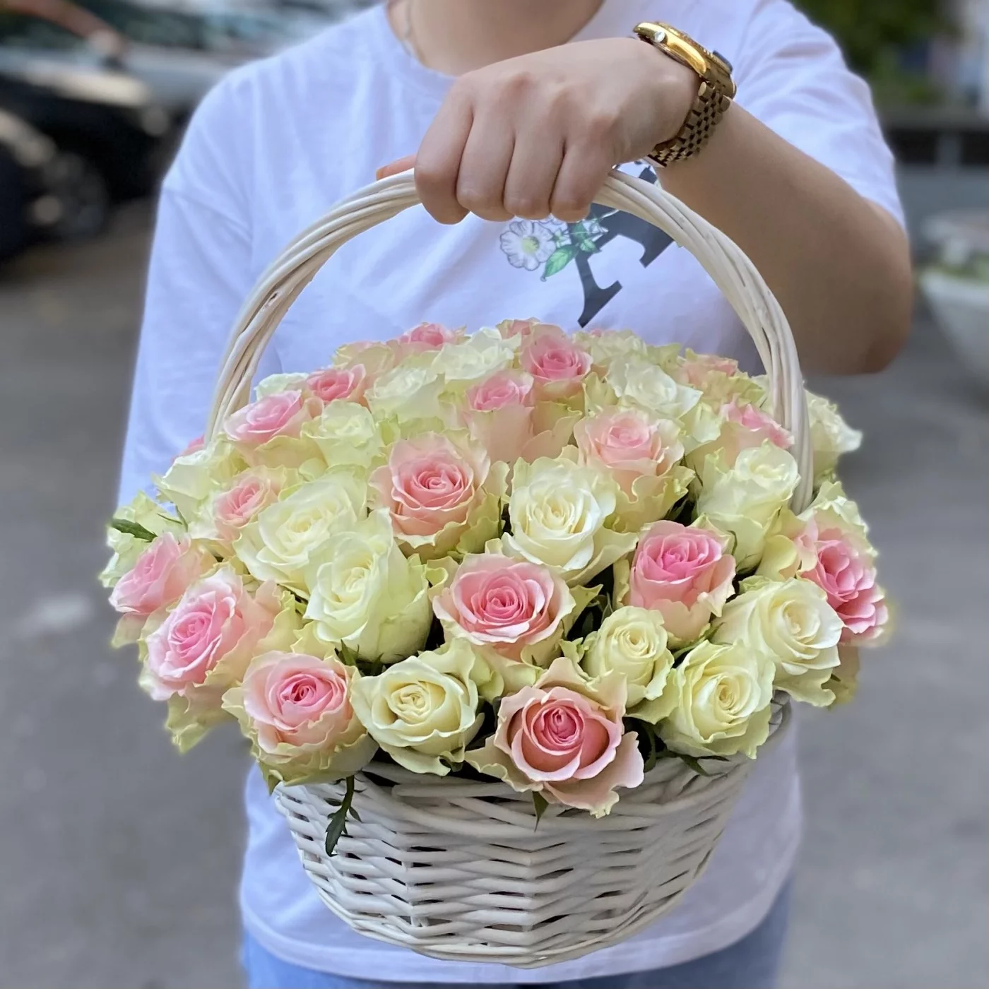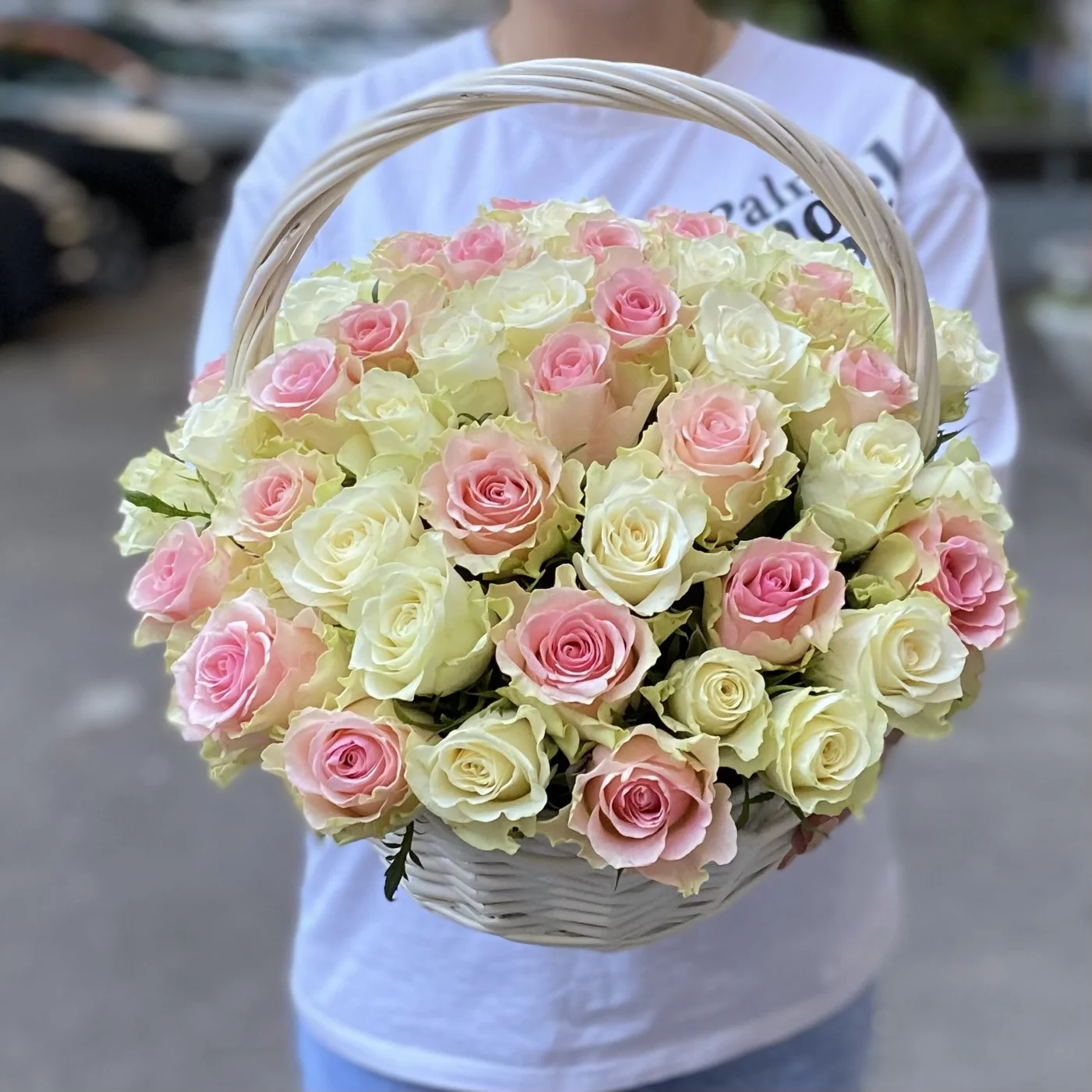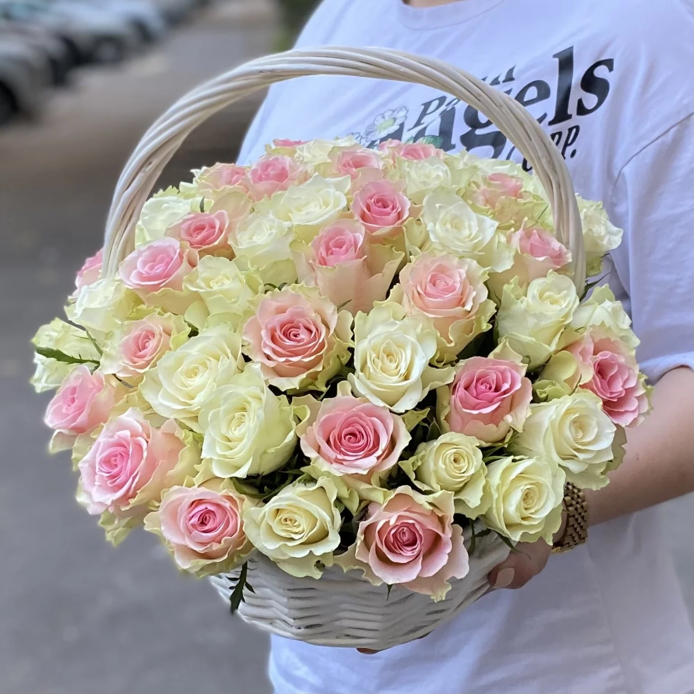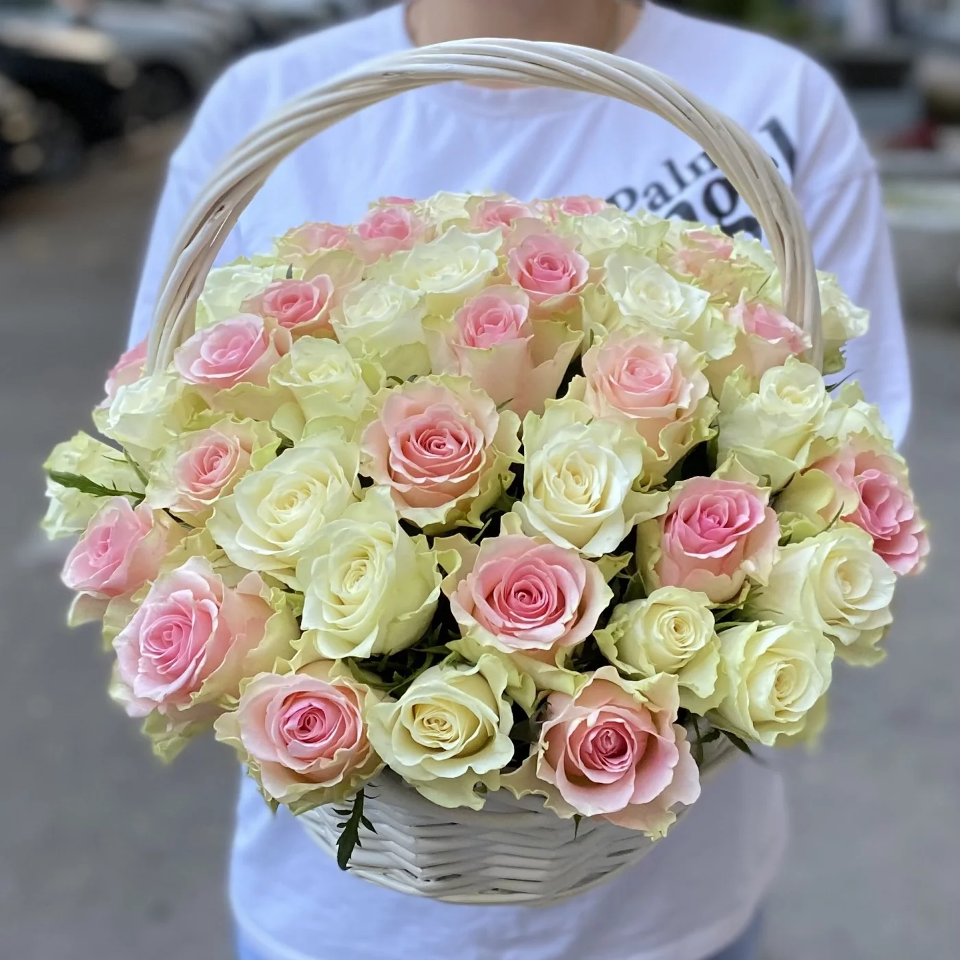 Нежная и роскошная корзина с белыми и розовыми розами, можно подарить не только на день рождения но и на свадьбу или прислать в качестве комплимента и поднятия настроения близкому человеку.