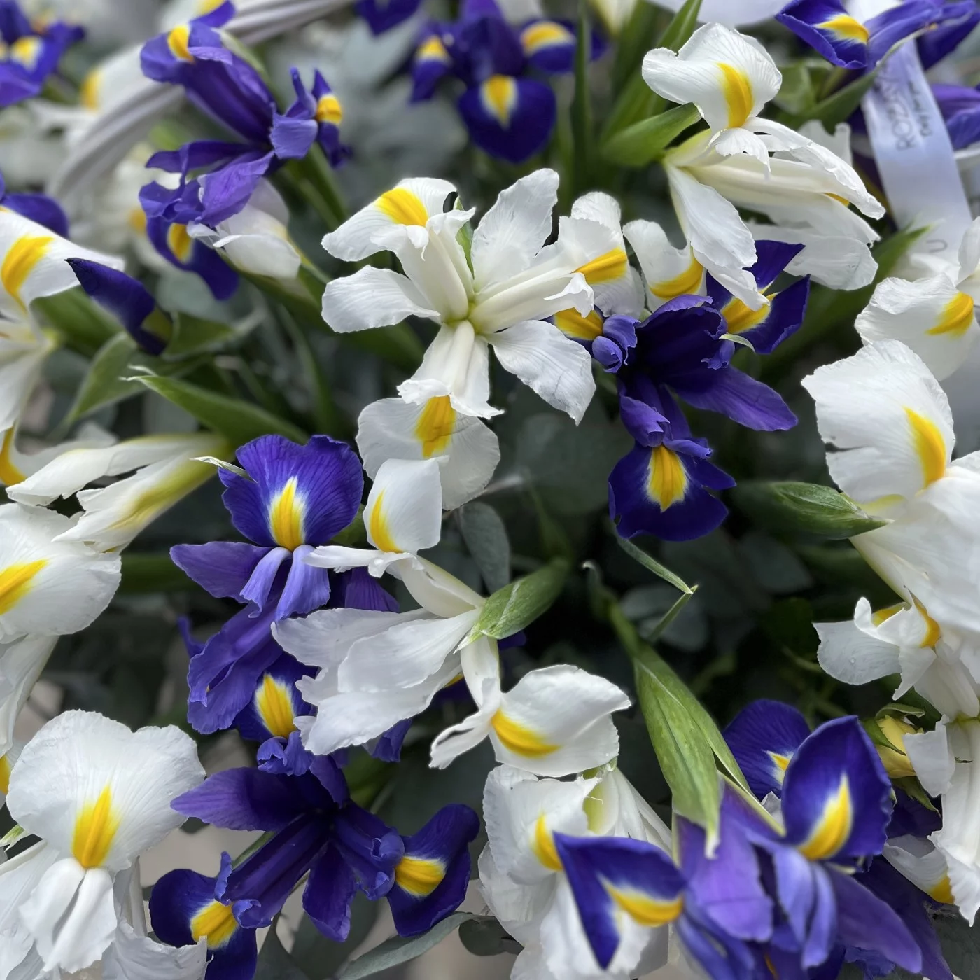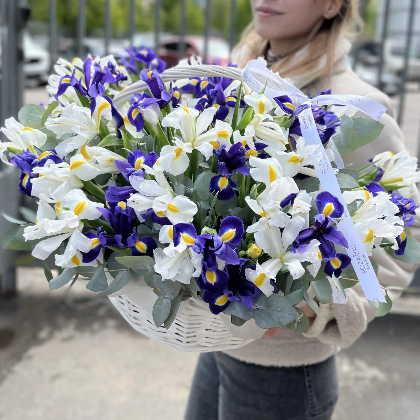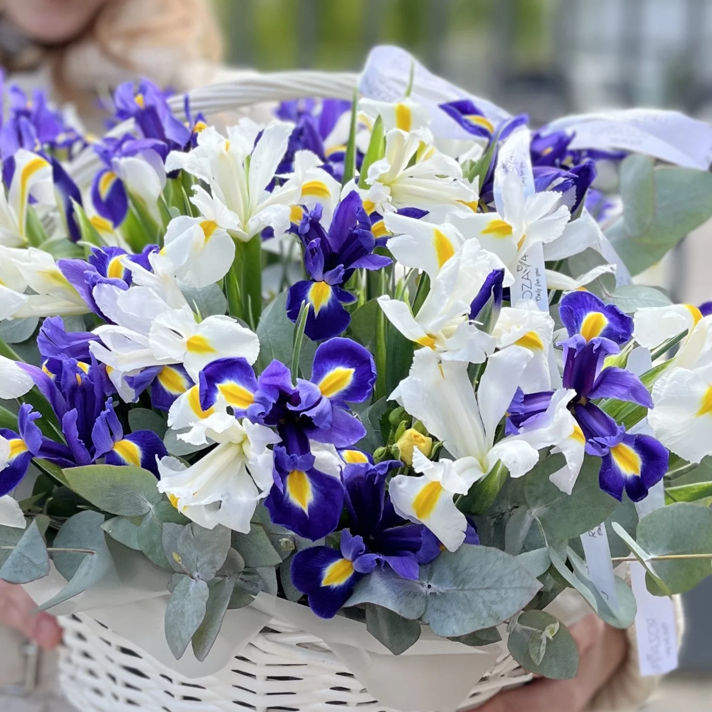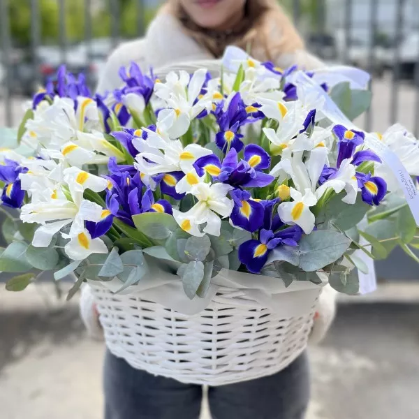 51 белый и синий ирис в корзине — это изысканное и элегантное сочетание, которое символизирует чистоту, верность, вдохновение и таинственность. Такой букет станет прекрасным подарком для особых случаев.