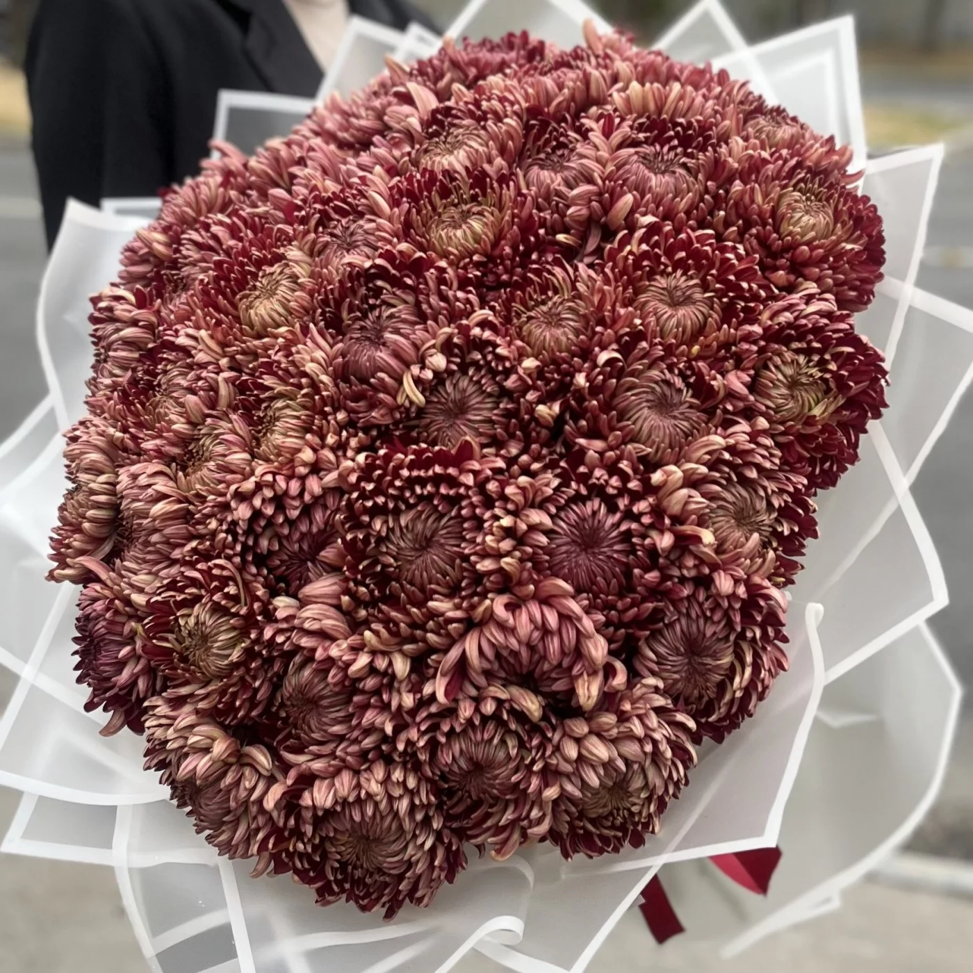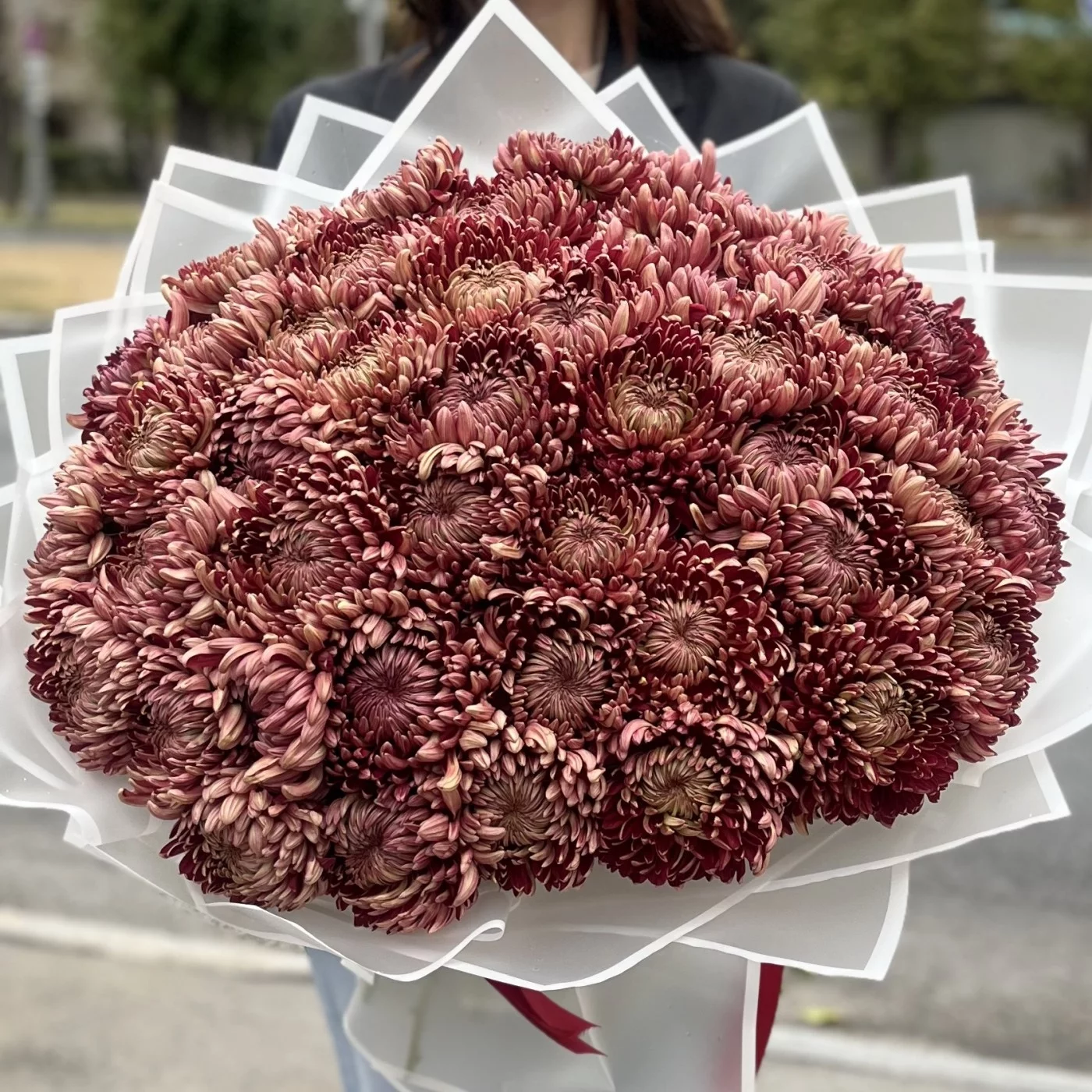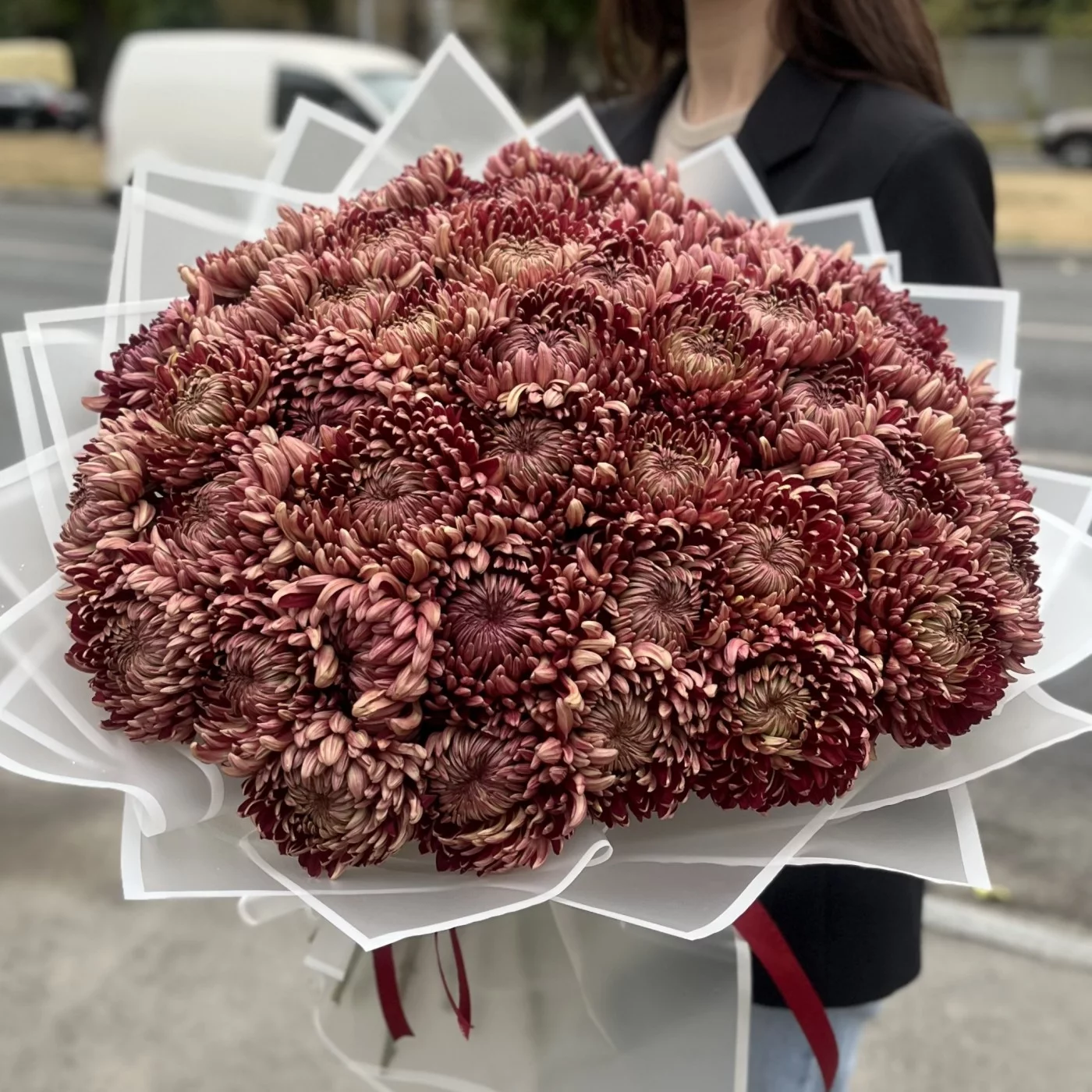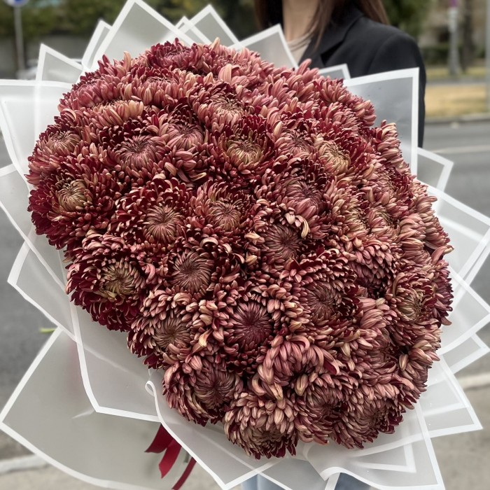 Букет из 51 крупной бордовой хризантемы не оставит свою получательницу равнодушной. Такой букет отлично подойдет на юбилей или День рождения.