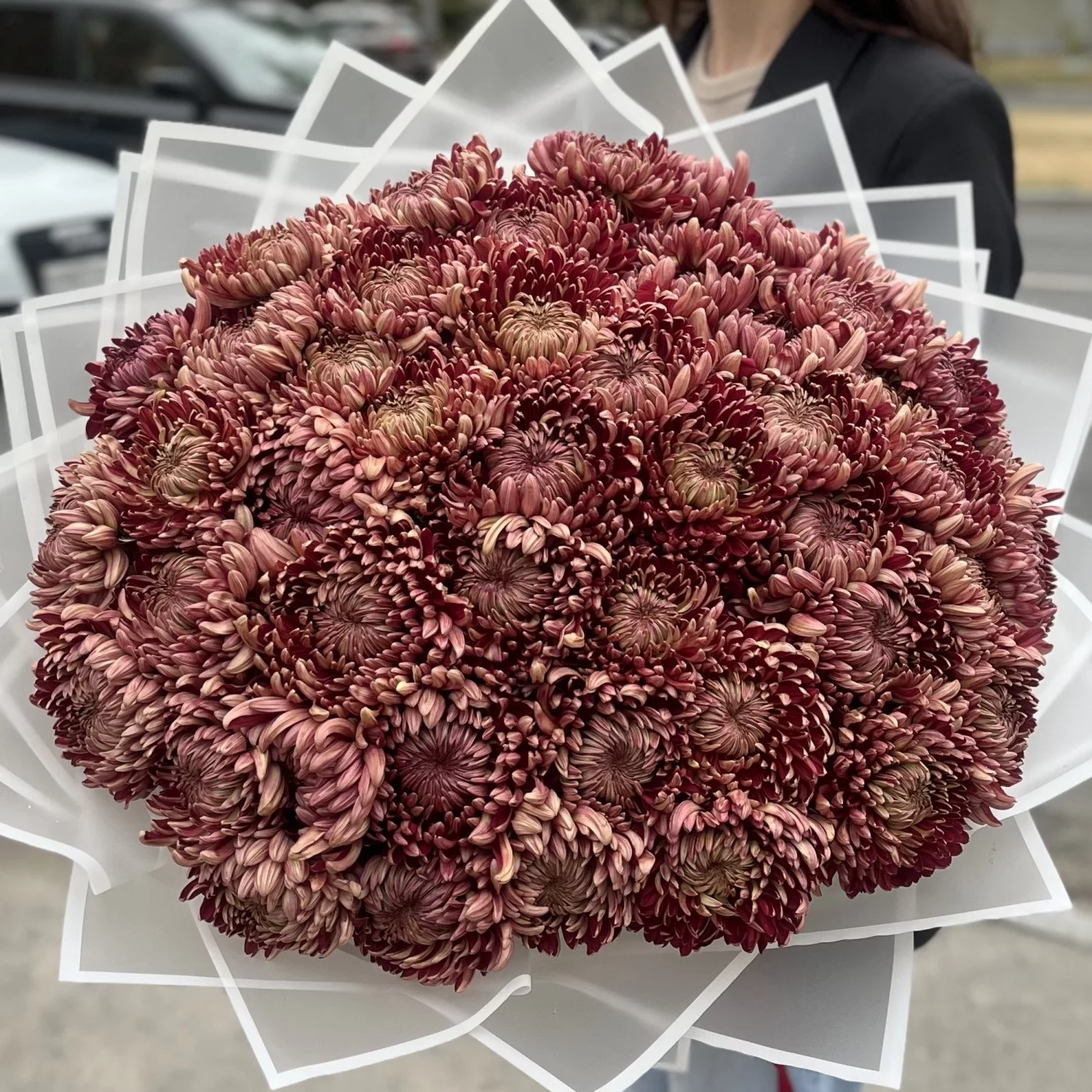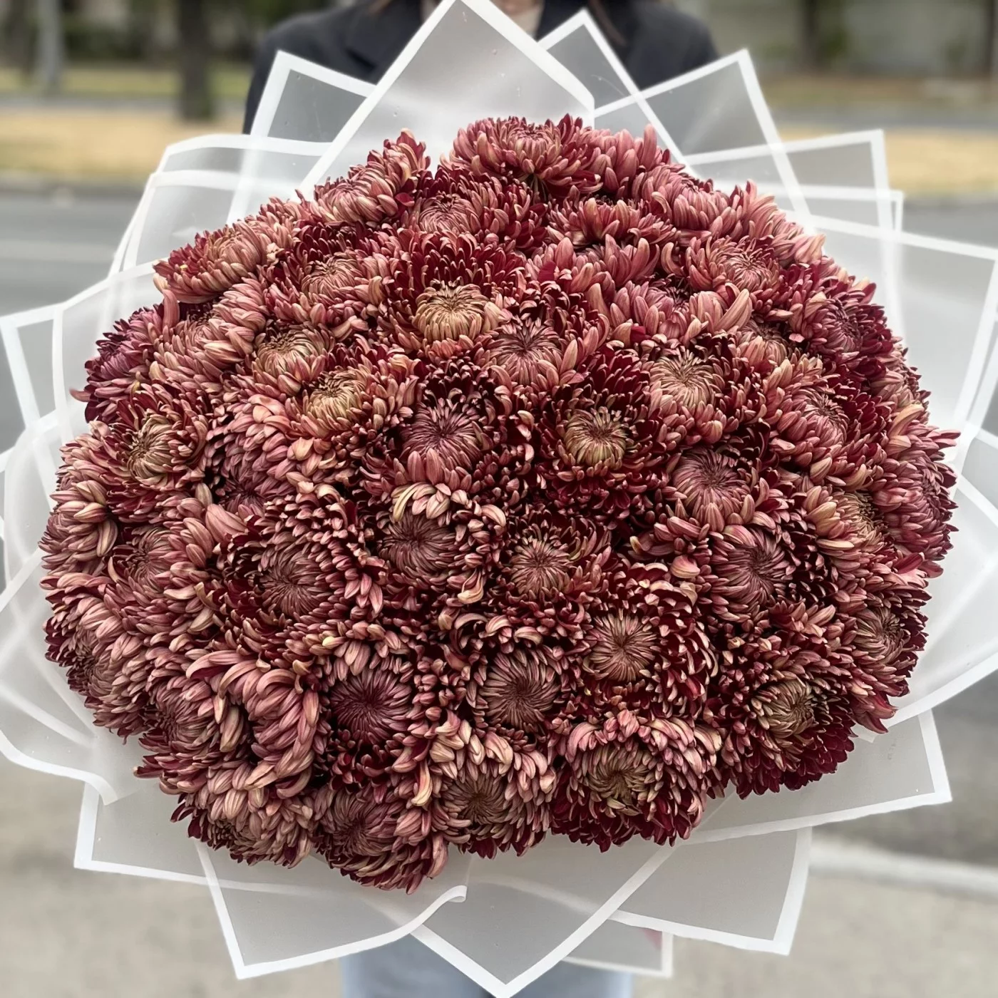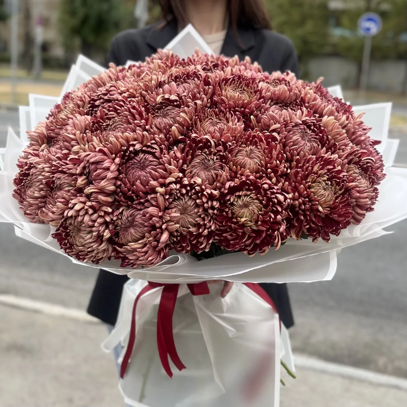 Букет из 51 крупной бордовой хризантемы не оставит свою получательницу равнодушной. Такой букет отлично подойдет на юбилей или День рождения.