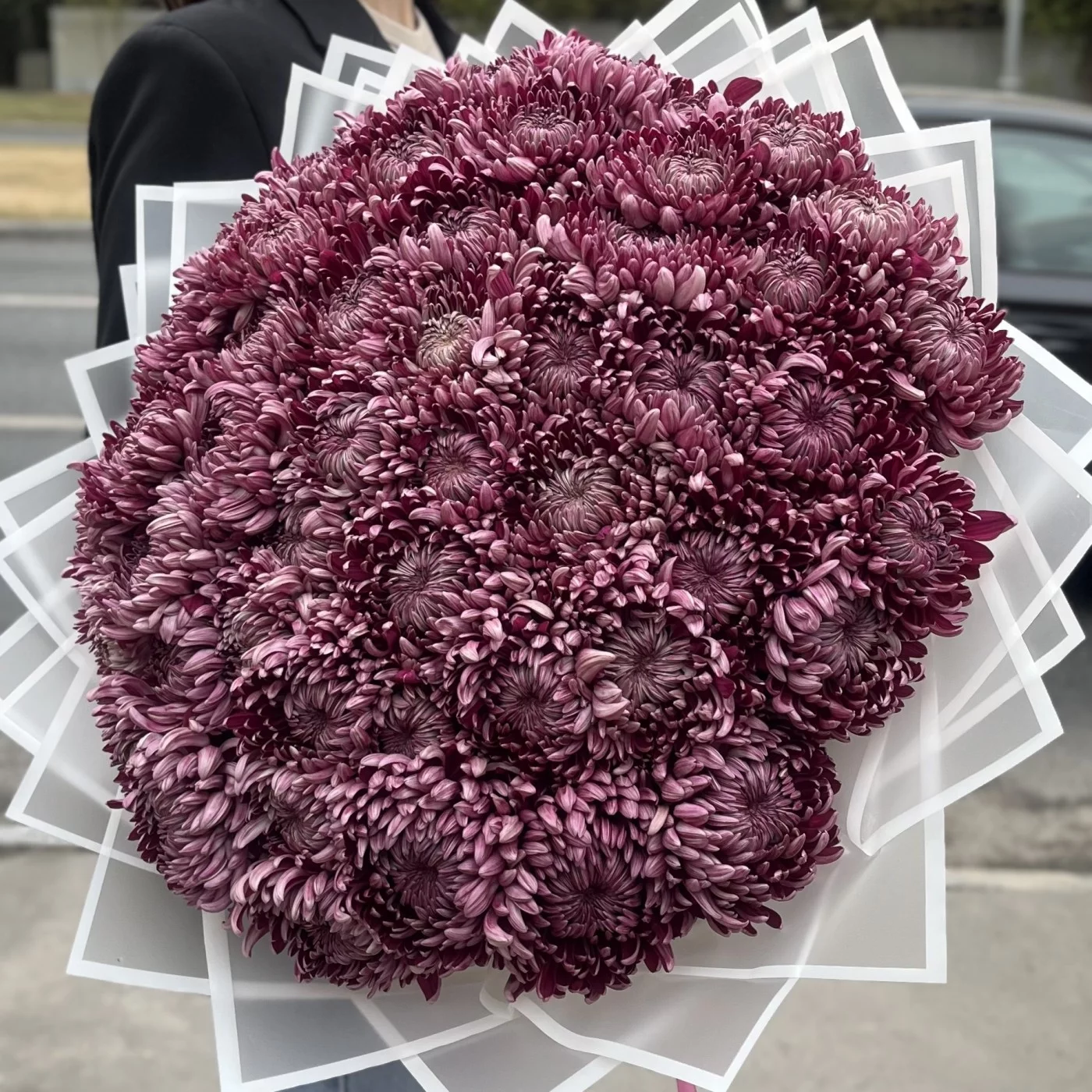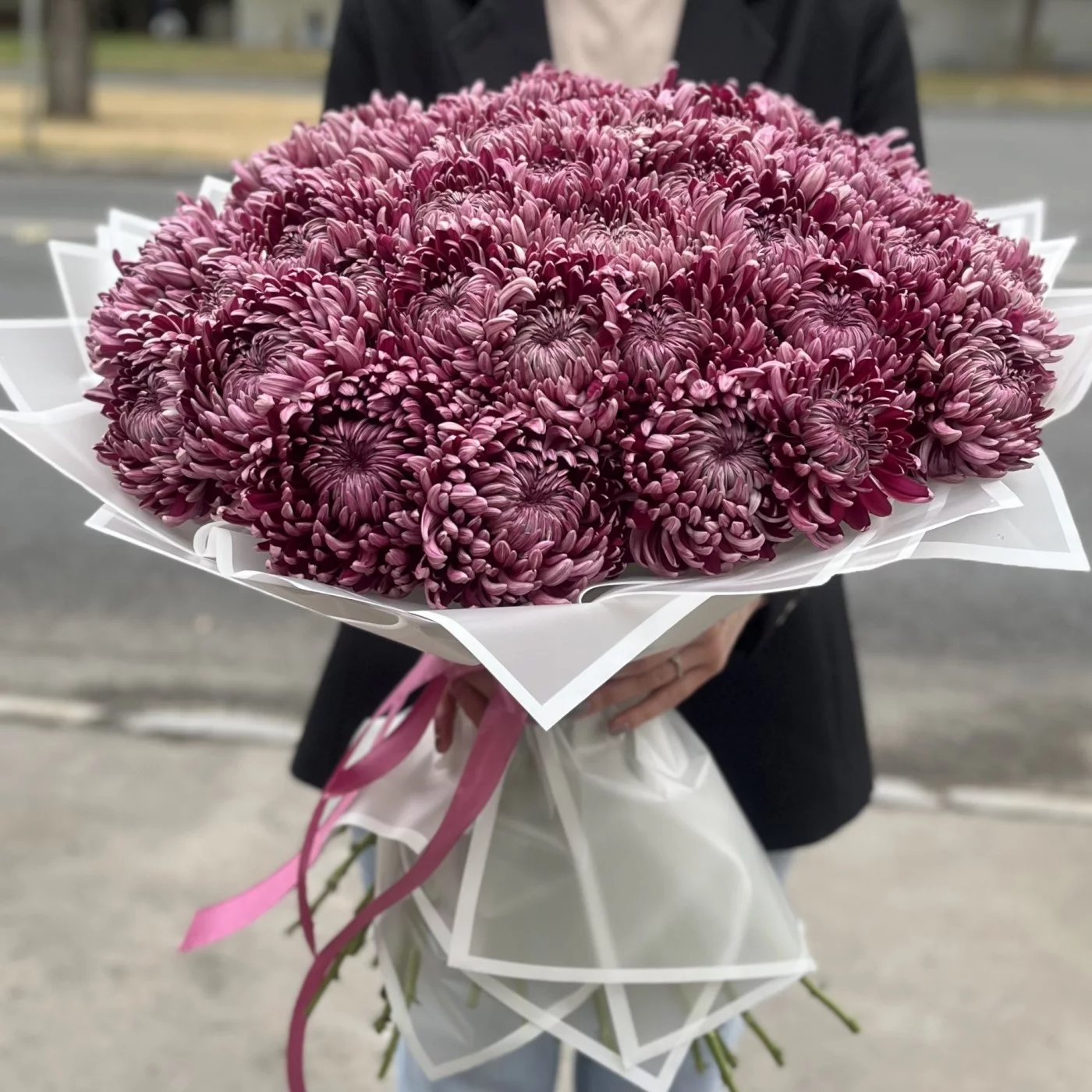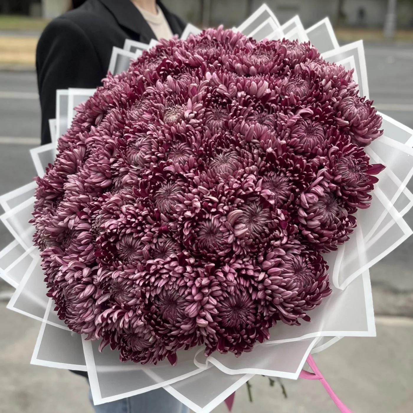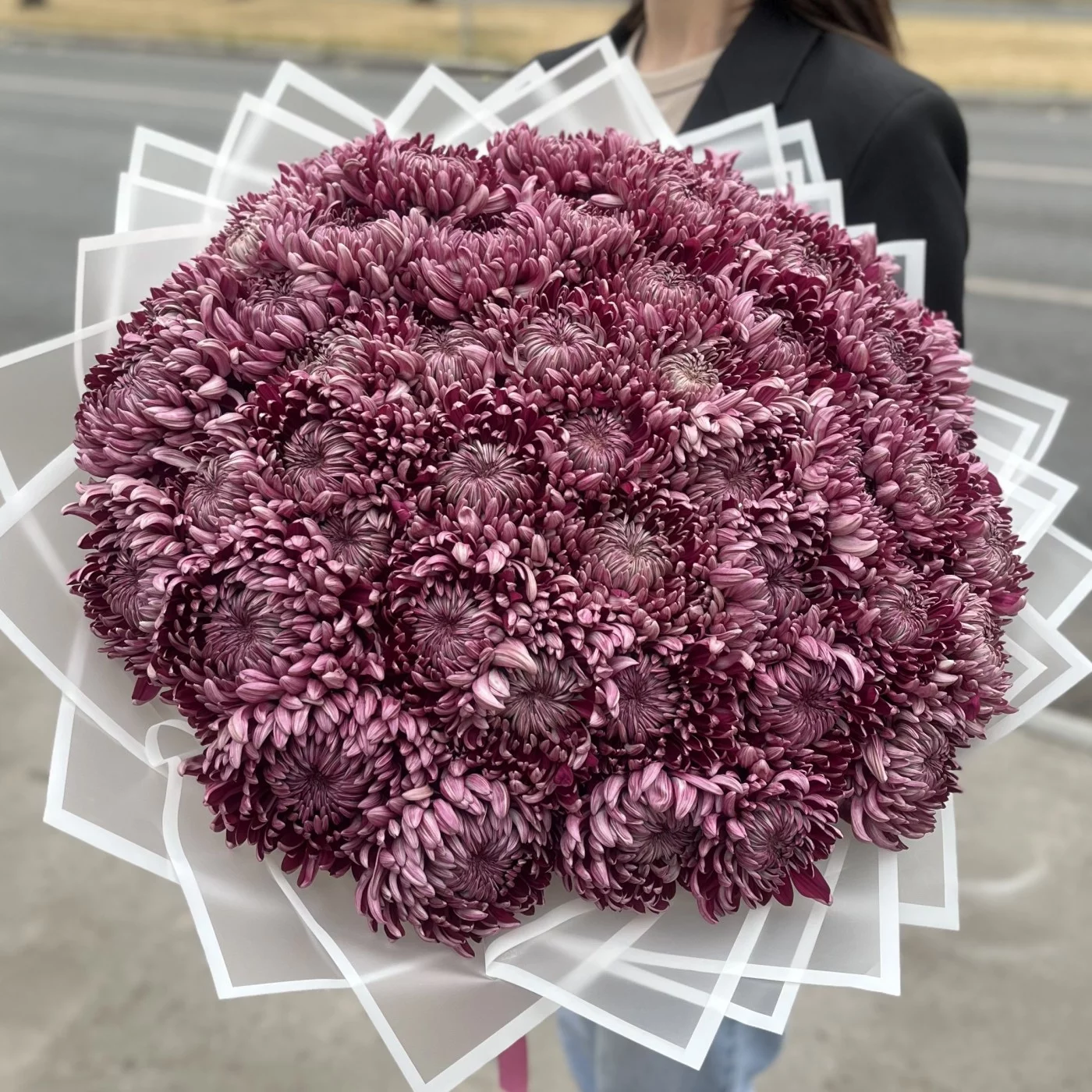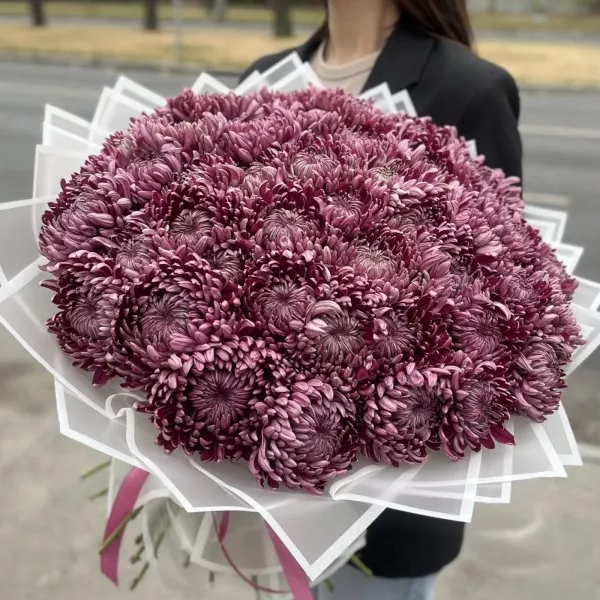 Шикарный букет из 51 крупной фиолетовой хризантемы не оставит свою получательницу равнодушной.