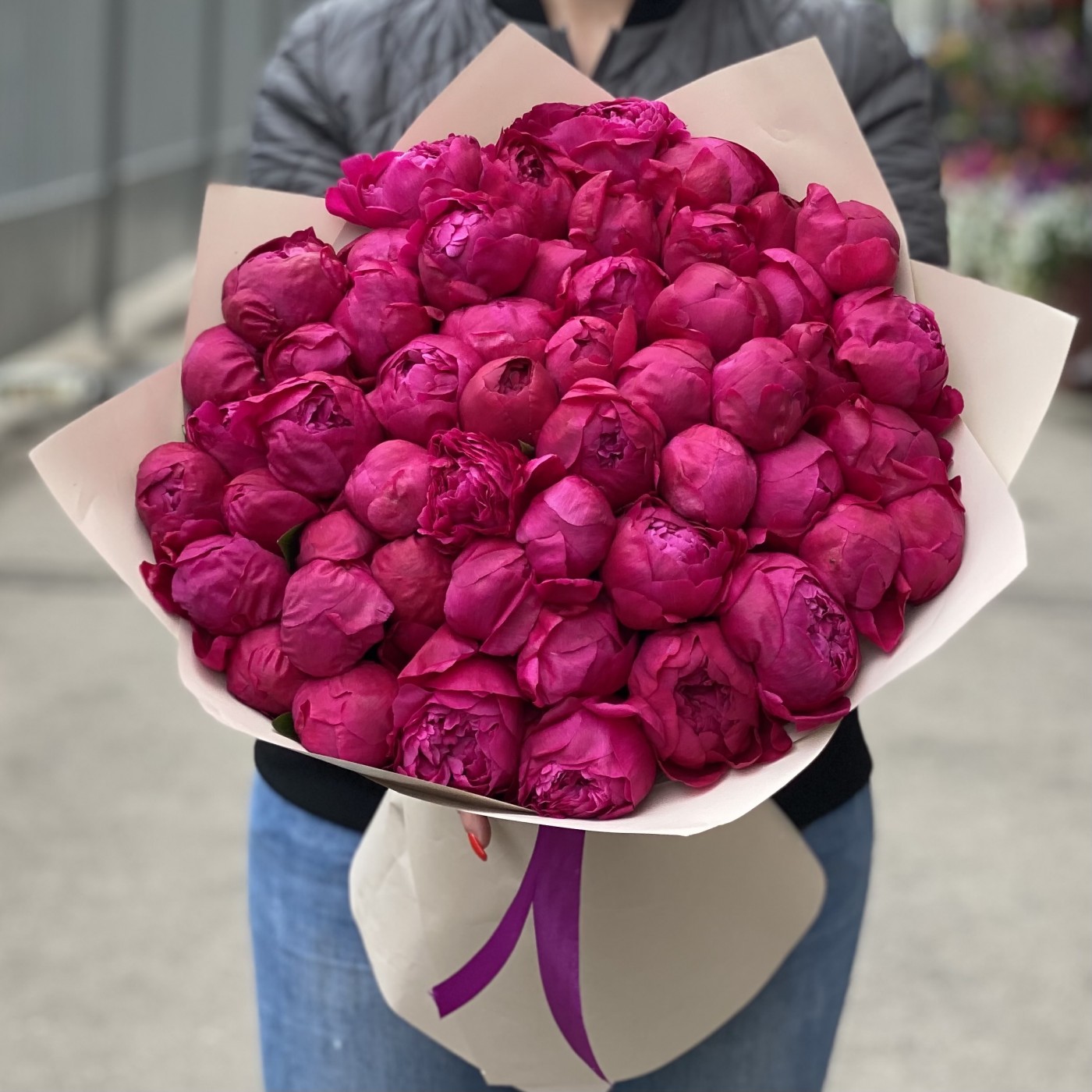 Фиолетовые пионы сорта Канзас — для самых искушенных любителей всего яркого и эффектного! Этот букет состоит из 51 свежесрезанного пиона. Бутоны плотные, упругие, они только-только начинают раскрываться, поэтому простоят максимально долго. Такой букет может стать роскошным подарком по особому поводу или просто так. Любители пионов точно оценят его по достоинству! По желанию заказчики букет может быть обернут в крафтовую бумагу или упакован в модную пленку.