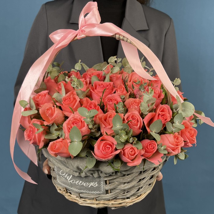 51 коралловая роза Эйс Пинк с эвкалиптом в корзине