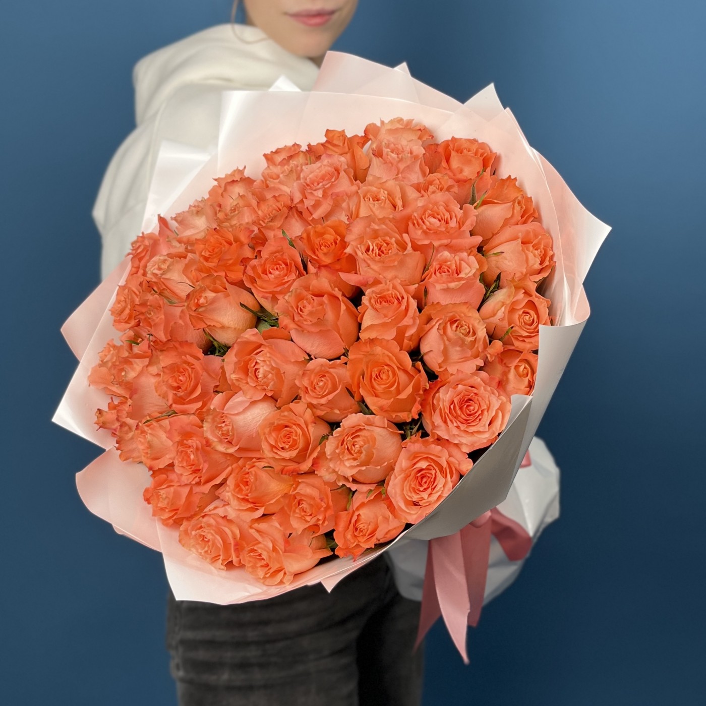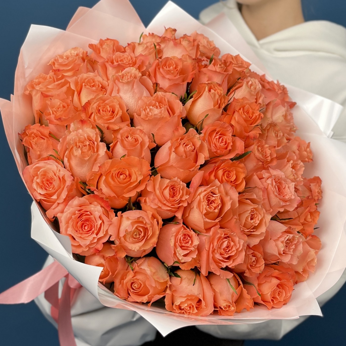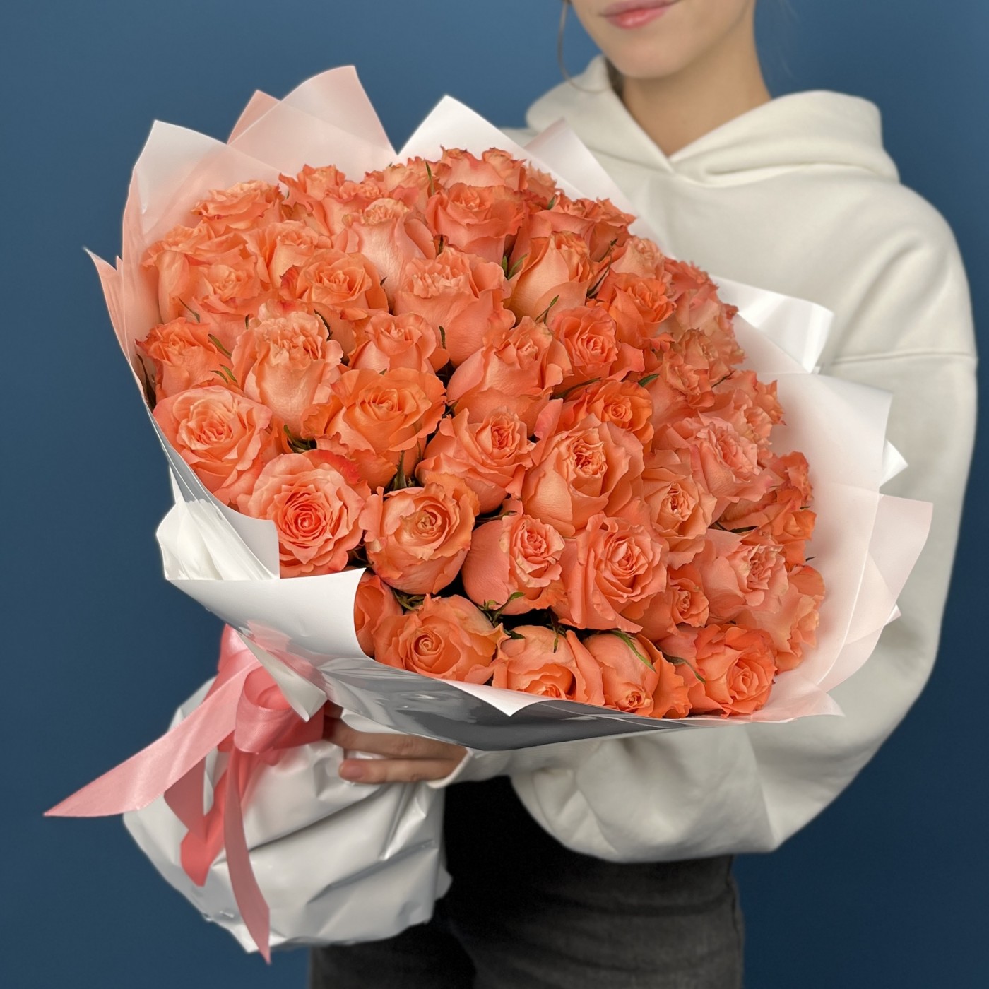 Красивый и эффектный букет из 51 коралловой розы сорта Юлечка с длиной стебля 40 см. Насыщенный коралловый оттенок и изящные бутоны делают эту композицию символом радости, тепла и нежности. Отличный выбор для яркого подарка или праздничного оформления.