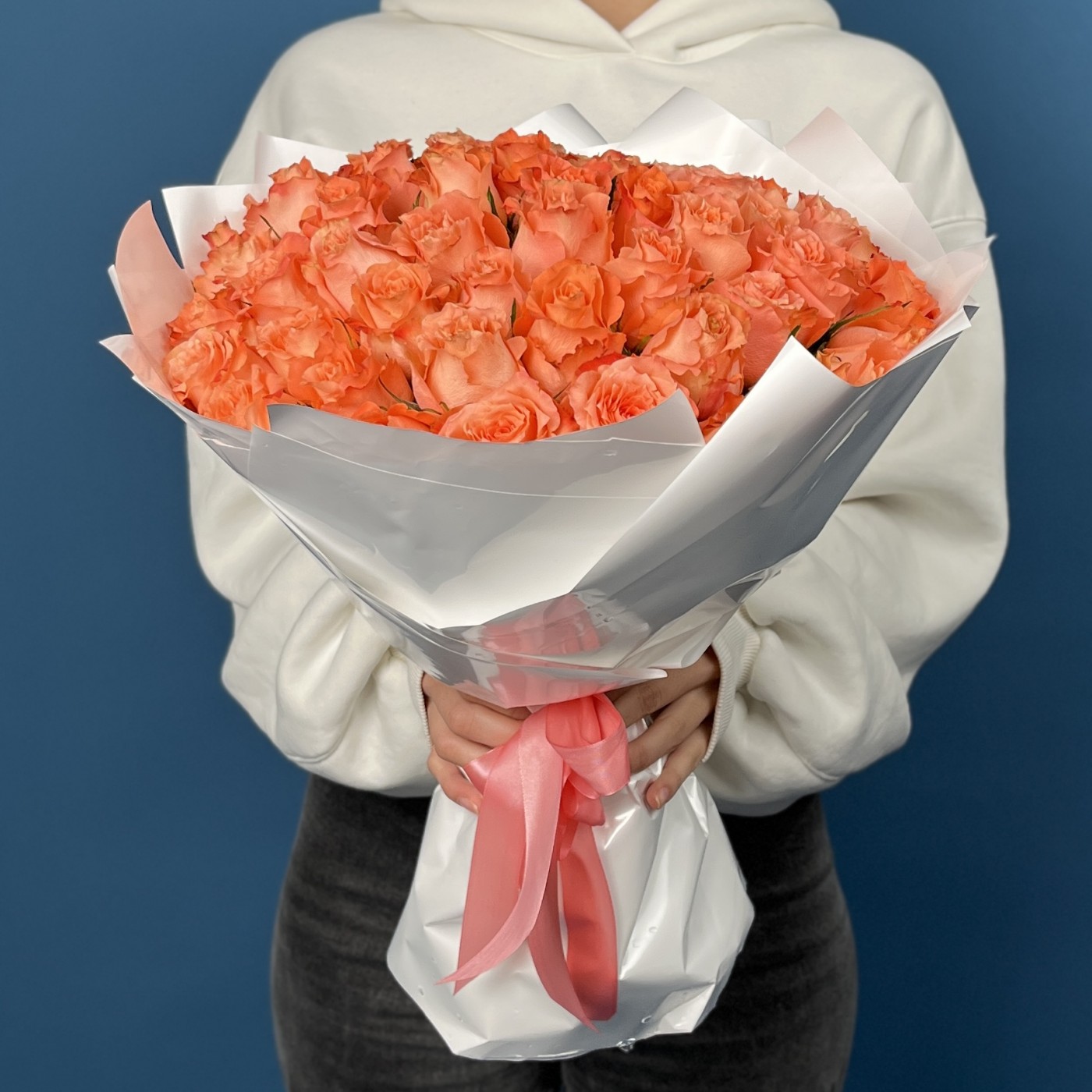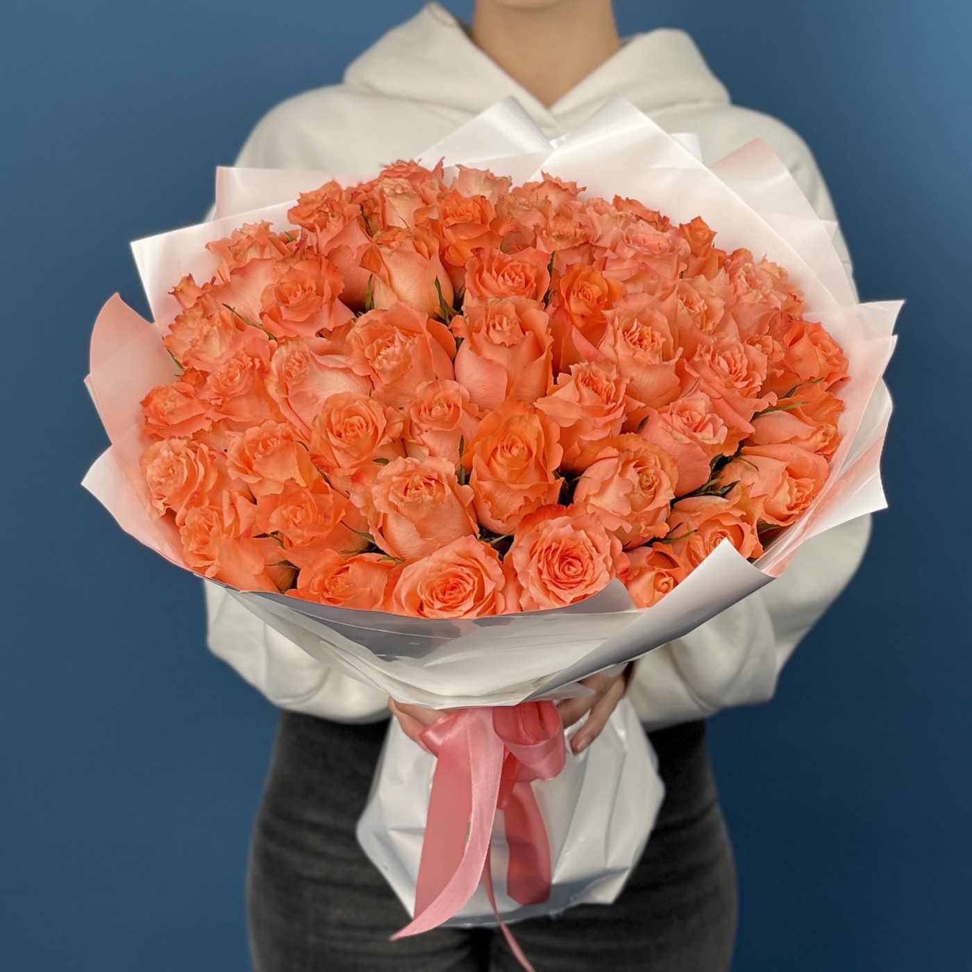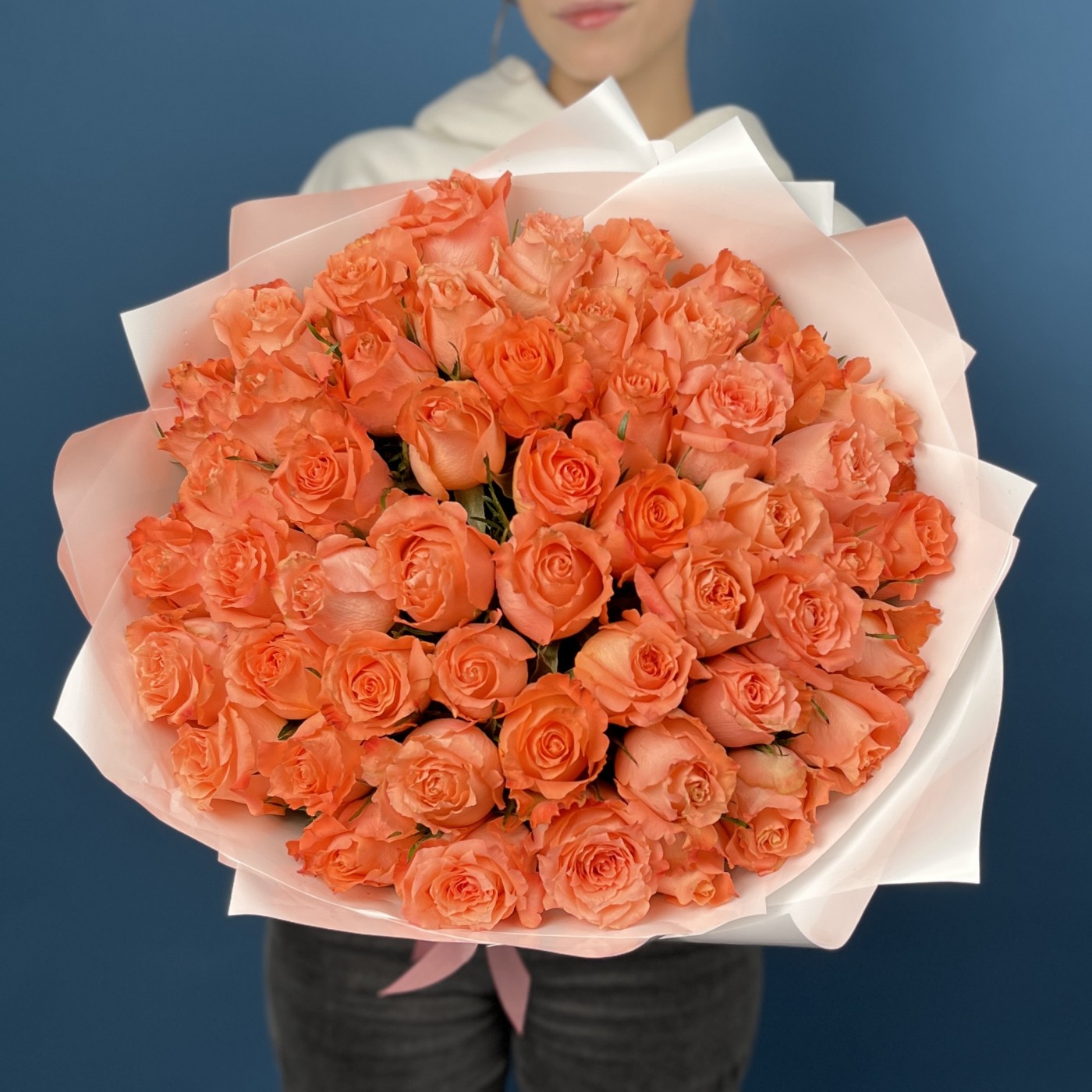 Красивый и эффектный букет из 51 коралловой розы сорта Юлечка с длиной стебля 40 см. Насыщенный коралловый оттенок и изящные бутоны делают эту композицию символом радости, тепла и нежности. Отличный выбор для яркого подарка или праздничного оформления.