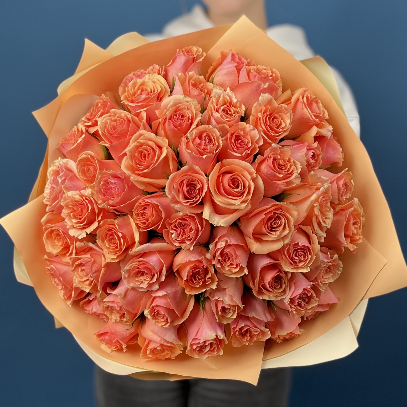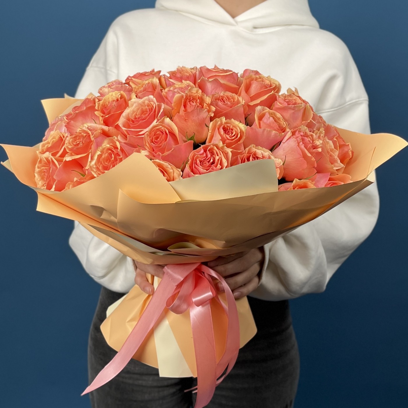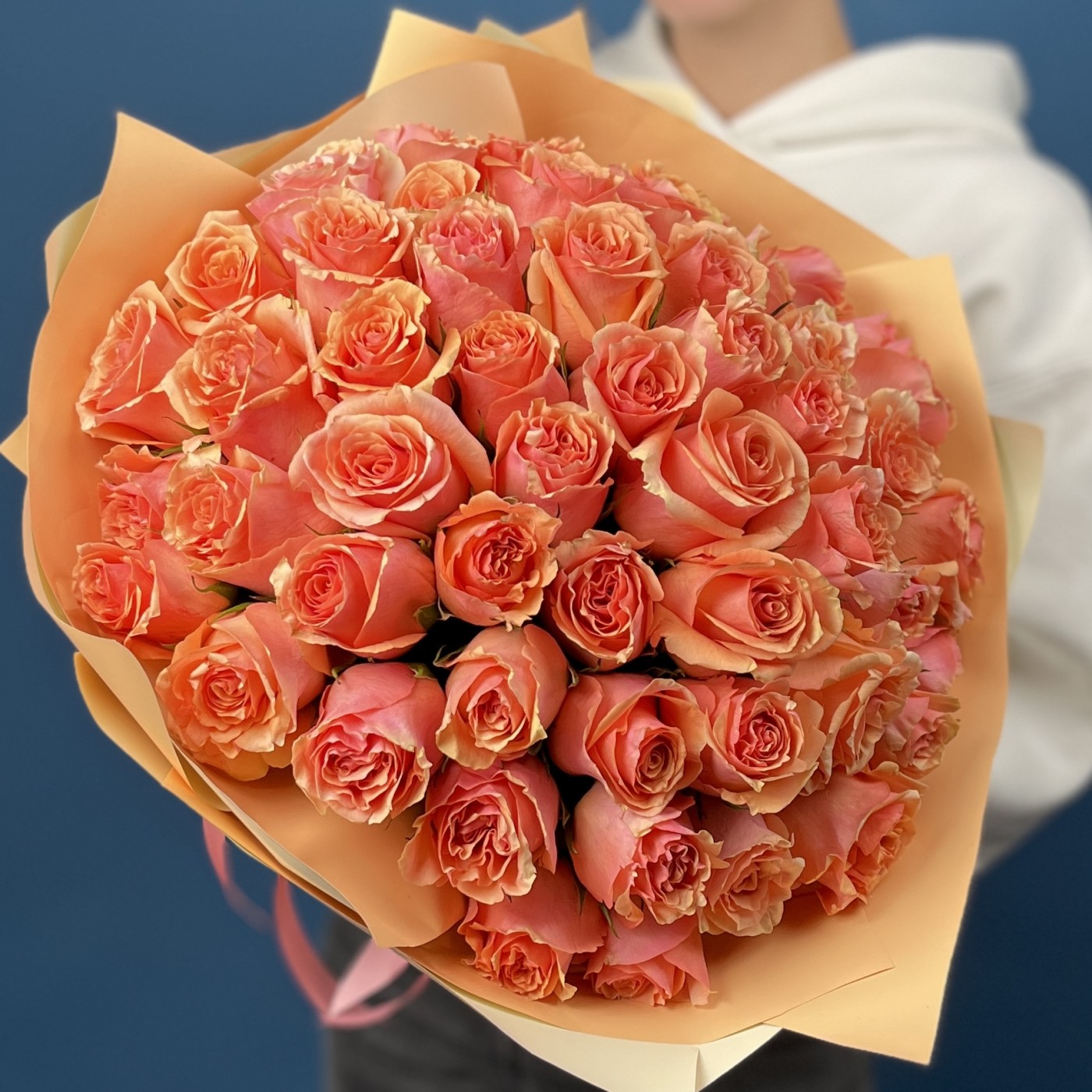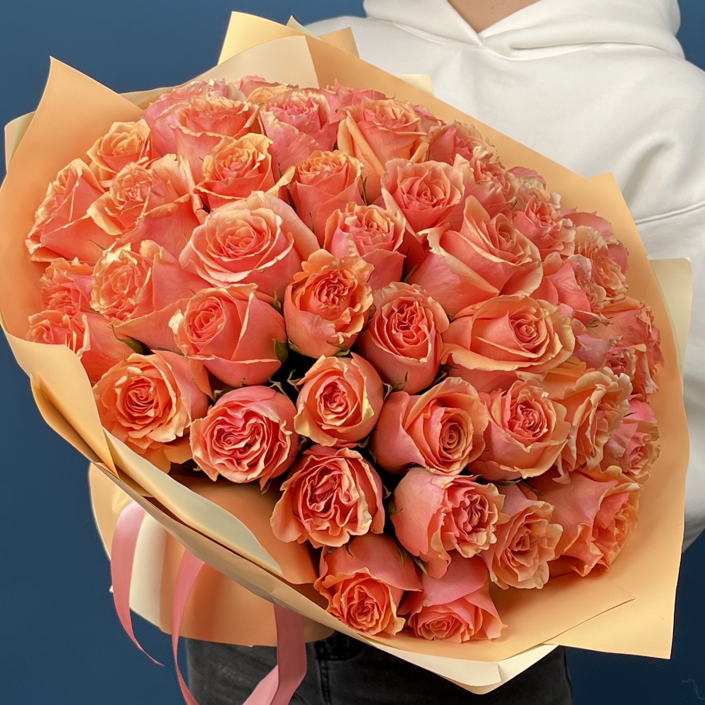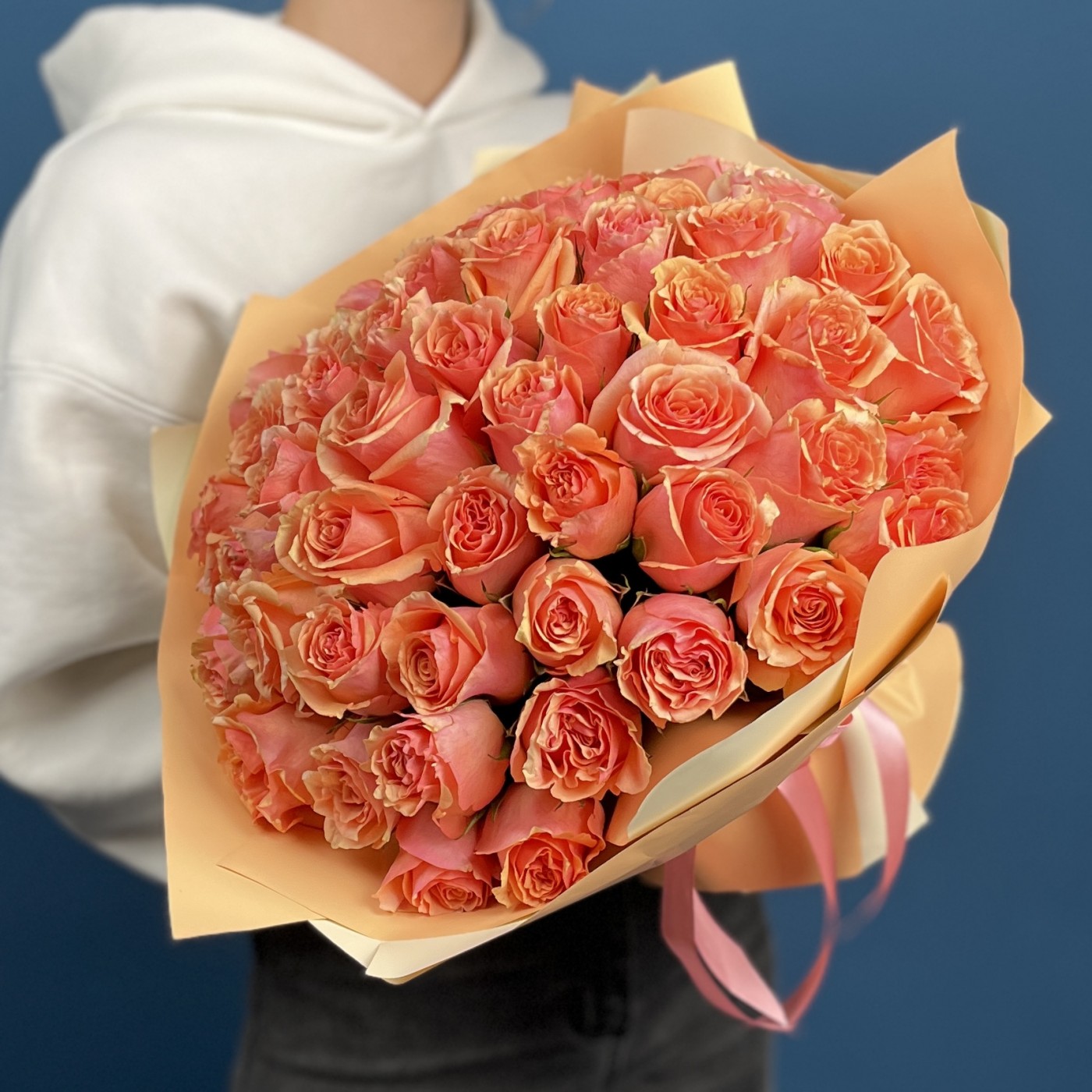 Яркий букет из 51 розы сорта Верона высотой 40 см. Нежные кораллово-кремовые оттенки создают эффектный и романтичный букет, подчеркнутый изысканностью. Идеален для торжественных мероприятий, праздничных событий или как великолепный подарок, выражающий тепло и заботу.
