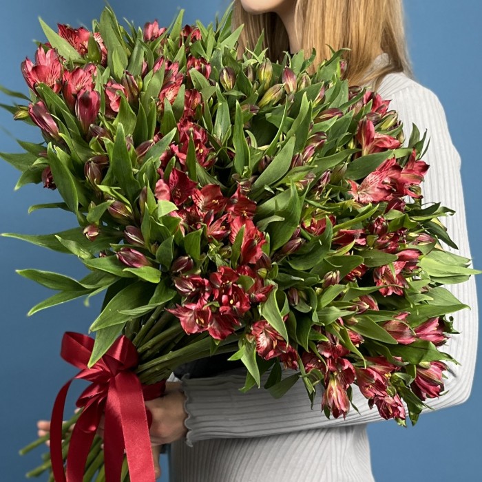 Яркий и насыщенный букет из 51 свежей альстромерии красного цвета. Эти изысканные цветы символизируют восхищение, страсть и уважение. Идеальный выбор для создания эффектного подарка или украшения особого события, привлекательно дополняя любой интерьер.