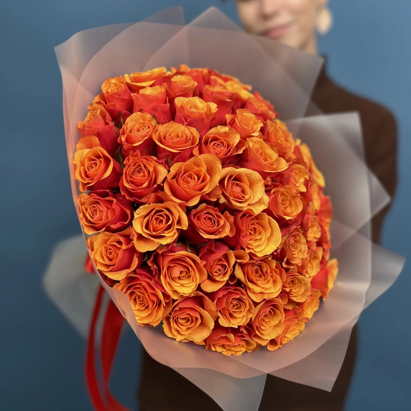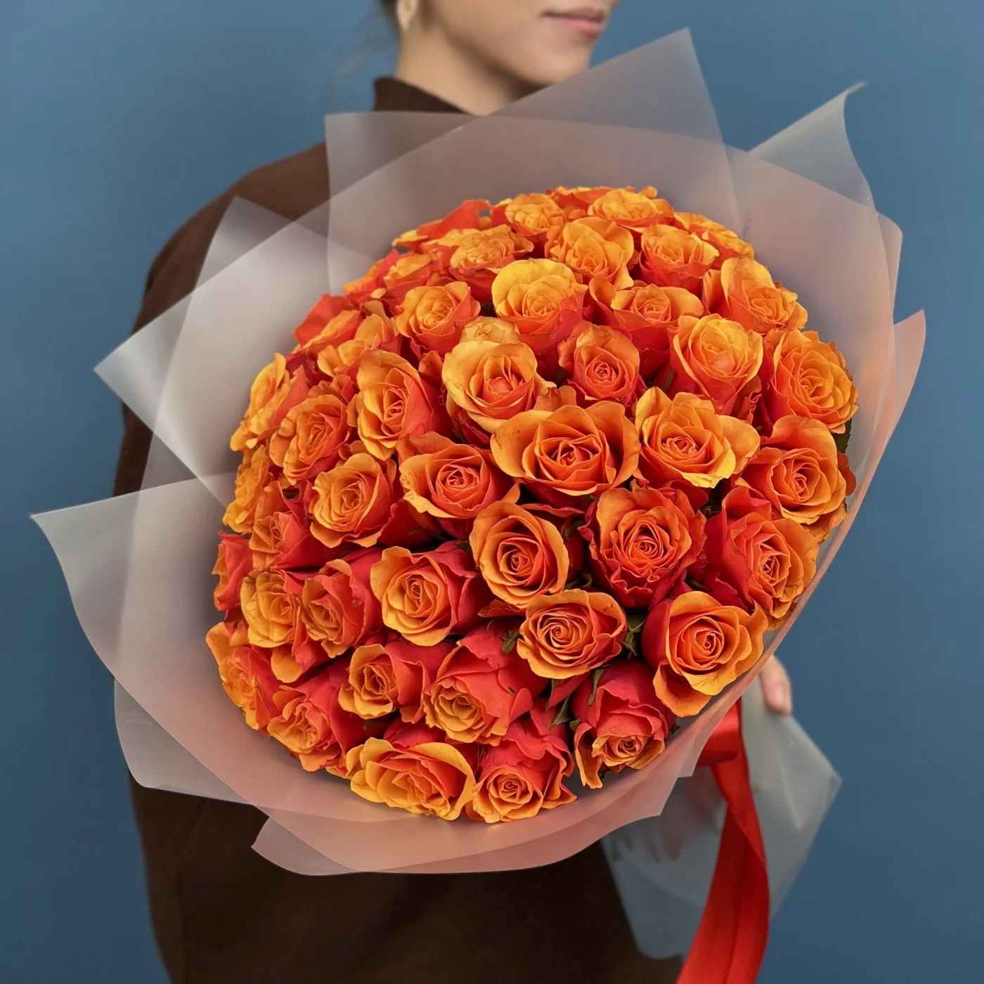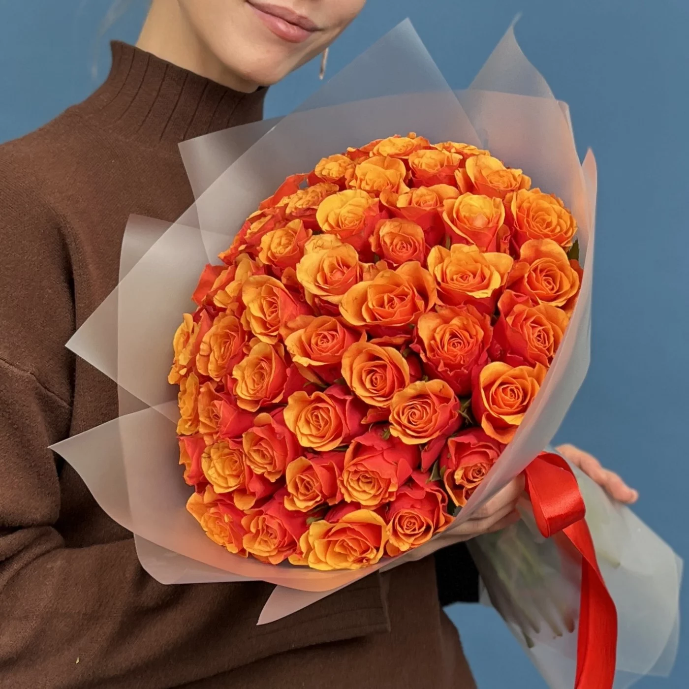 51 красно оранжевая роза Испания 40 см — это великолепное сочетание ярких красок и изысканной формы, которое станет настоящим центром внимания и подарит получателю море положительных эмоций и тепла.