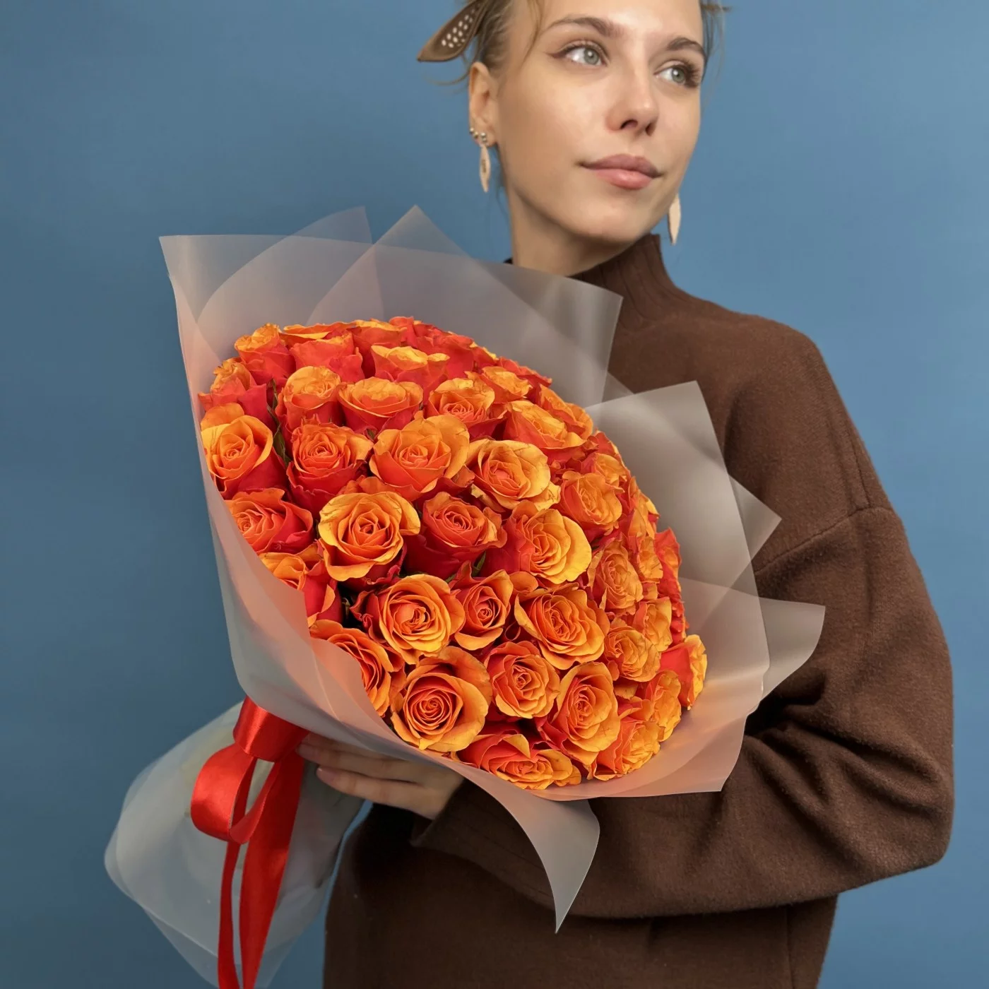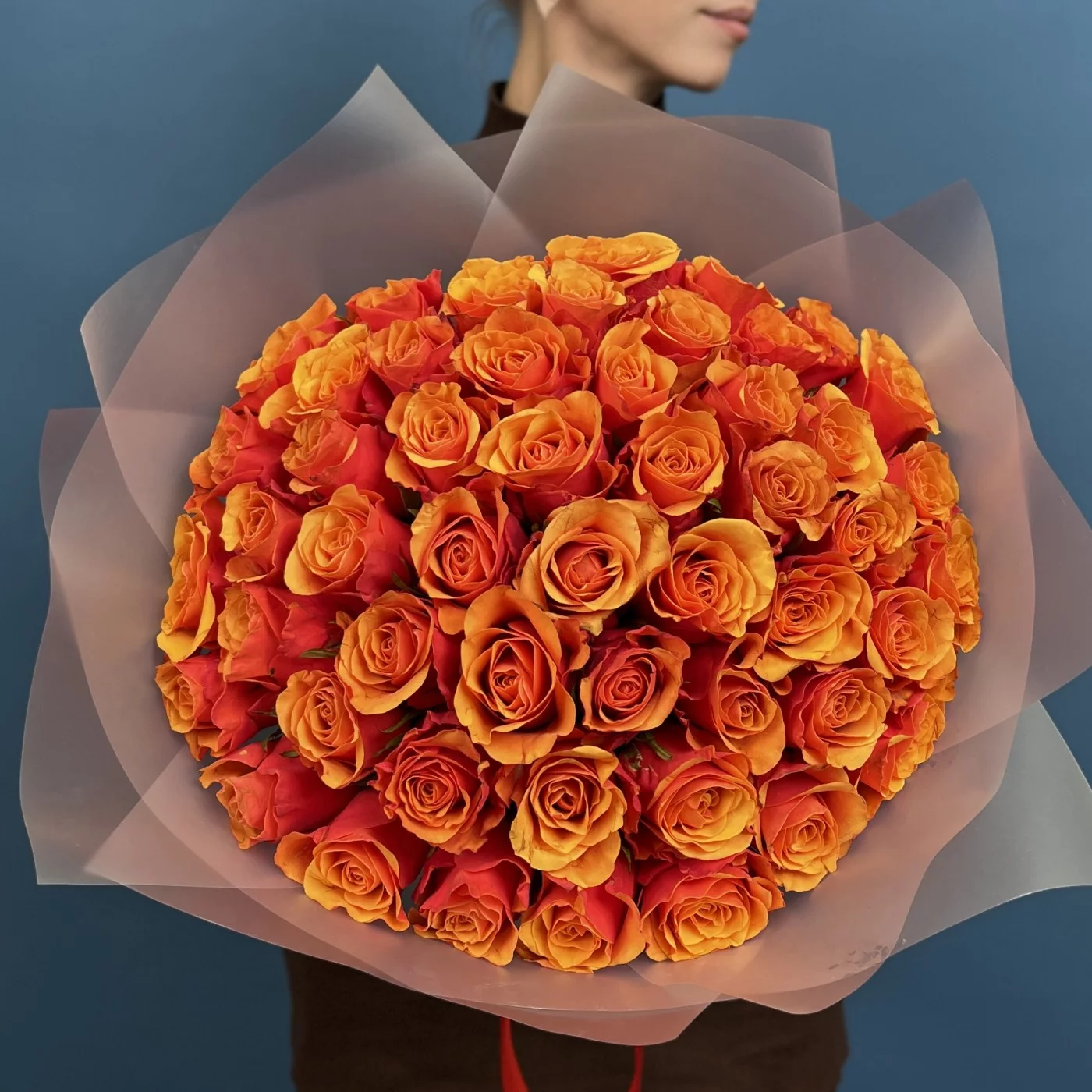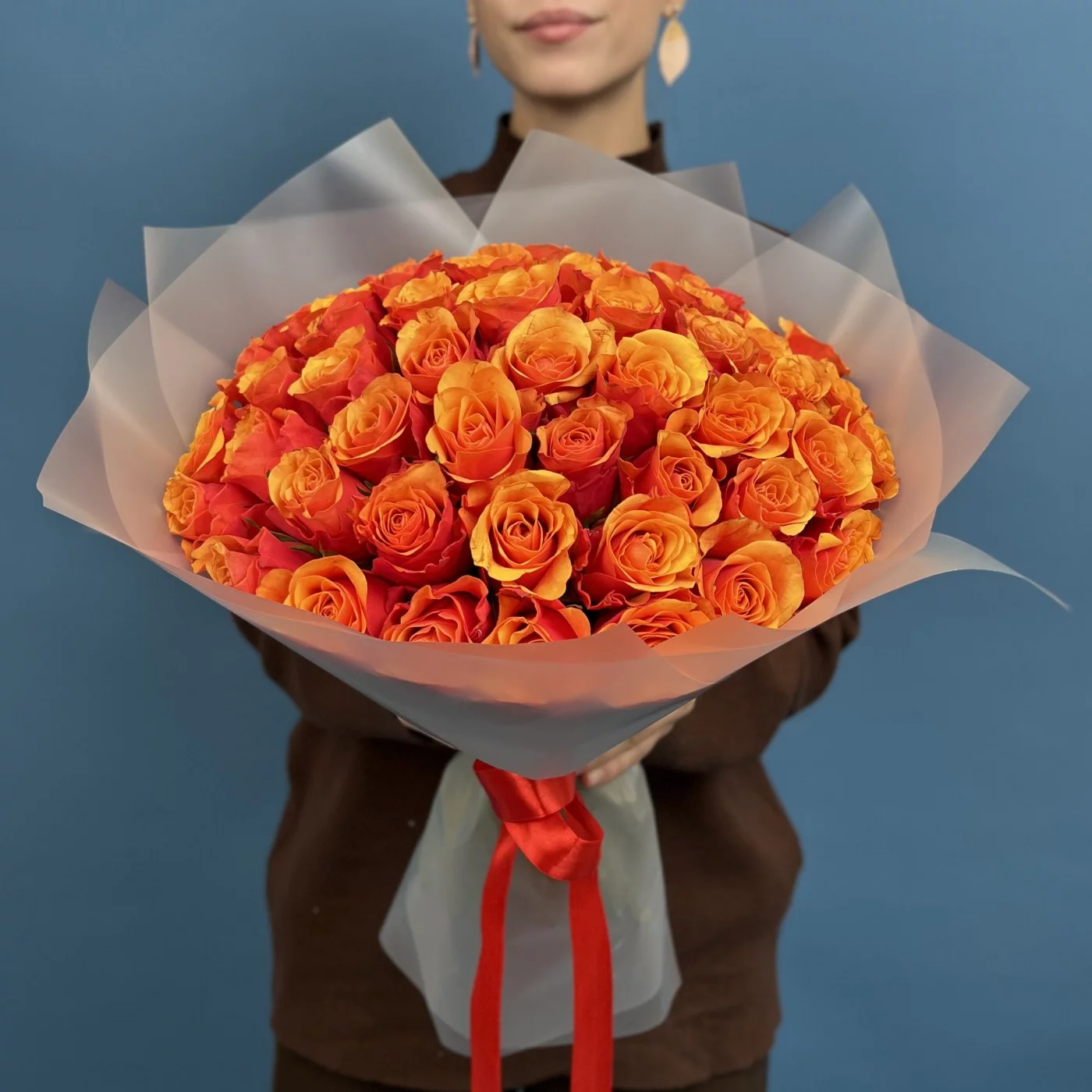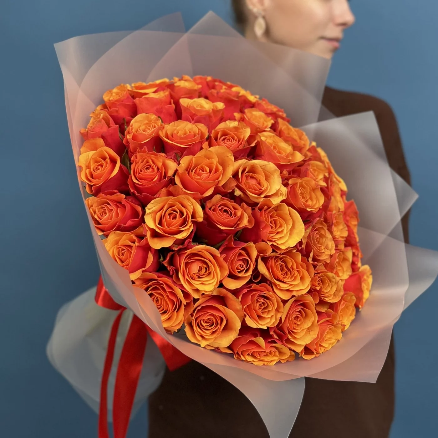 51 красно оранжевая роза Испания 40 см — это великолепное сочетание ярких красок и изысканной формы, которое станет настоящим центром внимания и подарит получателю море положительных эмоций и тепла.