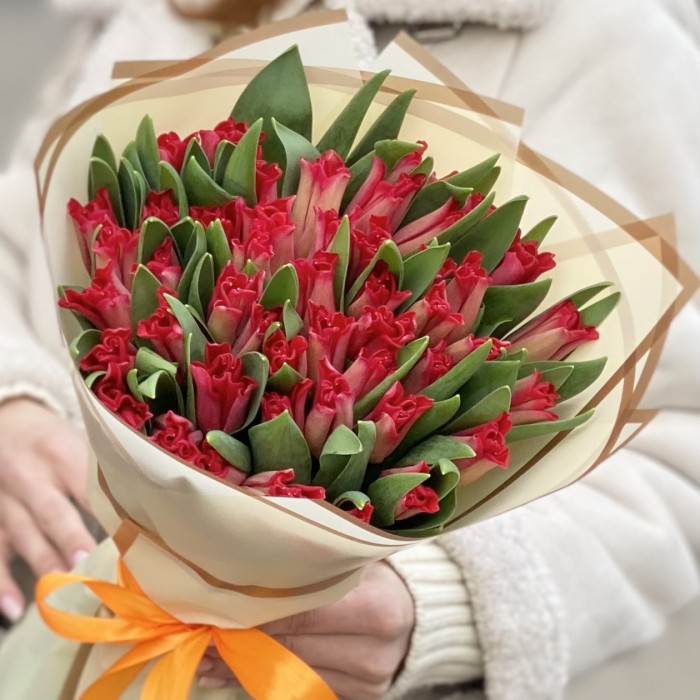 Букет из 51 красного тюльпана с кружевными лепестками - это прекрасный подарок ко дню рождения или на 8 марта. Букет можно дополнить стильной матовой или крафтовой упаковкой.