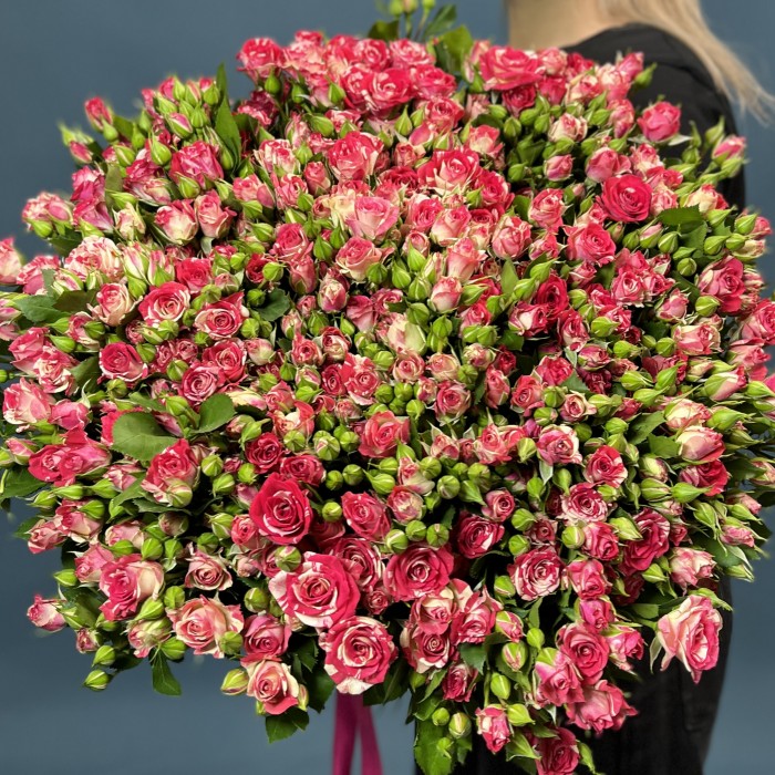 51 кустовая роза Файрворкс — это мощное визуальное впечатление. Малиново-белые лепестки подчеркивают выразительный контраст, множество бутонов на каждой стебле придают букету пышность и насыщенность.