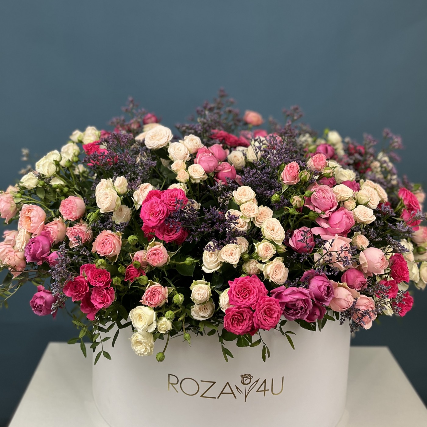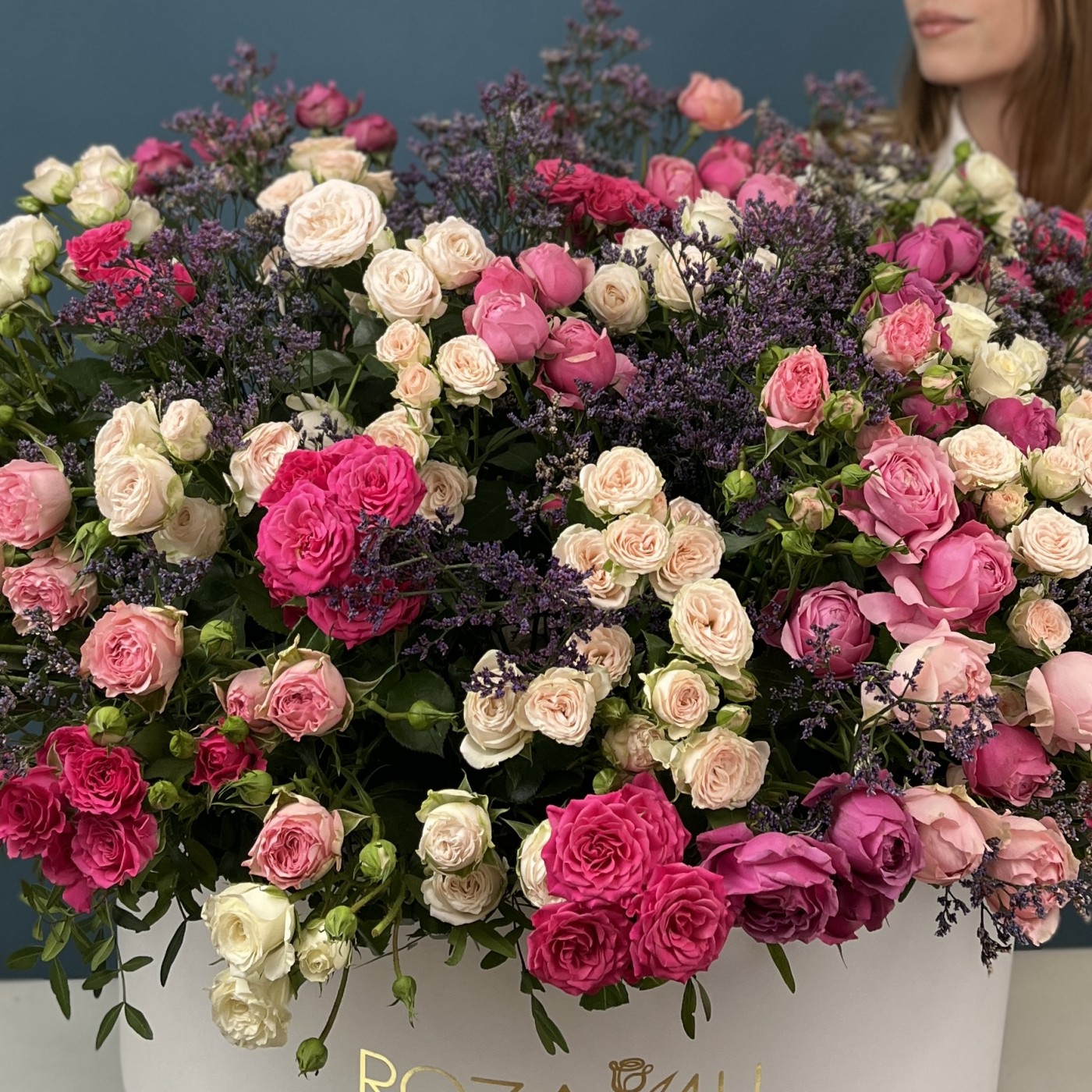 51 кустовая и пионовидная Роза с Лимониумом в коробке нежный MIX