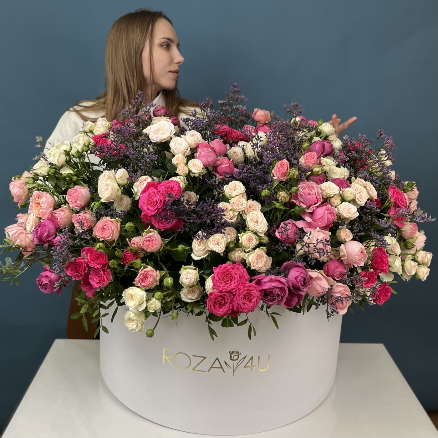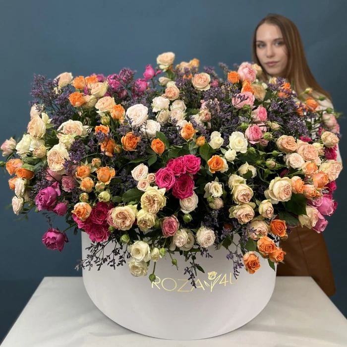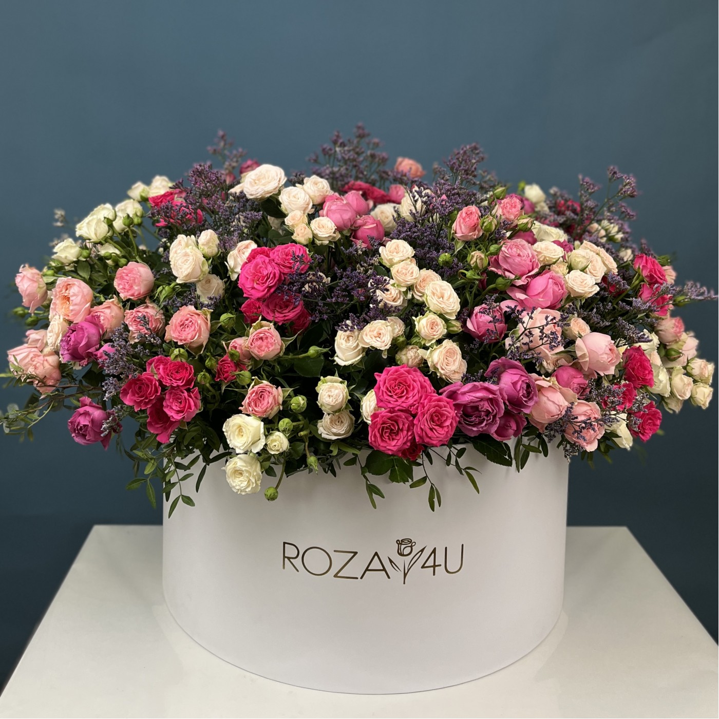 Композиция из кустовых и пионовидных роз с Лимониумом в коробке нежного MIX представляет собой изысканное сочетание цветов, которое привносит в атмосферу свежесть и радость. В этом букете собраны розы в нежных пастельных тонах, таких как розовый, кремовый и белый, которые гармонично дополняются легкими и воздушными соцветиями Лимониума. Этот элемент добавляет яркие акценты и создает эффектный контраст, подчеркивая красоту каждой розы.