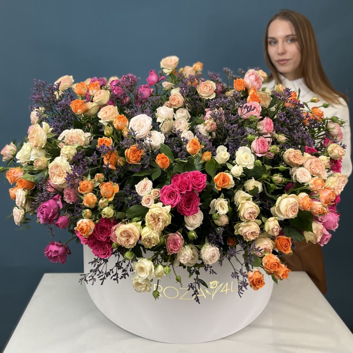 51 кустовая и пионовидная Роза с Лимониумом в коробке яркий MIX